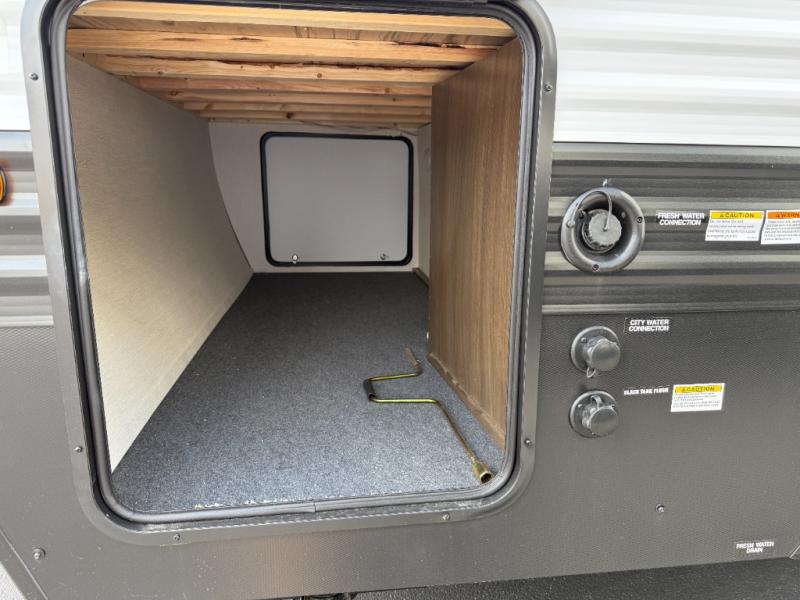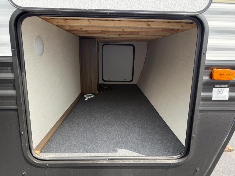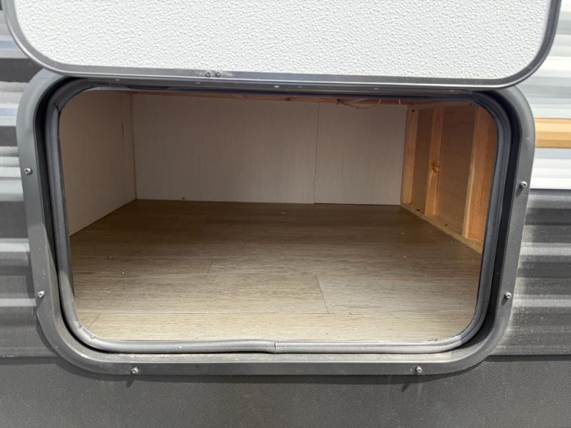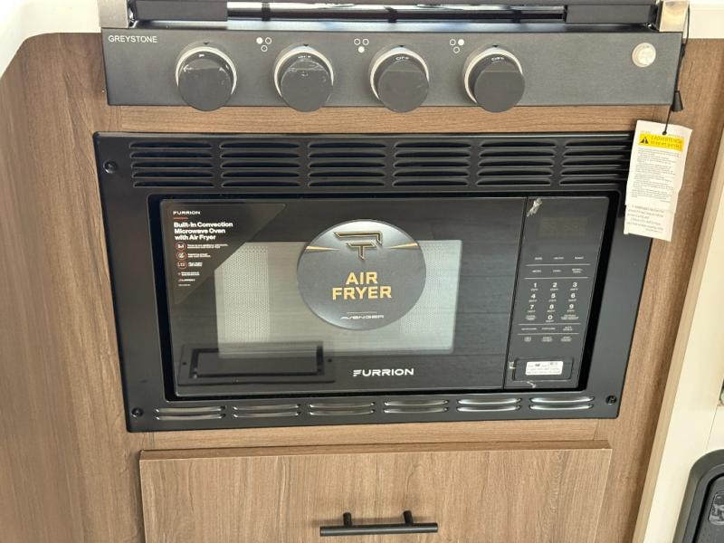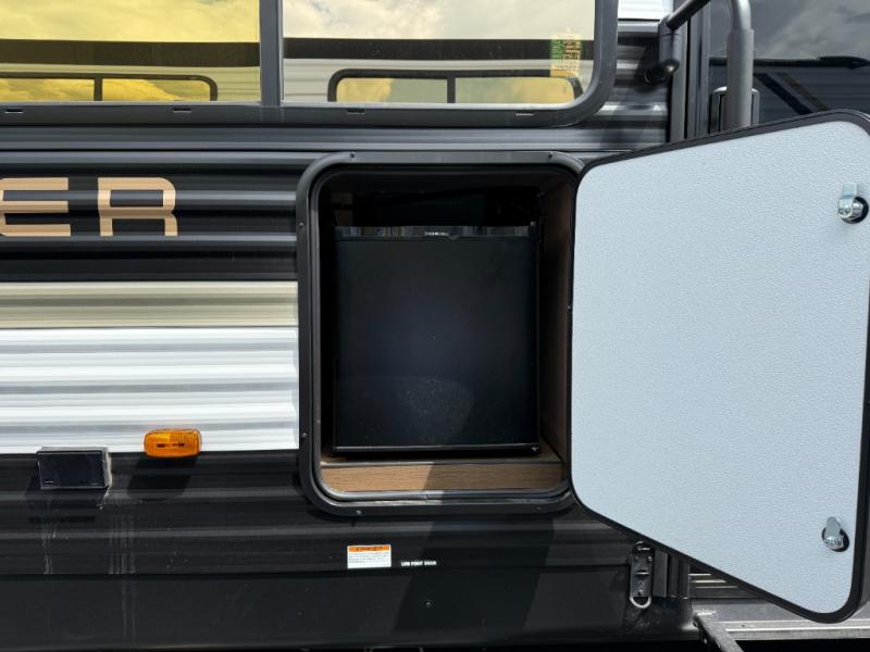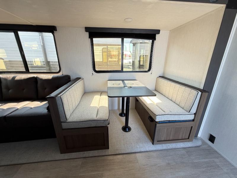 You'll appreciate the added space in this travel trailer thanks to the large slide out! The booth dinette and sofa are found here, and there is a moveable storage ottoman for extra blankets or board games. You'll have your own space up front in the private bedroom, complete with a camp king bed and storage for your things, while your guests take the double-size bunk beds towards the back. The chef of your group will find a three burner cooktop and a built-in convection microwave with an air fryer to cook meals, plus there is a 12V refrigerator and large hidden pantry for food storage. This unit also includes a power awning outdoors and an outside refrigerator to keep cold drinks close by.