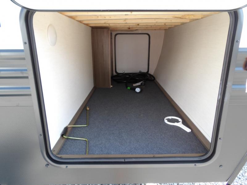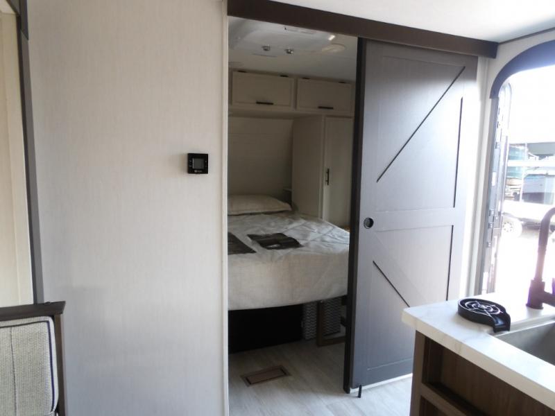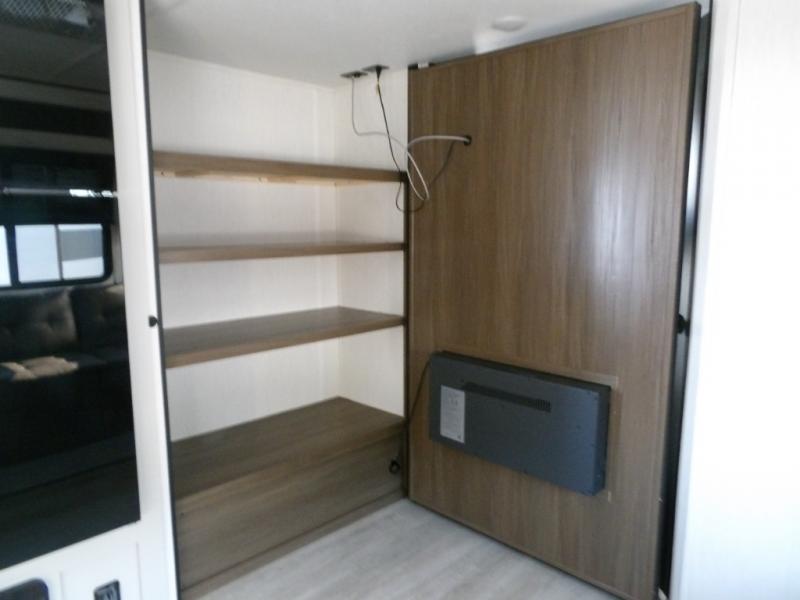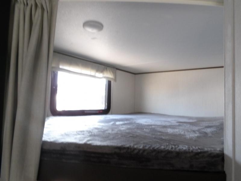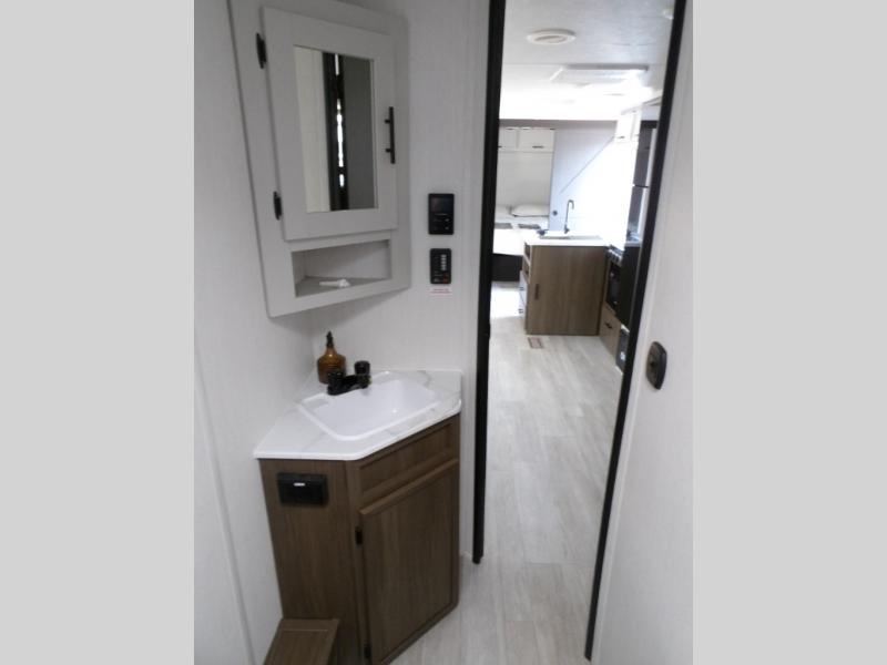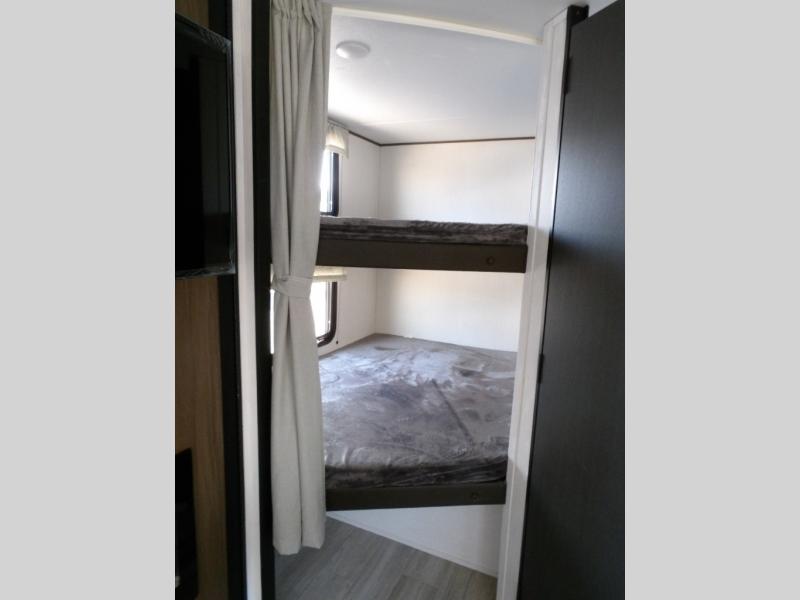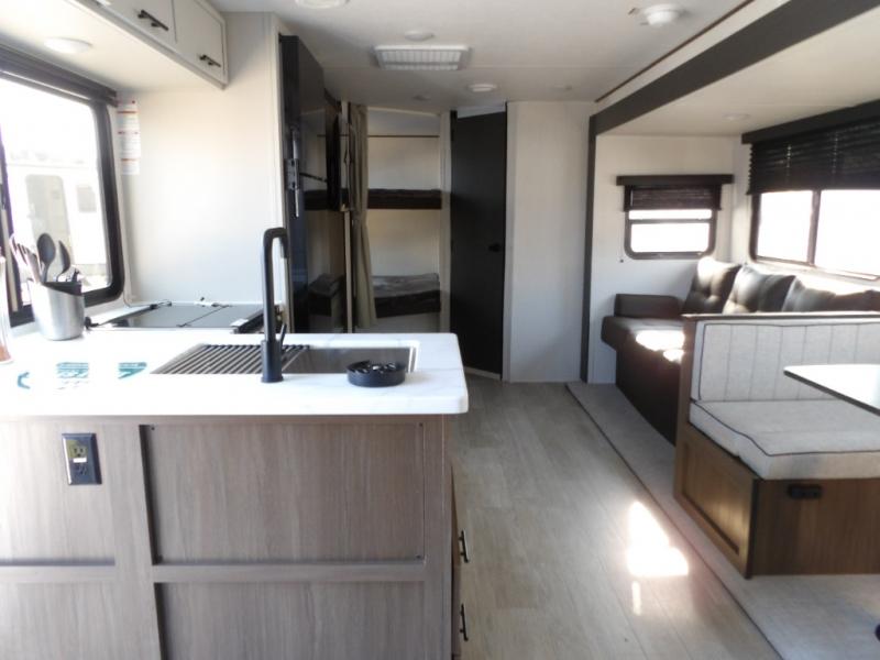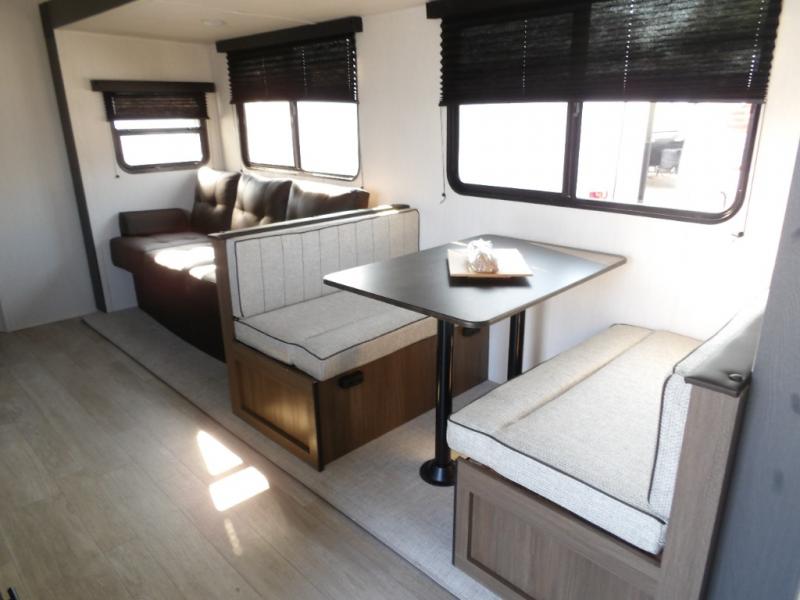 You'll appreciate the added space in this travel trailer thanks to the large slide out! The booth dinette and sofa are found here, and there is a moveable storage ottoman for extra blankets or board games. You'll have your own space up front in the private bedroom, complete with a camp king bed and storage for your things, while your guests take the double-size bunk beds towards the back. The chef of your group will find a three burner cooktop and a built-in convection microwave with an air fryer to cook meals, plus there is a 12V refrigerator and large hidden pantry for food storage. This unit also includes a power awning outdoors and an outside refrigerator to keep cold drinks close by.