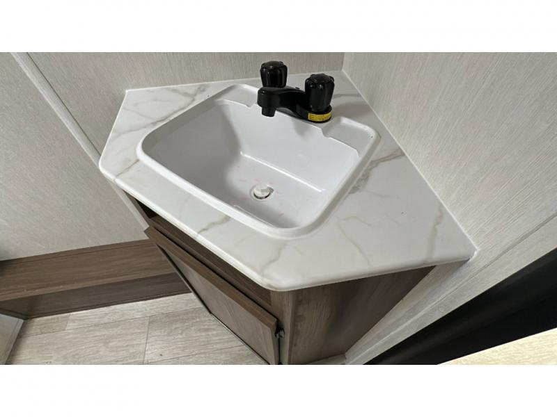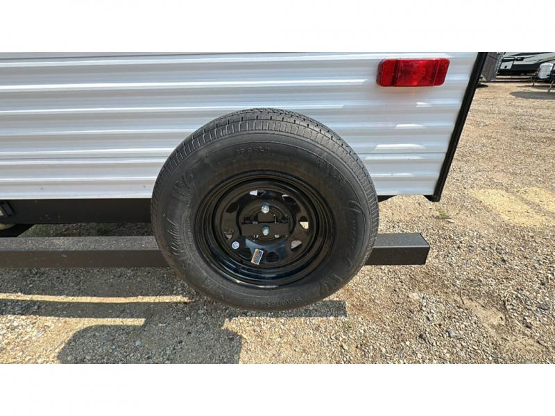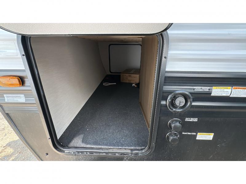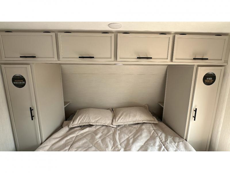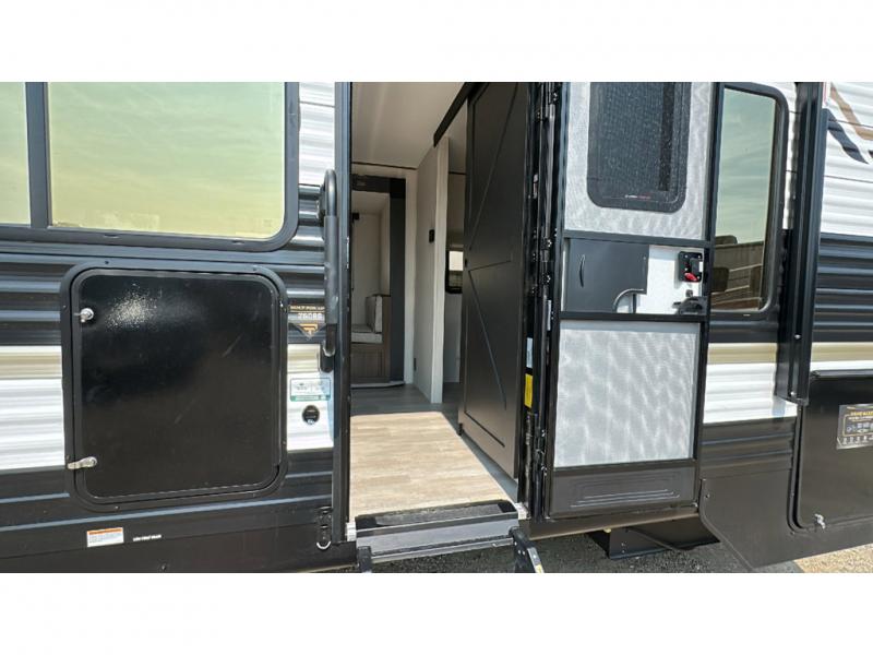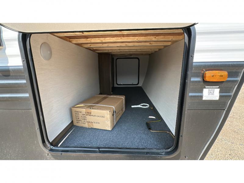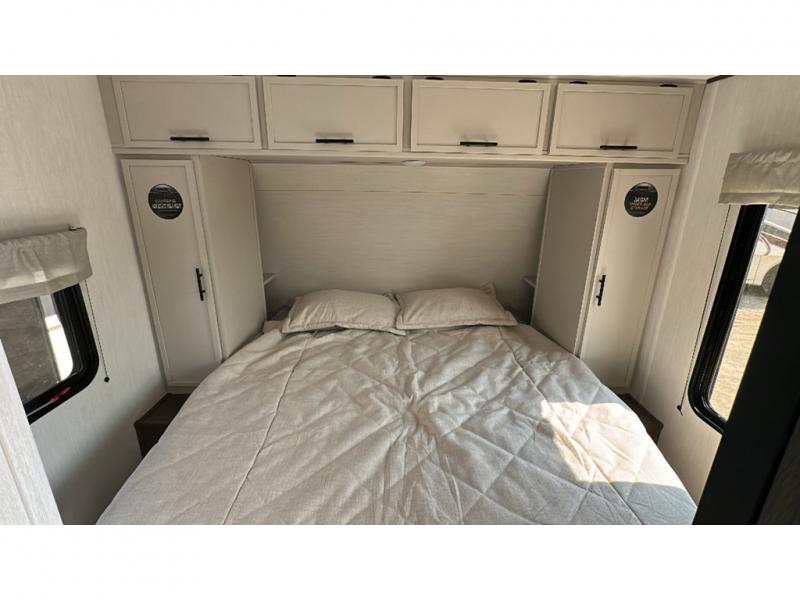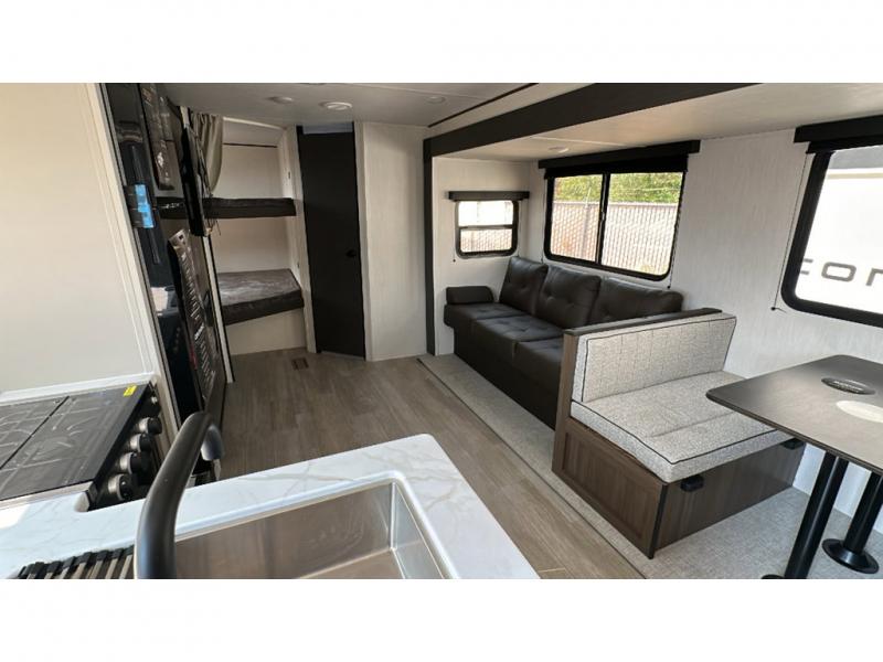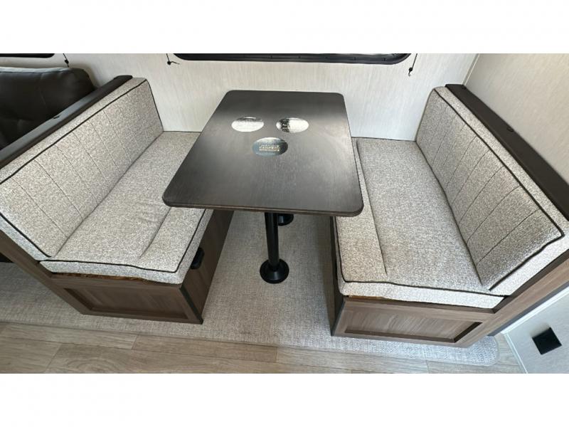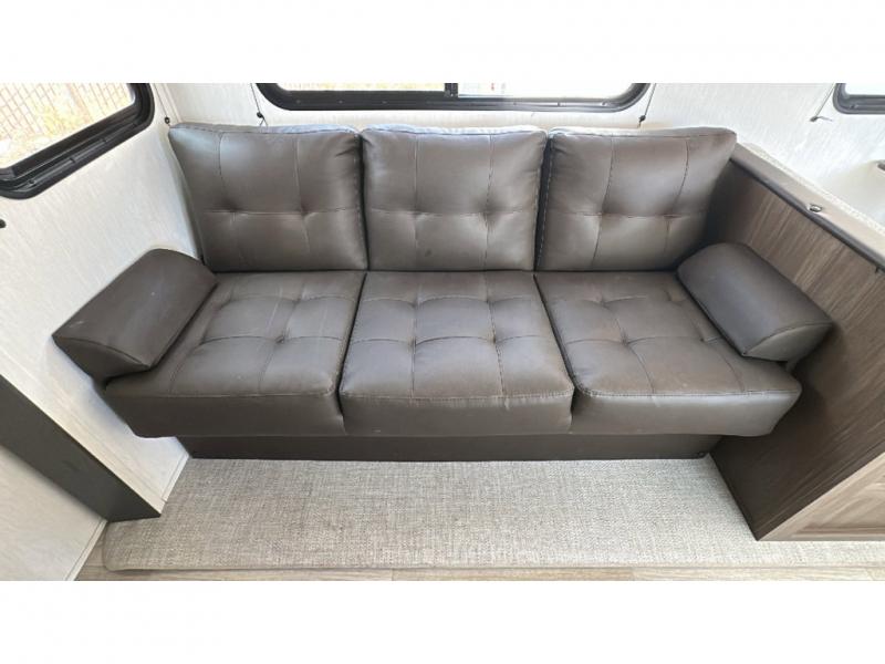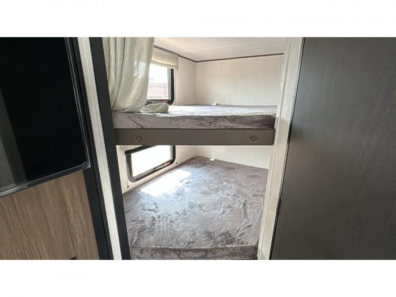You'll appreciate the added space in this travel trailer thanks to the large slide out! The booth dinette and sofa are found here, and there is a moveable storage ottoman for extra blankets or board games. You'll have your own space up front in the private bedroom, complete with a camp king bed and storage for your things, while your guests take the double-size bunk beds towards the back. The chef of your group will find a three burner cooktop and a built-in convection microwave with an air fryer to cook meals, plus there is a 12V refrigerator and large hidden pantry for food storage. This unit also includes a power awning outdoors and an outside refrigerator to keep cold drinks close by.