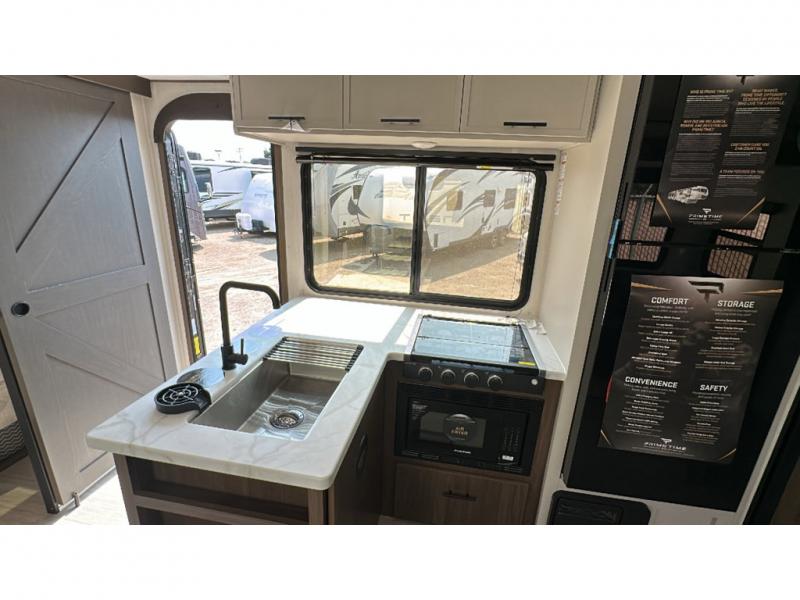 With any Avenger travel trailer by Prime Time RV, you will find innovation, a solid build, and comfort at every turn. Each model is built with Tuff Coat on the exterior metal, a fully enclosed underbelly, and a PVC roof membrane to help extend the life of your trailer. You will also find automotive name badging on the exterior, along with an exterior shower, front rail LED light strips, plus an XL padded entry grab handle to name a few conveniences. There are plenty of storage spaces inside, as well as Congoleum flooring and woven PVC marine grade slide out flooring, a designer shower surround, and seamless pressed countertops. You are sure to appreciate the onboard water filtration system, tankless water heater, plus 30K BTU furnace and 15K ducted A/C to help keep you comfortable.