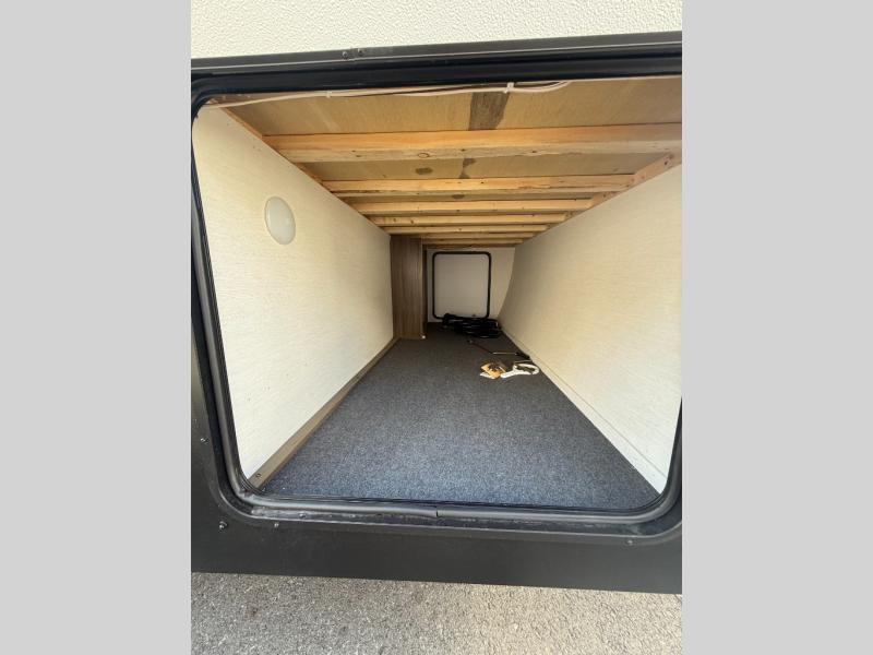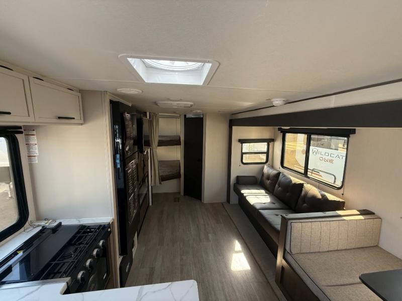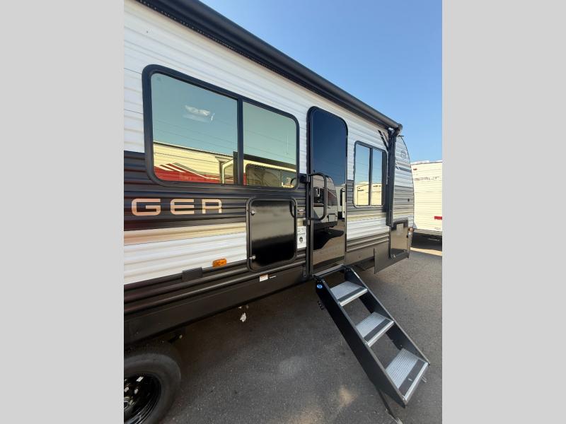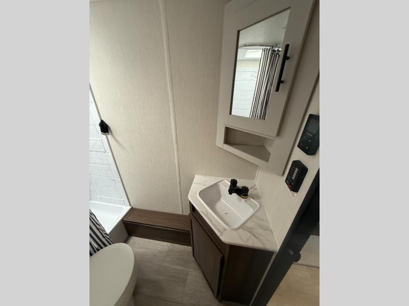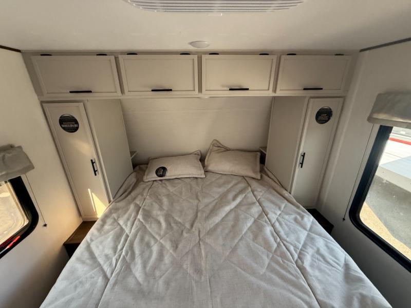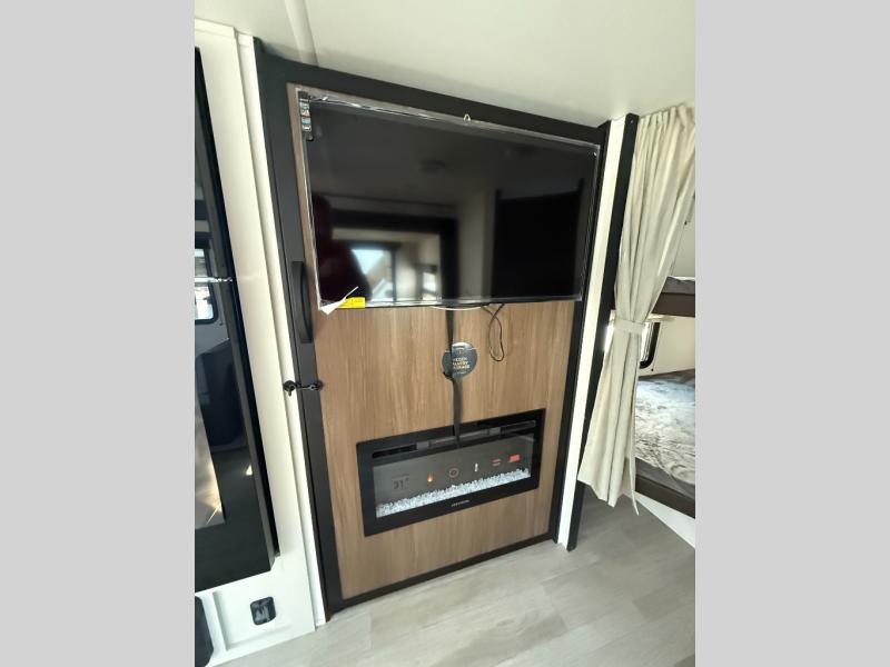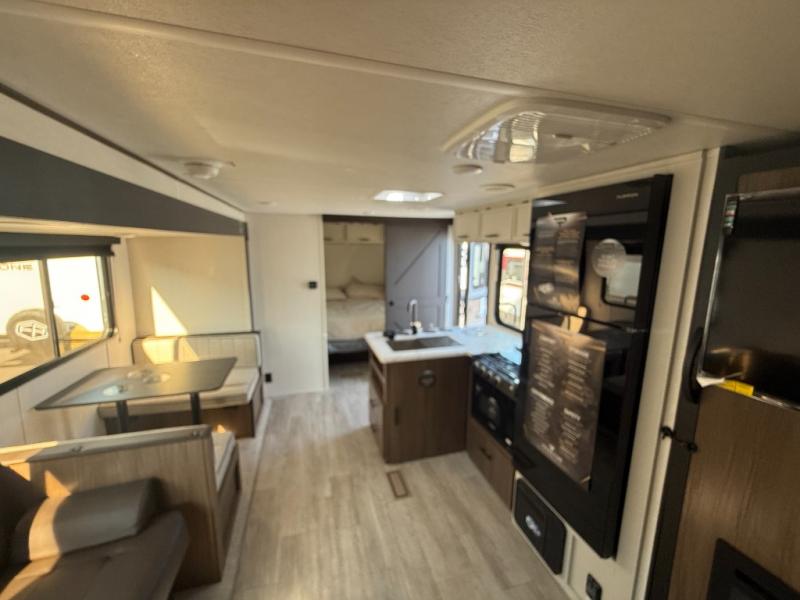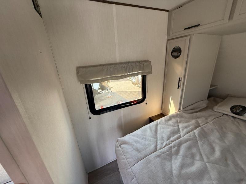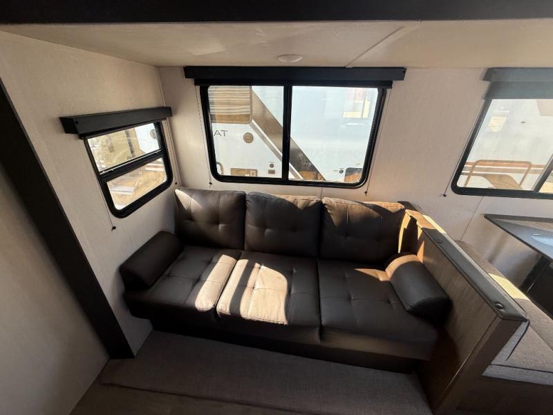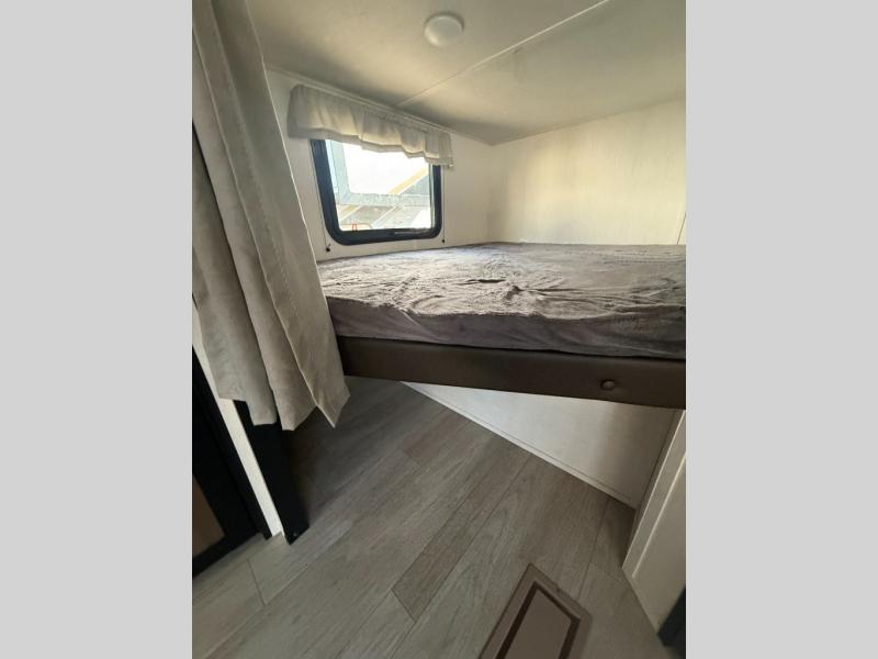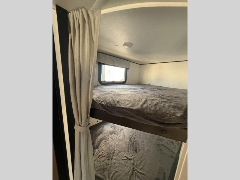 You'll appreciate the added space in this travel trailer thanks to the large slide out! The booth dinette and sofa are found here, and there is a moveable storage ottoman for extra blankets or board games. You'll have your own space up front in the private bedroom, complete with a camp king bed and storage for your things, while your guests take the double-size bunk beds towards the back. The chef of your group will find a three burner cooktop and a built-in convection microwave with an air fryer to cook meals, plus there is a 12V refrigerator and large hidden pantry for food storage. This unit also includes a power awning outdoors and an outside refrigerator to keep cold drinks close by.