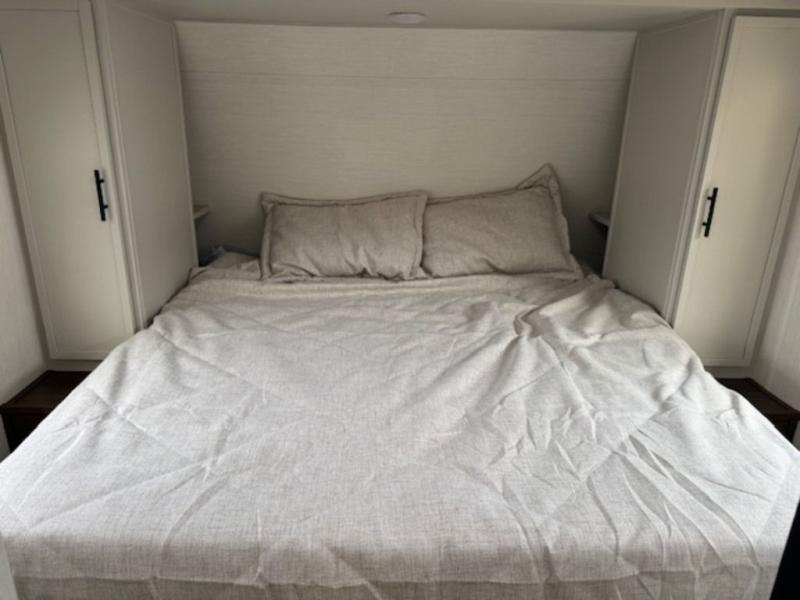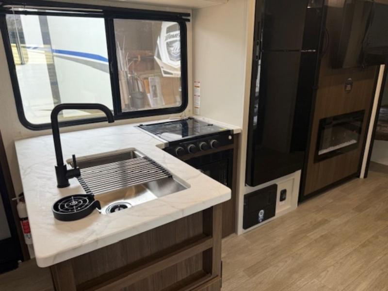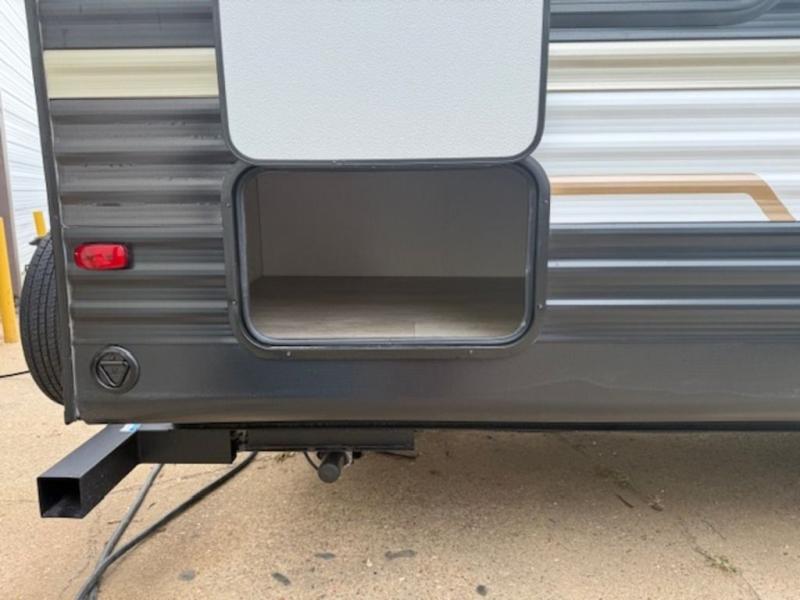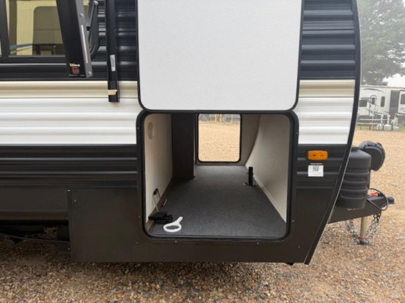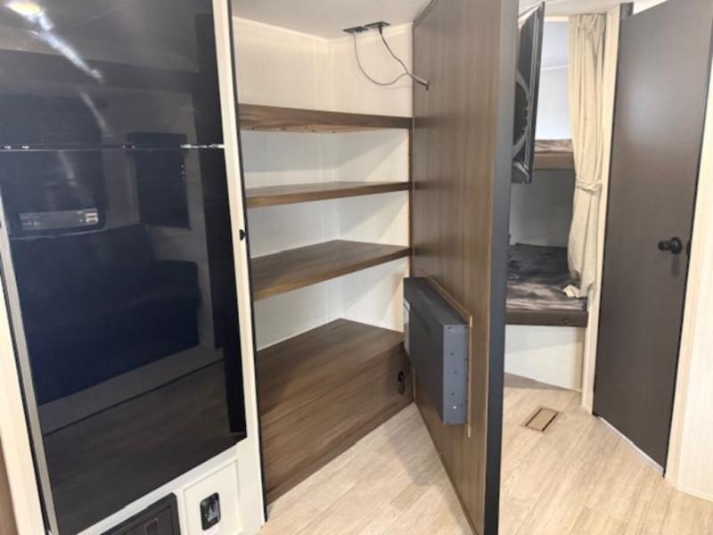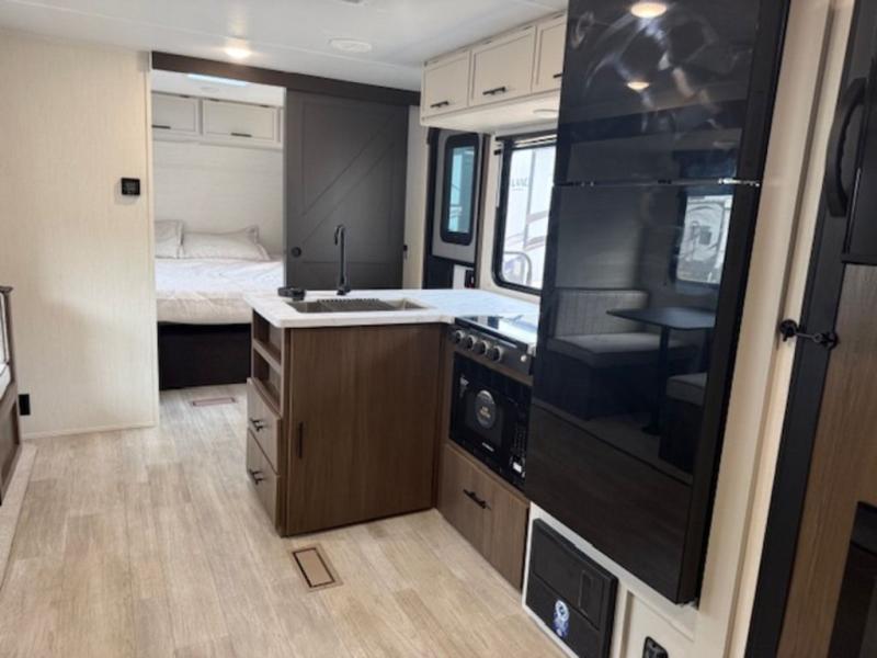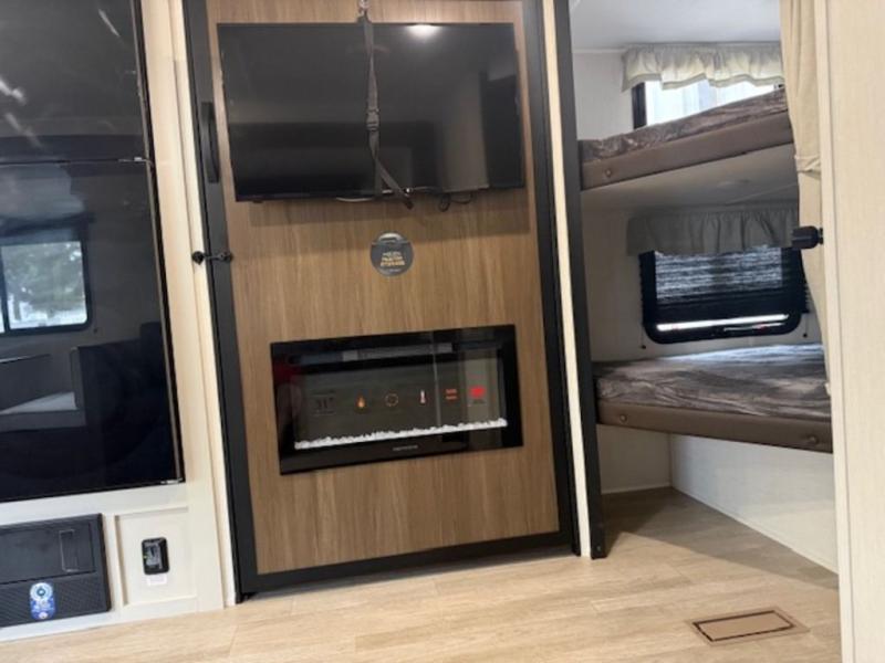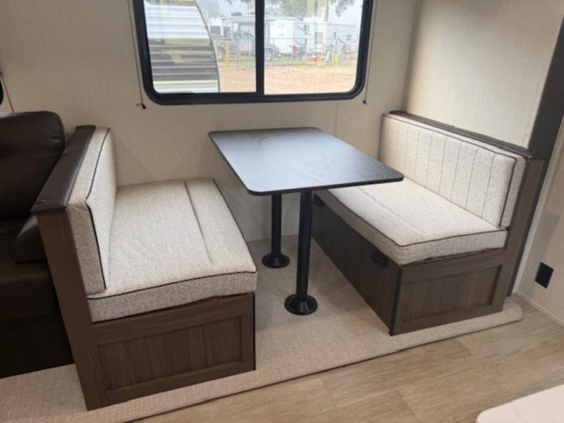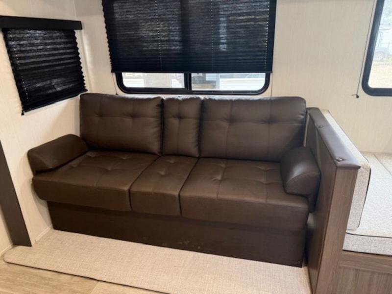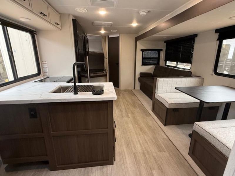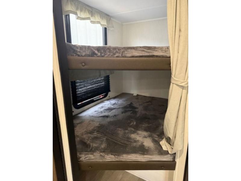 You'll appreciate the added space in this travel trailer thanks to the large slide out! The booth dinette and sofa are found here, and there is a moveable storage ottoman for extra blankets or board games. You'll have your own space up front in the private bedroom, complete with a camp king bed and storage for your things, while your guests take the double-size bunk beds towards the back. The chef of your group will find a three-burner cooktop and a built-in convection microwave with an air fryer to cook meals, plus there is a 12V refrigerator and large hidden pantry for food storage. This unit also includes a power awning outdoors and an outside refrigerator to keep cold drinks close by.