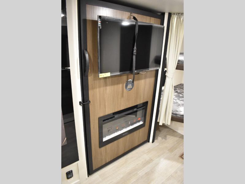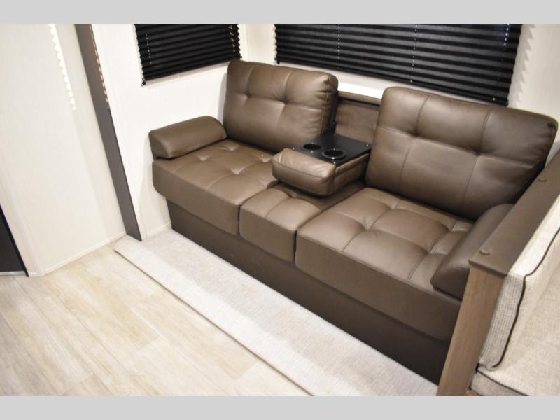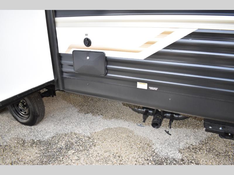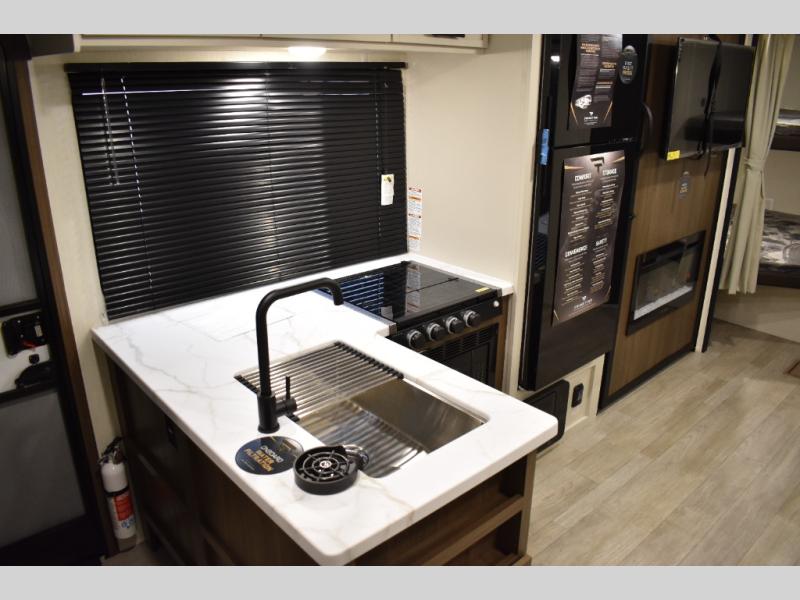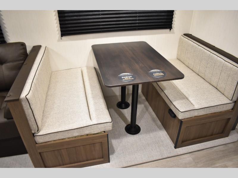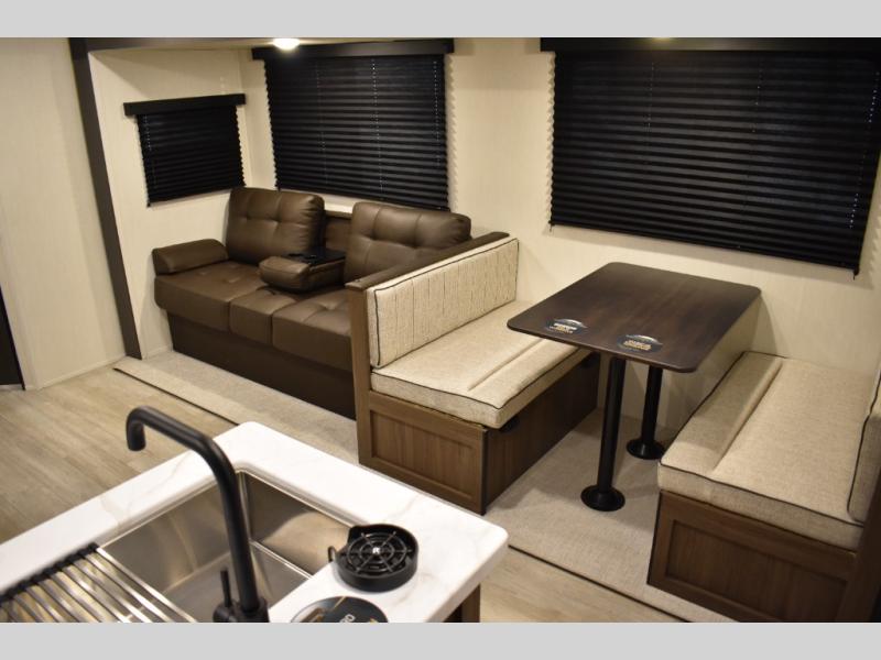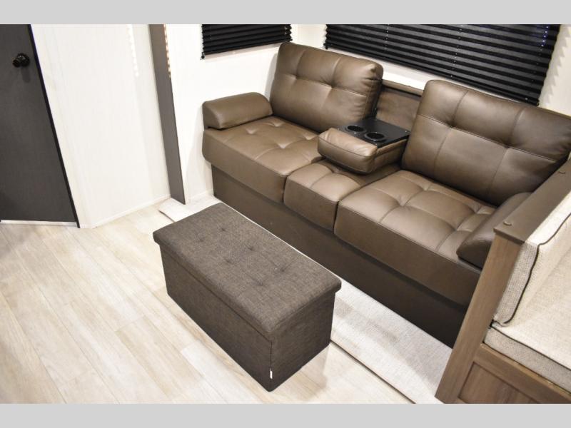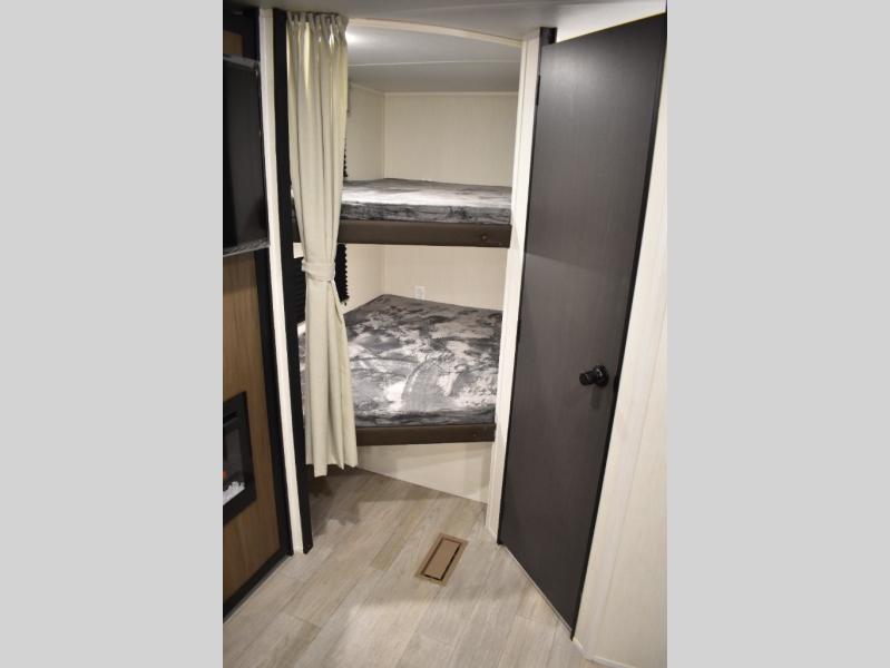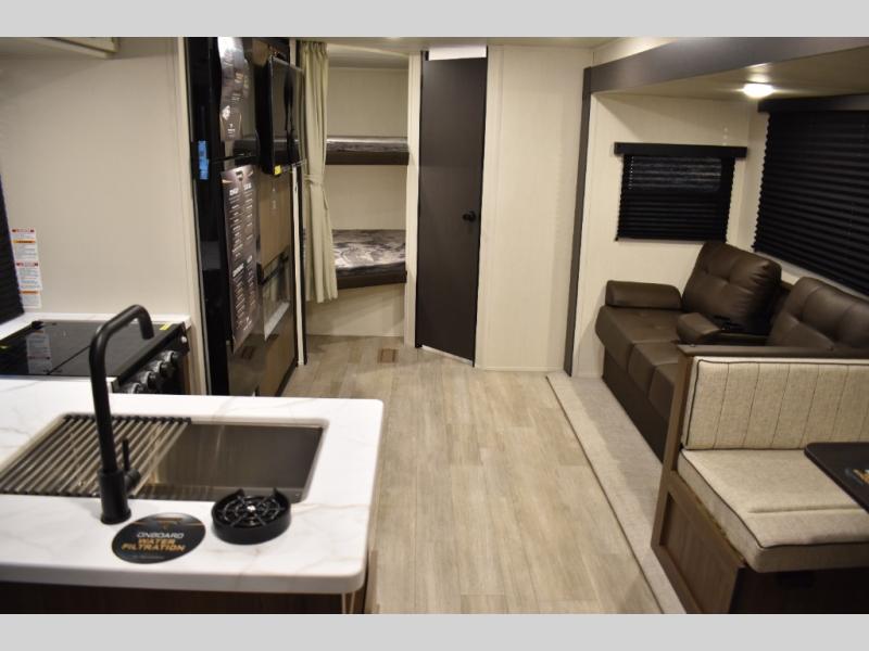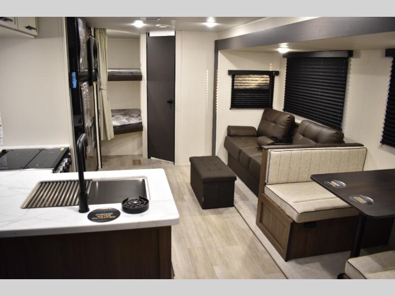 You'll appreciate the added space in this travel trailer thanks to the large slide out! The booth dinette and sofa are found here, and there is a moveable storage ottoman for extra blankets or board games. You'll have your own space up front in the private bedroom, complete with a camp king bed and storage for your things, while your guests take the double-size bunk beds towards the back. The chef of your group will find a three-burner cooktop and a built-in convection microwave with an air fryer to cook meals, plus there is a 12V refrigerator and large hidden pantry for food storage. This unit also includes a power awning outdoors and an outside refrigerator to keep cold drinks close by.