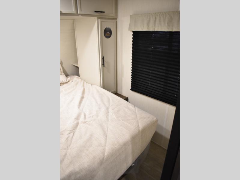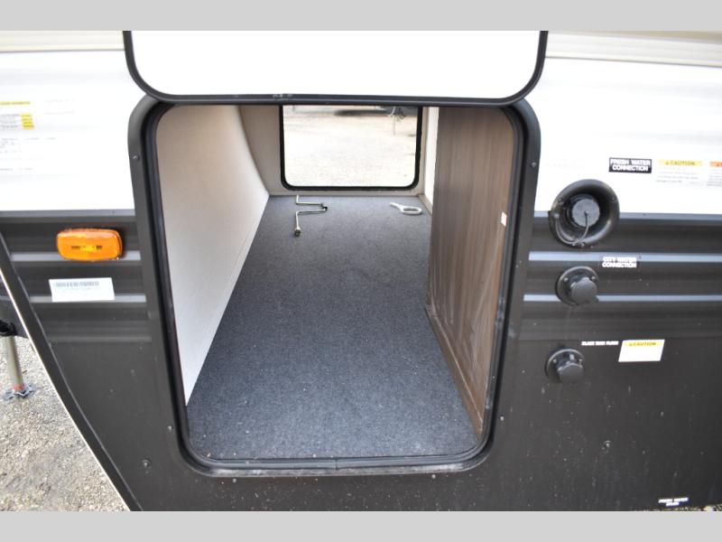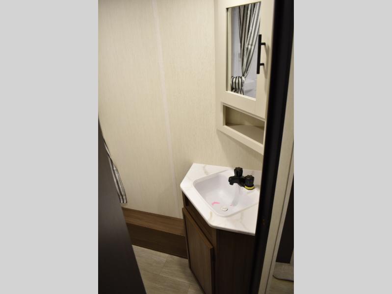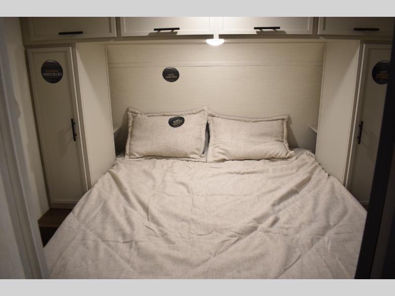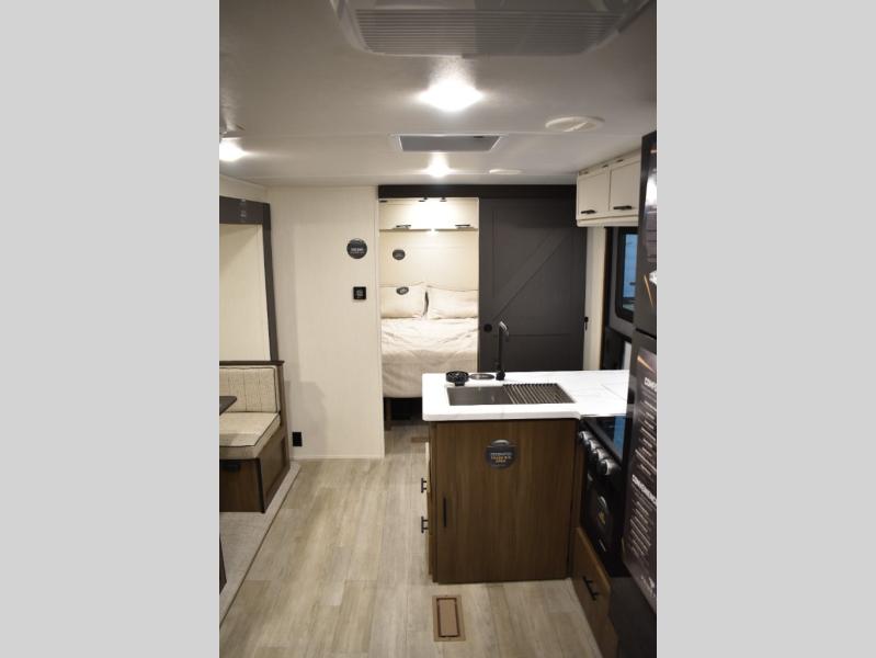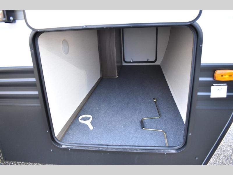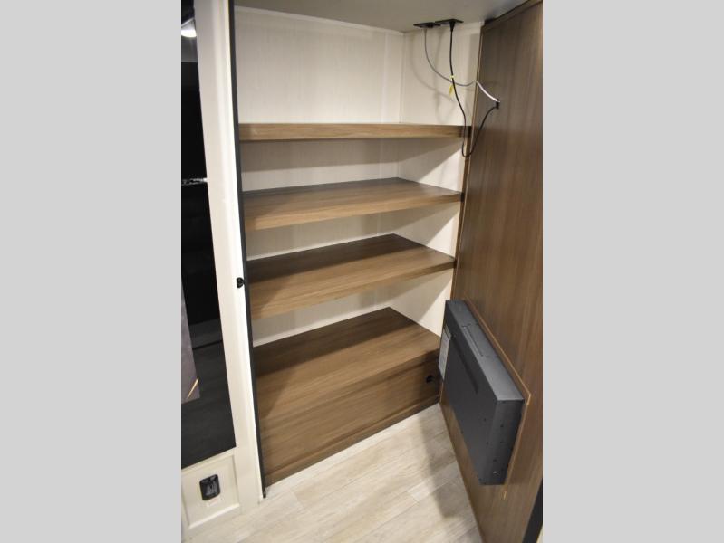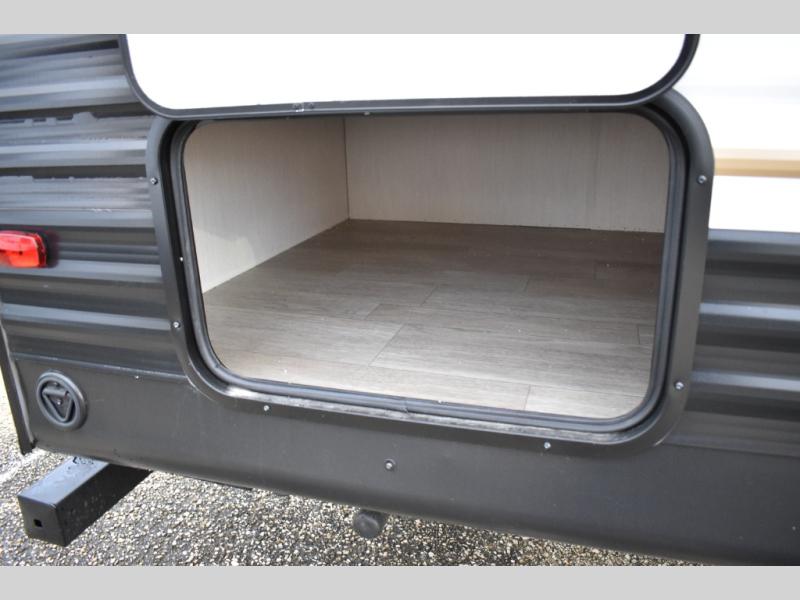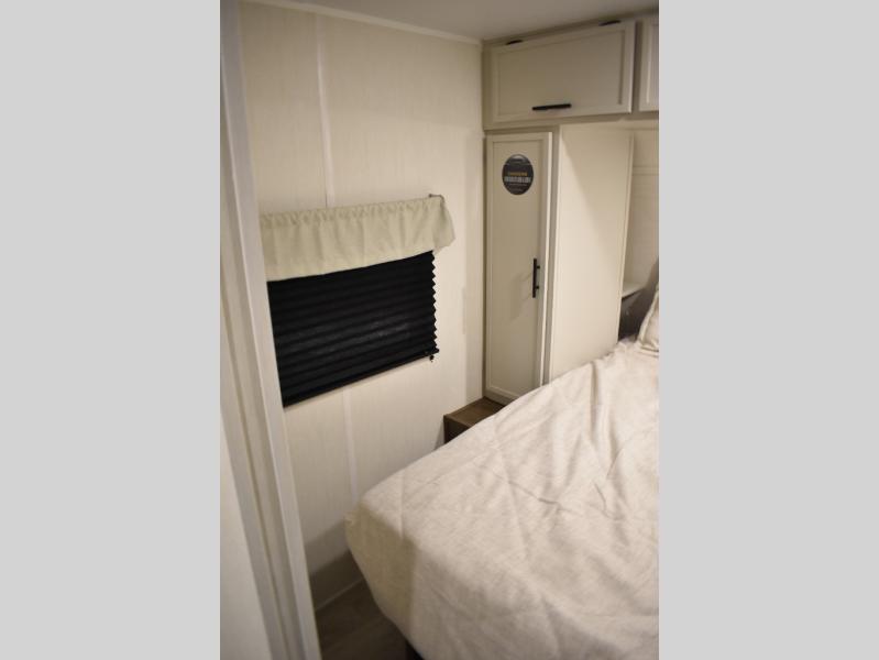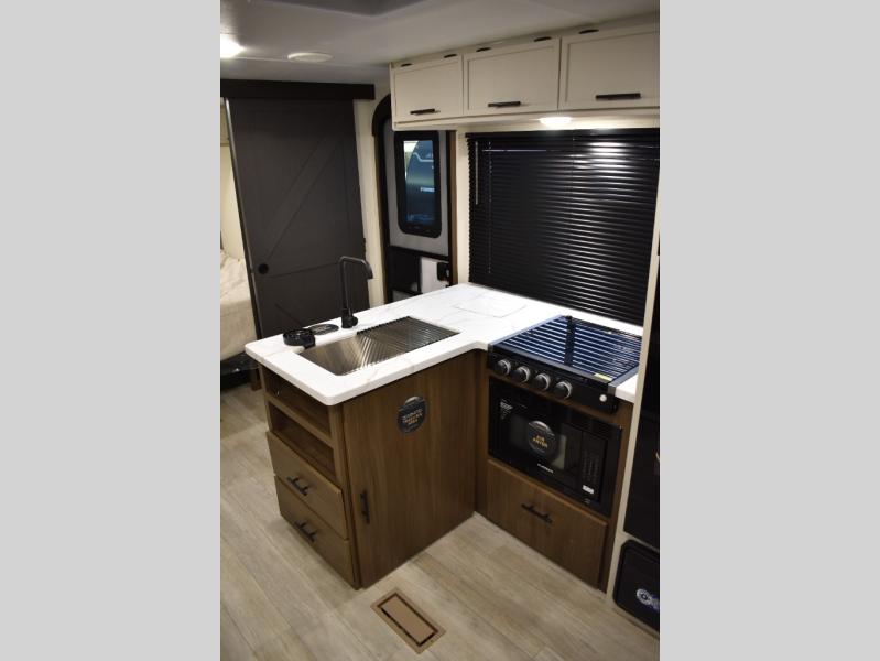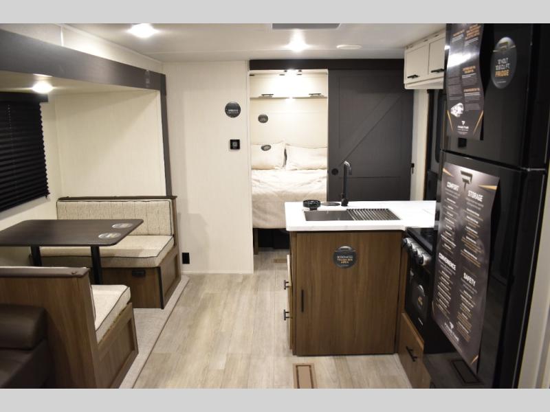 You'll appreciate the added space in this travel trailer thanks to the large slide out! The booth dinette and sofa are found here, and there is a moveable storage ottoman for extra blankets or board games. You'll have your own space up front in the private bedroom, complete with a camp king bed and storage for your things, while your guests take the double-size bunk beds towards the back. The chef of your group will find a three-burner cooktop and a built-in convection microwave with an air fryer to cook meals, plus there is a 12V refrigerator and large hidden pantry for food storage. This unit also includes a power awning outdoors and an outside refrigerator to keep cold drinks close by.