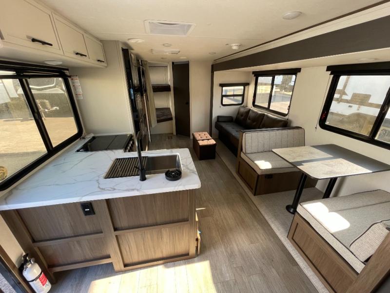 You'll appreciate the added space in this travel trailer thanks to the large slide out! The booth dinette and sofa are found here, and there is a moveable storage ottoman for extra blankets or board games. You'll have your own space up front in the private bedroom, complete with a camp king bed and storage for your things, while your guests take the double-size bunk beds towards the back. The chef of your group will find a three-burner cooktop and a built-in convection microwave with an air fryer to cook meals, plus there is a 12V refrigerator and large hidden pantry for food storage. This unit also includes a power awning outdoors and an outside refrigerator to keep cold drinks close by.