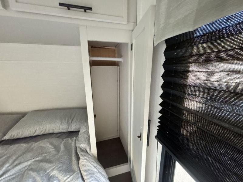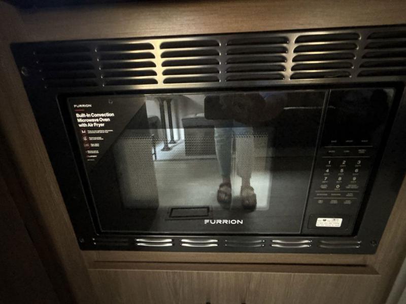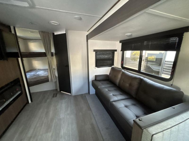 You'll appreciate the added space in this travel trailer thanks to the large slide out! The booth dinette and sofa are found here, and there is a moveable storage ottoman for extra blankets or board games. You'll have your own space up front in the private bedroom, complete with a camp king bed and storage for your things, while your guests take the double-size bunk beds towards the back. The chef of your group will find a three burner cooktop and a built-in convection microwave with an air fryer to cook meals, plus there is a 12V refrigerator and large hidden pantry for food storage. This unit also includes a power awning outdoors and an outside refrigerator to keep cold drinks close by.