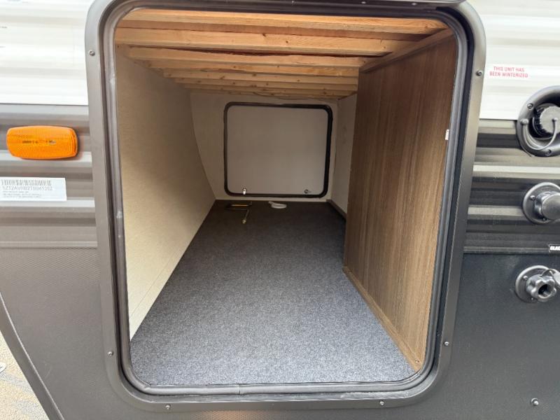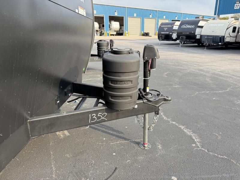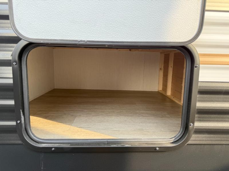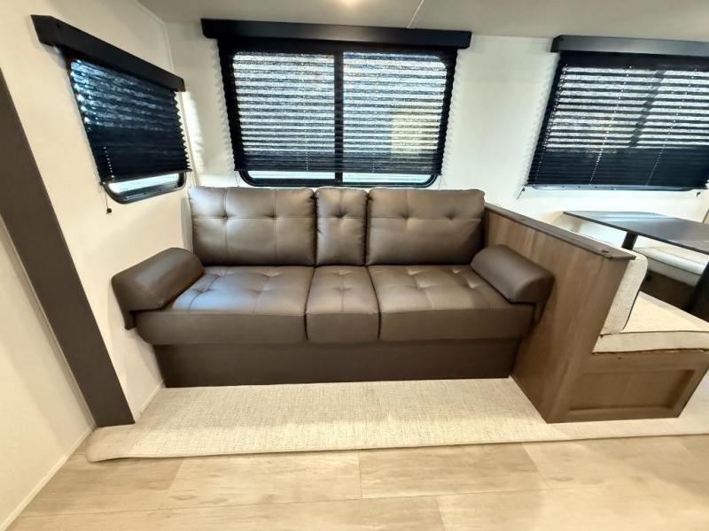 You'll appreciate the added space in this travel trailer thanks to the large slide out! The booth dinette and sofa are found here, and there is a moveable storage ottoman for extra blankets or board games. You'll have your own space up front in the private bedroom, complete with a camp king bed and storage for your things, while your guests take the double-size bunk beds towards the back. The chef of your group will find a three-burner cooktop and a built-in convection microwave with an air fryer to cook meals, plus there is a 12V refrigerator and large hidden pantry for food storage. This unit also includes a power awning outdoors and an outside refrigerator to keep cold drinks close by.