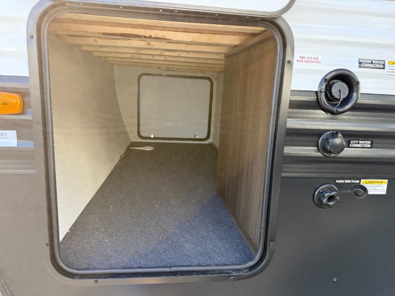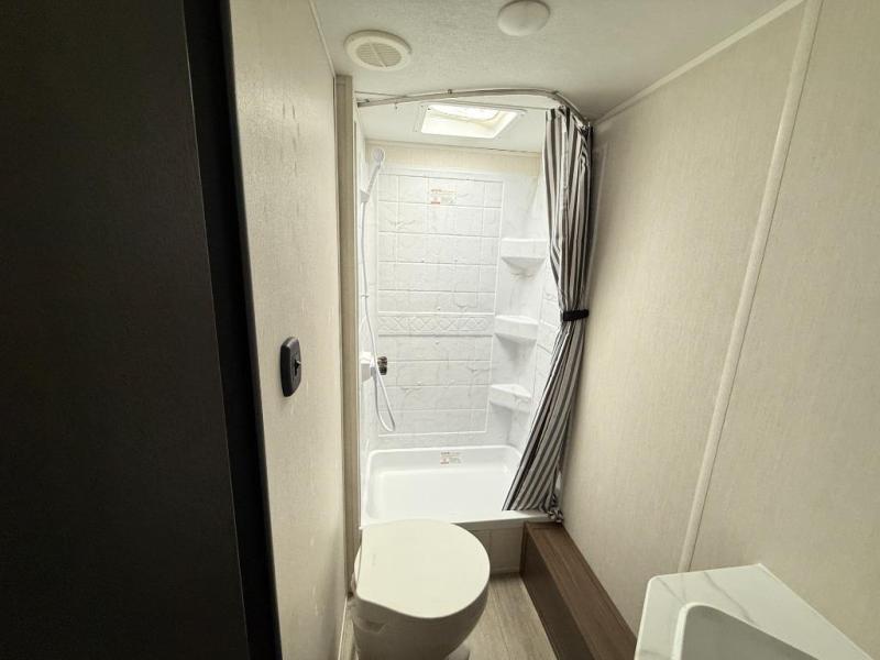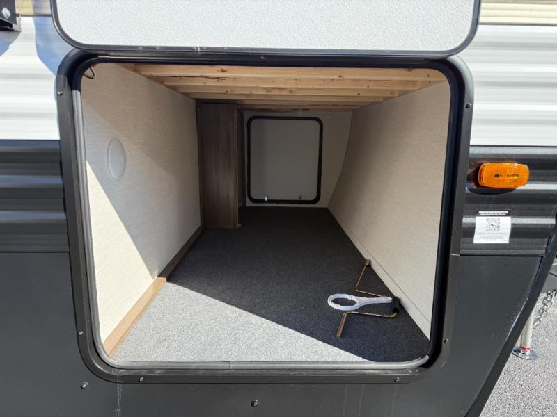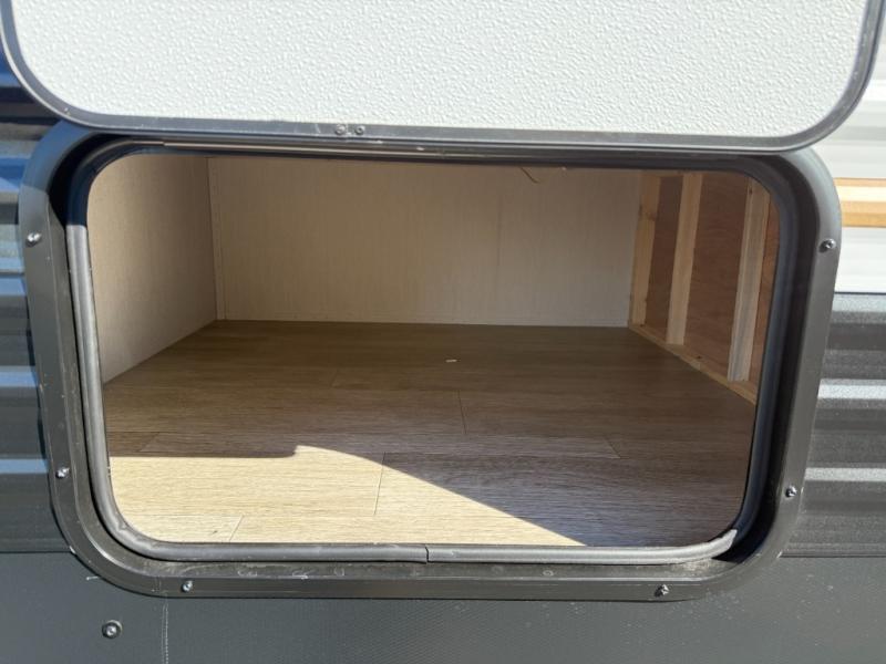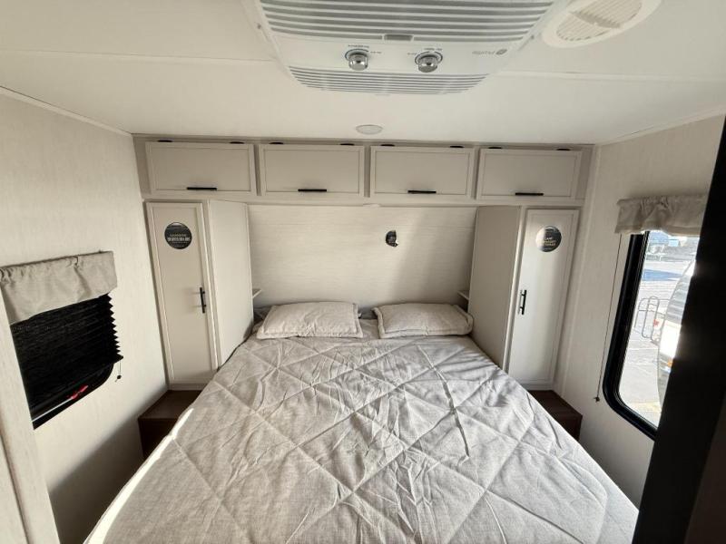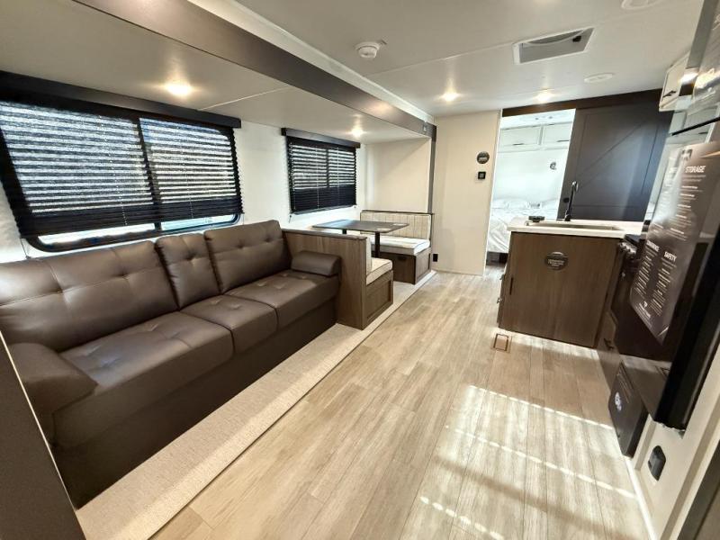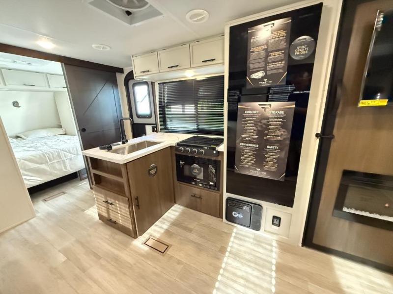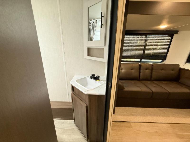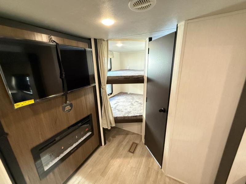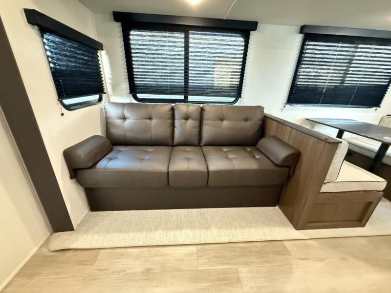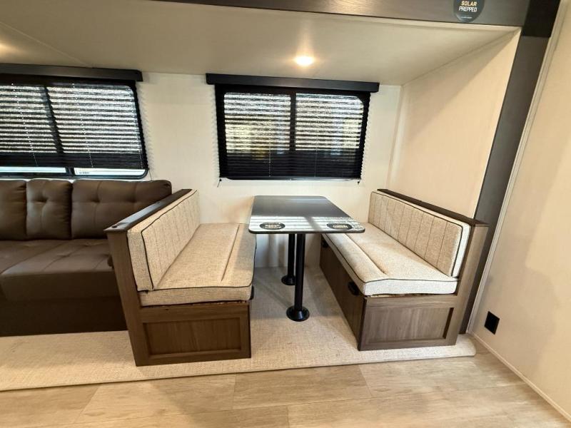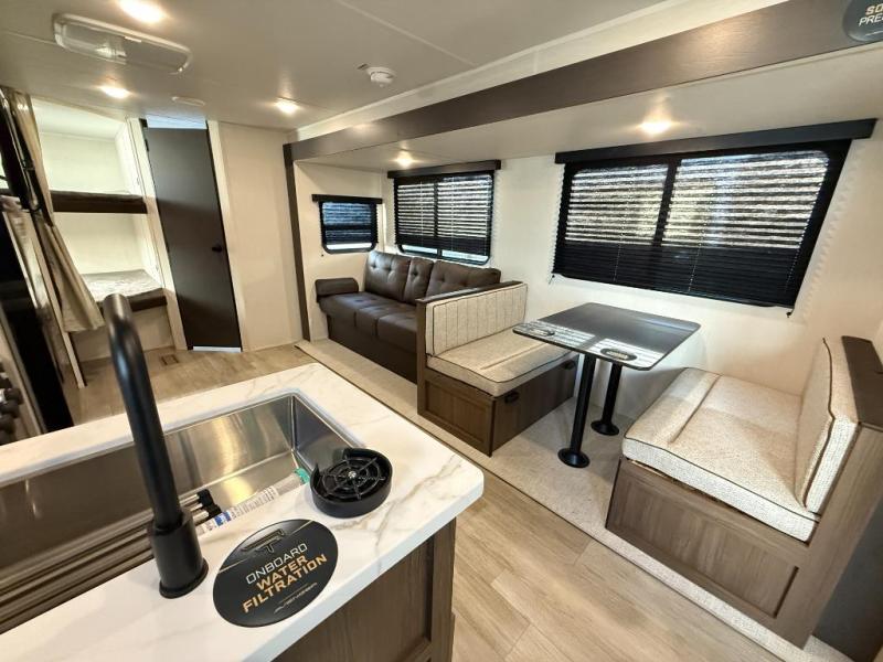 You'll appreciate the added space in this travel trailer thanks to the large slide out! The booth dinette and sofa are found here, and there is a moveable storage ottoman for extra blankets or board games. You'll have your own space up front in the private bedroom, complete with a camp king bed and storage for your things, while your guests take the double-size bunk beds towards the back. The chef of your group will find a three-burner cooktop and a built-in convection microwave with an air fryer to cook meals, plus there is a 12V refrigerator and large hidden pantry for food storage. This unit also includes a power awning outdoors and an outside refrigerator to keep cold drinks close by.