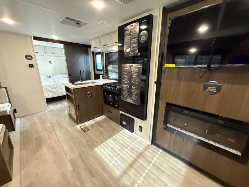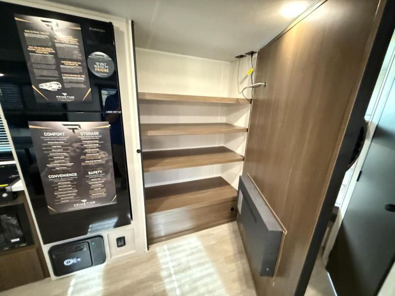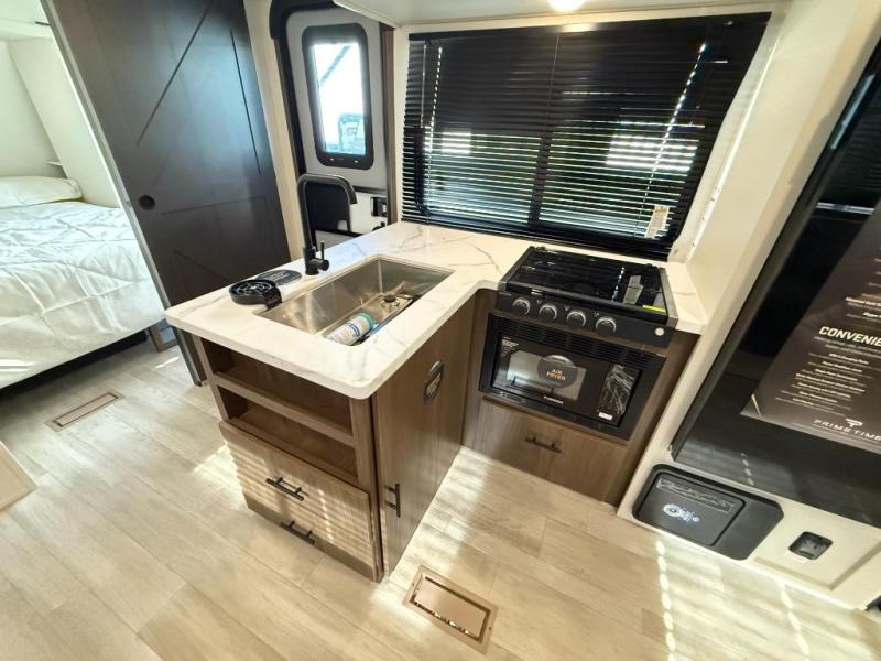 With any Avenger travel trailer by Prime Time RV, you will find innovation, a solid build, and comfort at every turn. Each model is built with Tuff Coat on the exterior metal, a fully enclosed underbelly, and a PVC roof membrane to help extend the life of your trailer. You will also find automotive name badging on the exterior, along with an exterior shower, front rail LED light strips, plus an XL padded entry grab handle to name a few conveniences. There are plenty of storage spaces inside, as well as Congoleum flooring and woven PVC marine grade slide out flooring, a designer shower surround, and seamless pressed countertops. You are sure to appreciate the onboard water filtration system, tankless water heater, plus 30K BTU furnace and 15K ducted A/C to help keep you comfortable.