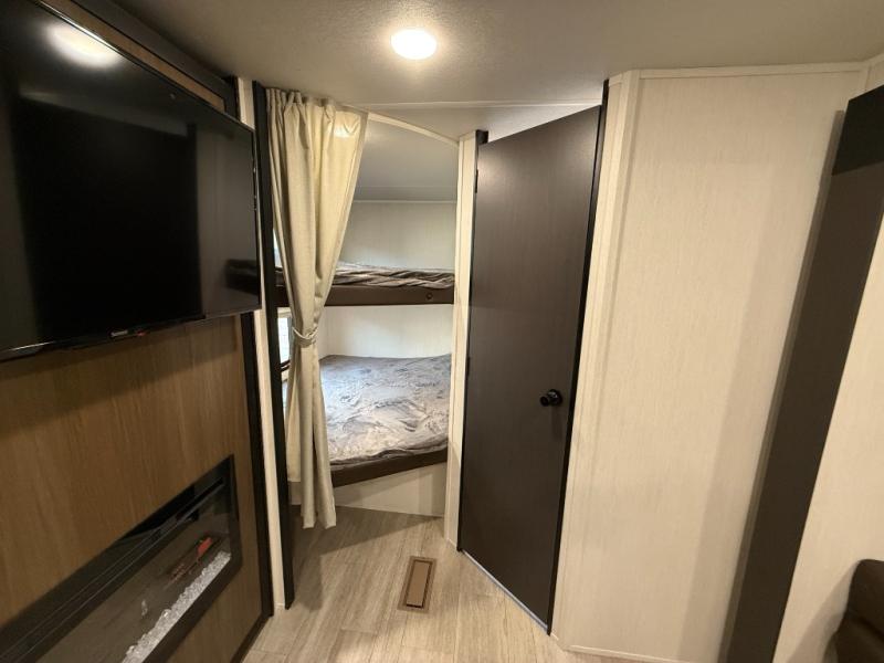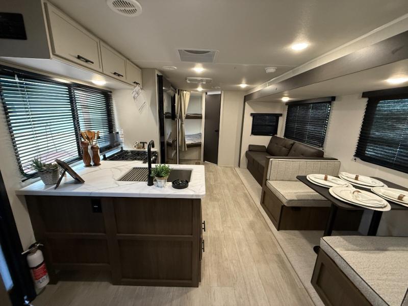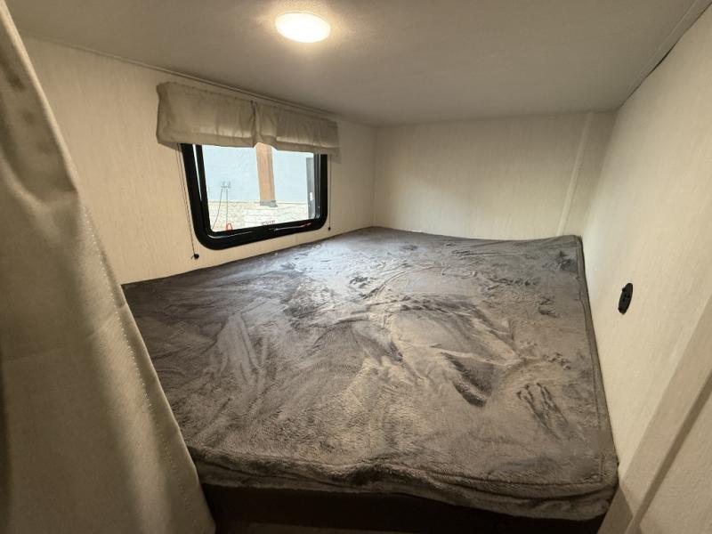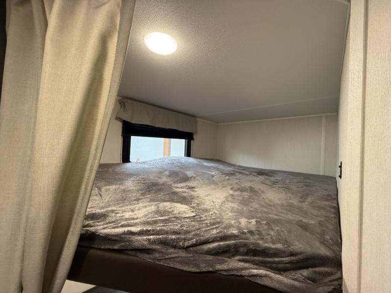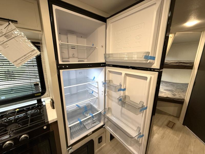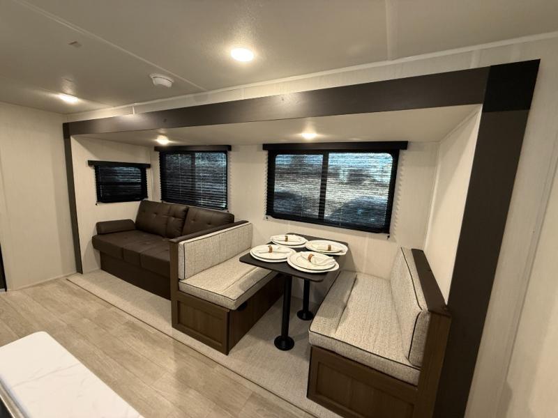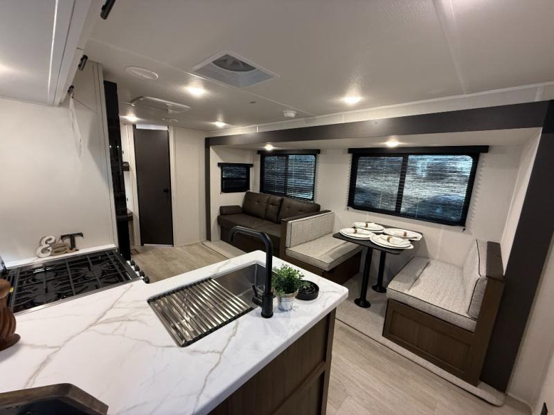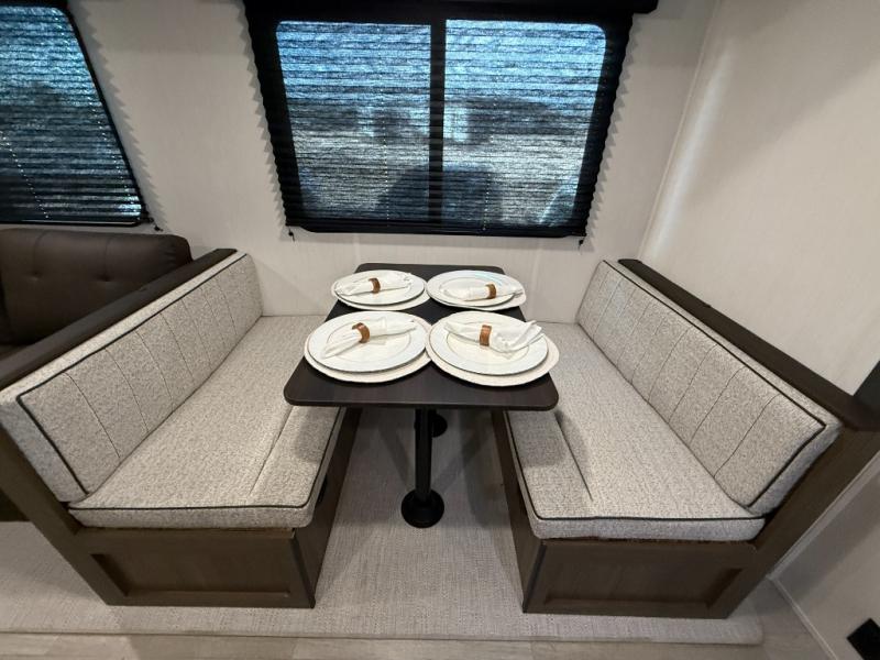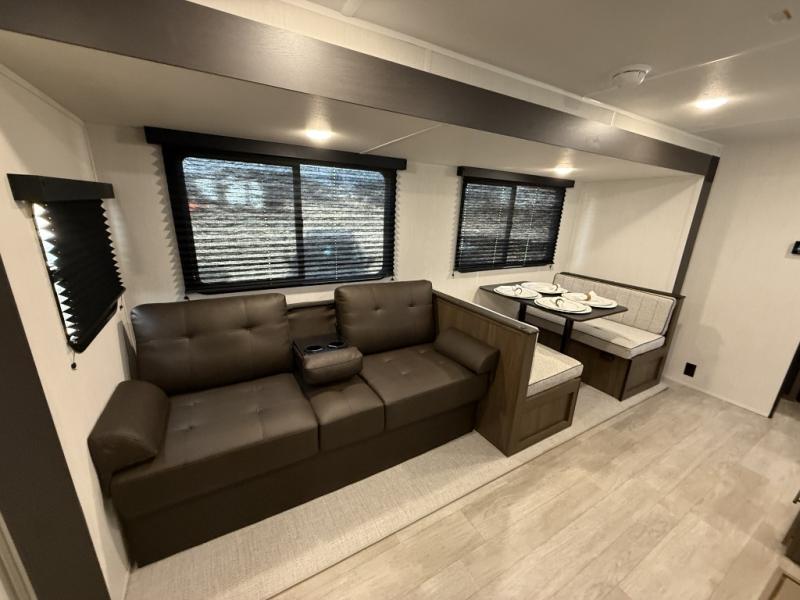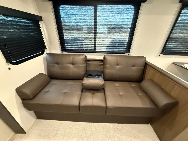 You'll appreciate the added space in this travel trailer thanks to the large slide out! The booth dinette and sofa are found here, and there is a moveable storage ottoman for extra blankets or board games. You'll have your own space up front in the private bedroom, complete with a camp king bed and storage for your things, while your guests take the double-size bunk beds towards the back. The chef of your group will find a three-burner cooktop and a built-in convection microwave with an air fryer to cook meals, plus there is a 12V refrigerator and large hidden pantry for food storage. This unit also includes a power awning outdoors and an outside refrigerator to keep cold drinks close by.