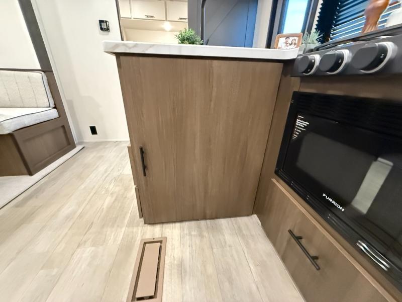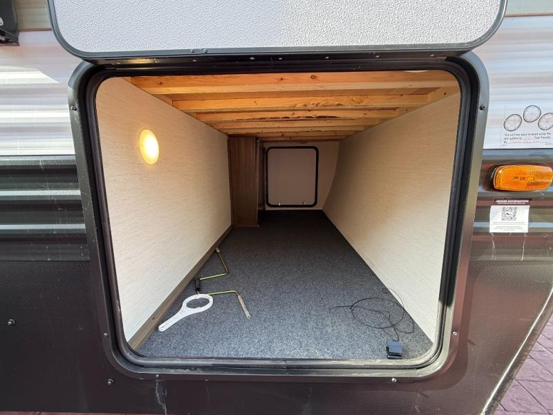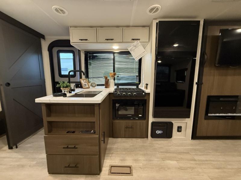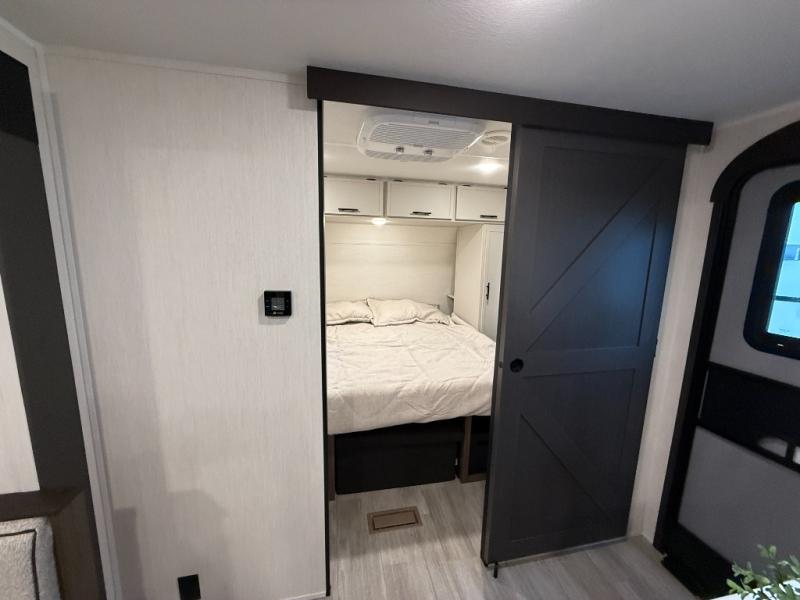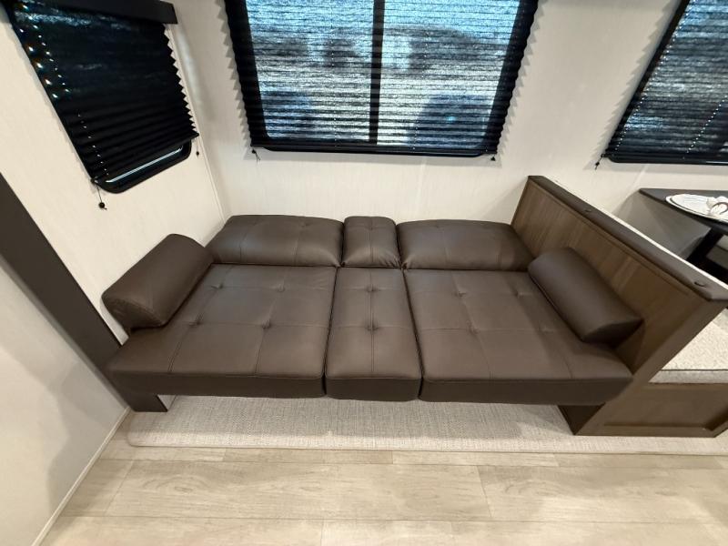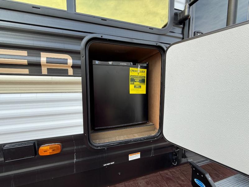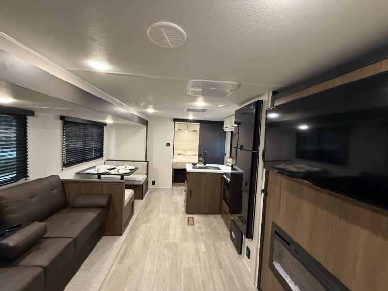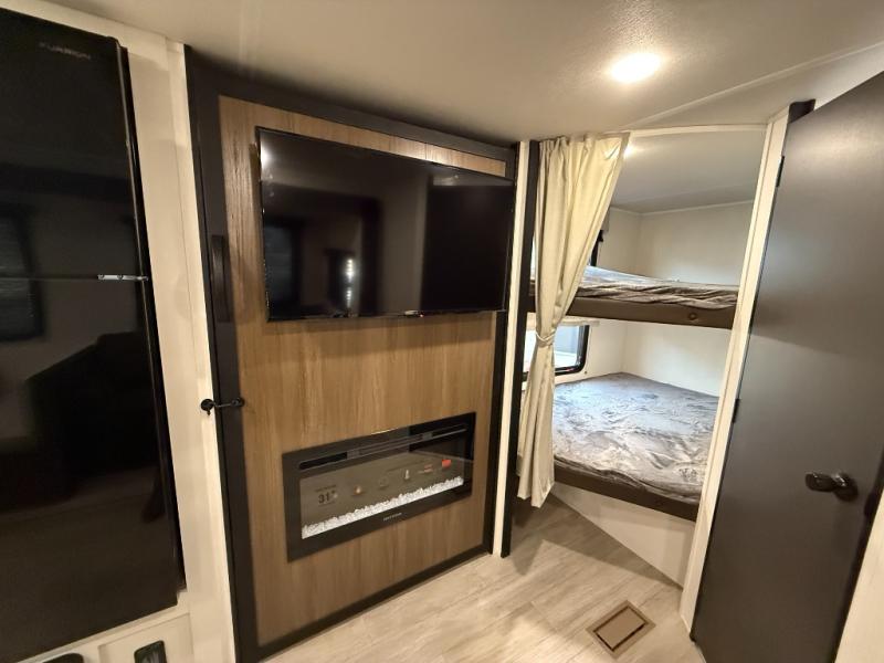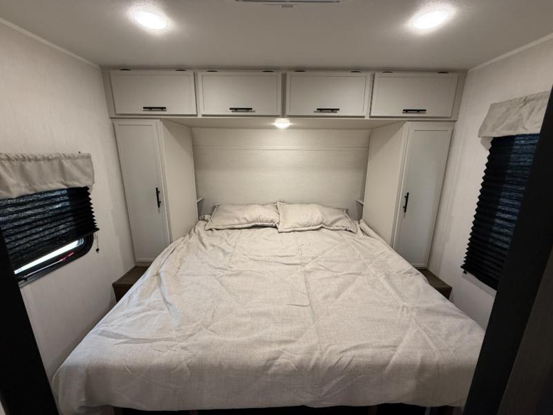 You'll appreciate the added space in this travel trailer thanks to the large slide out! The booth dinette and sofa are found here, and there is a moveable storage ottoman for extra blankets or board games. You'll have your own space up front in the private bedroom, complete with a camp king bed and storage for your things, while your guests take the double-size bunk beds towards the back. The chef of your group will find a three-burner cooktop and a built-in convection microwave with an air fryer to cook meals, plus there is a 12V refrigerator and large hidden pantry for food storage. This unit also includes a power awning outdoors and an outside refrigerator to keep cold drinks close by.