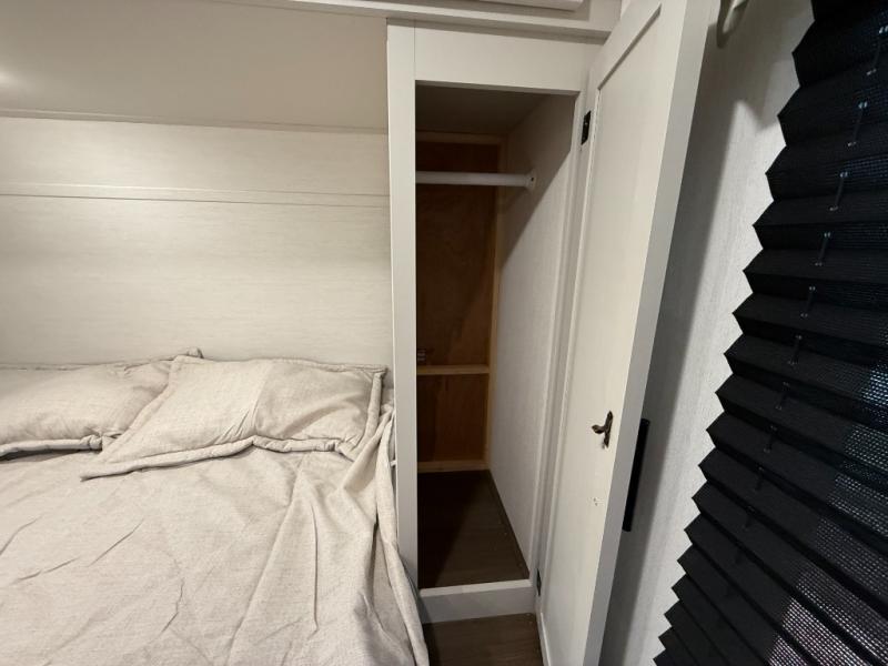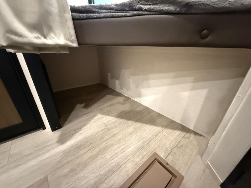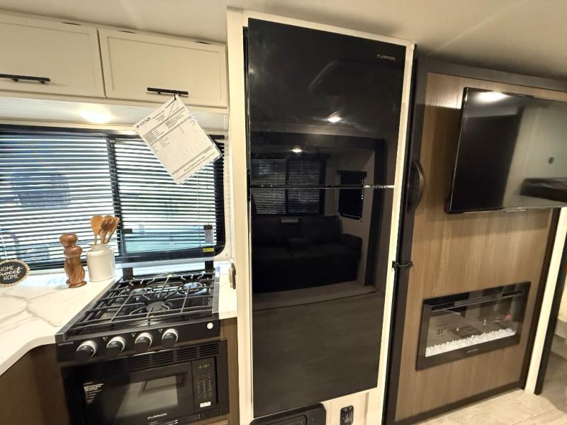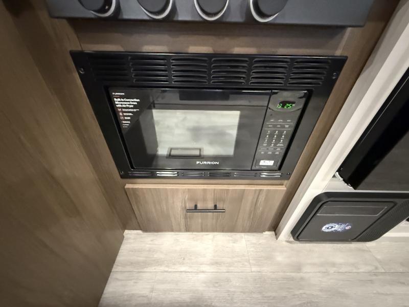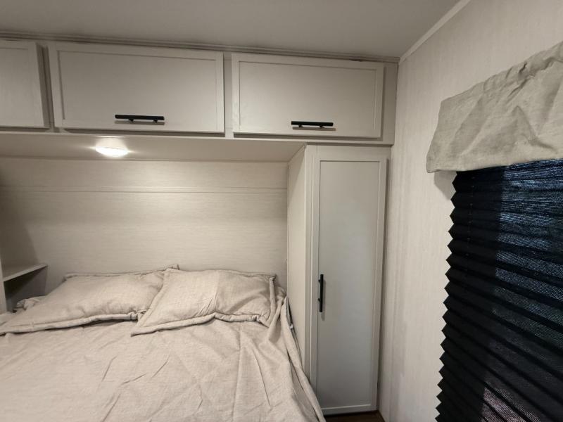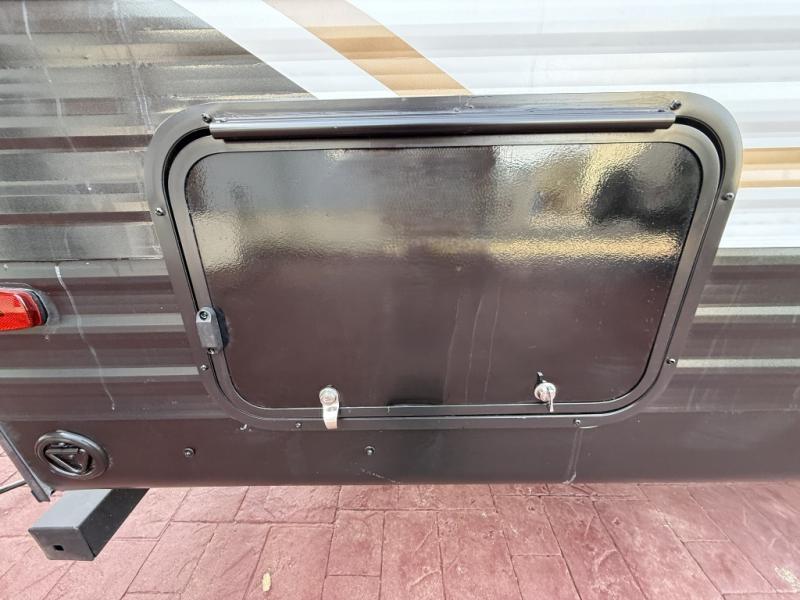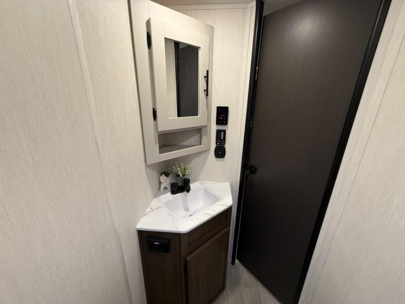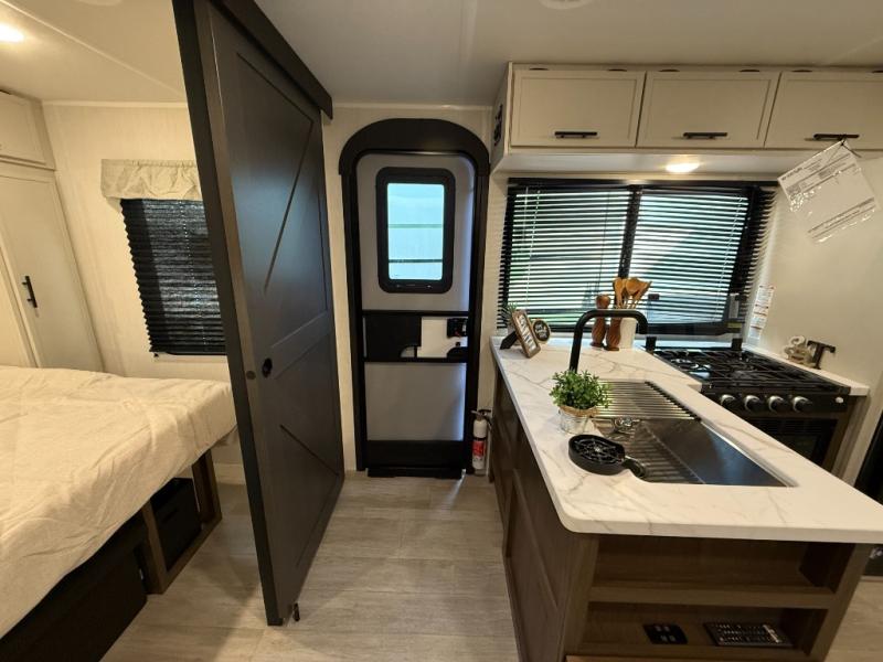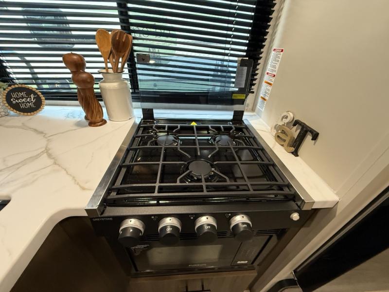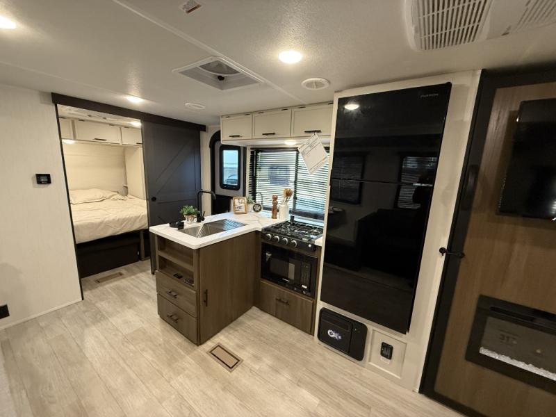 You'll appreciate the added space in this travel trailer thanks to the large slide out! The booth dinette and sofa are found here, and there is a moveable storage ottoman for extra blankets or board games. You'll have your own space up front in the private bedroom, complete with a camp king bed and storage for your things, while your guests take the double-size bunk beds towards the back. The chef of your group will find a three-burner cooktop and a built-in convection microwave with an air fryer to cook meals, plus there is a 12V refrigerator and large hidden pantry for food storage. This unit also includes a power awning outdoors and an outside refrigerator to keep cold drinks close by.