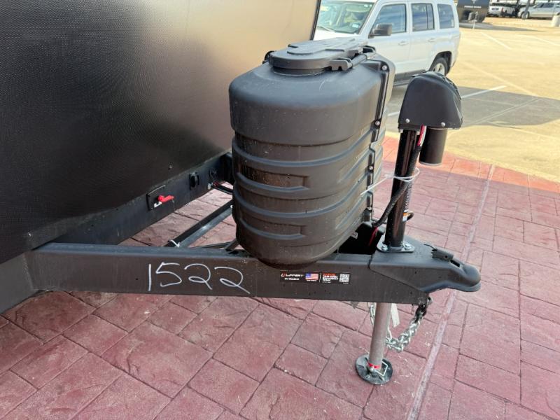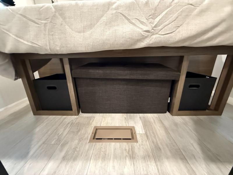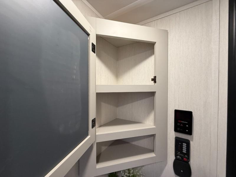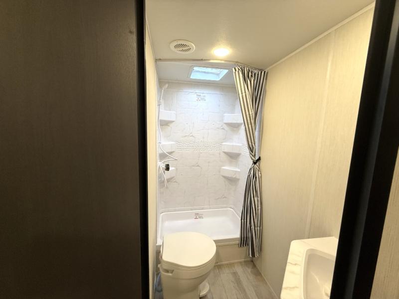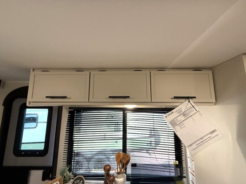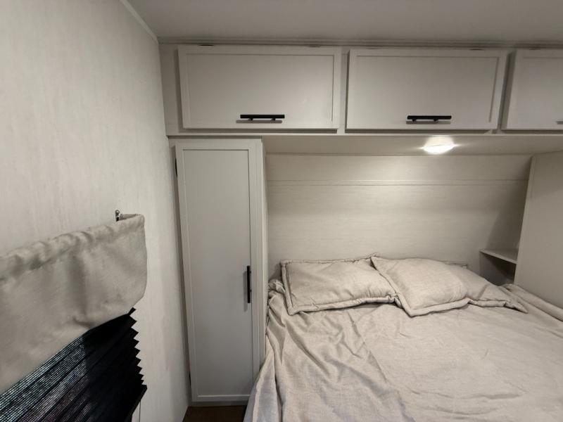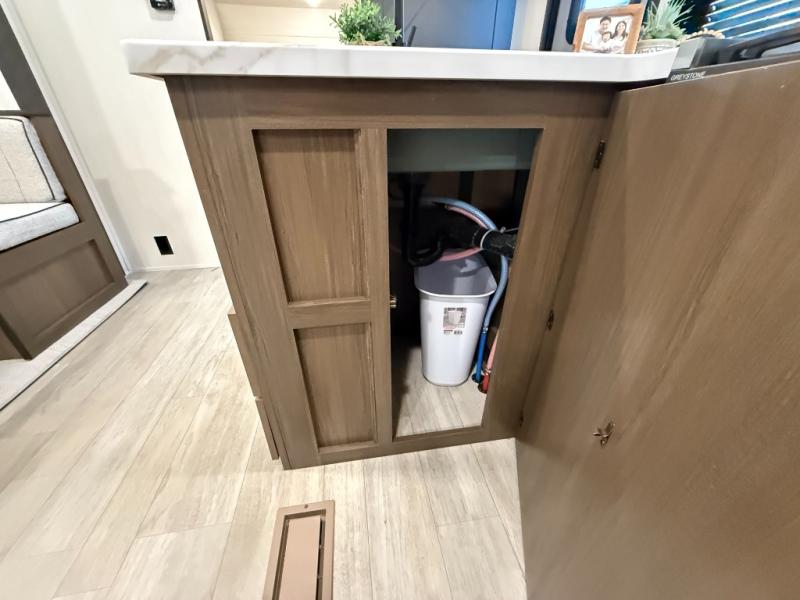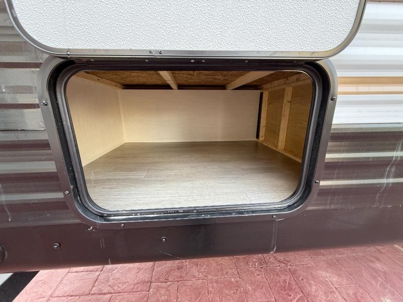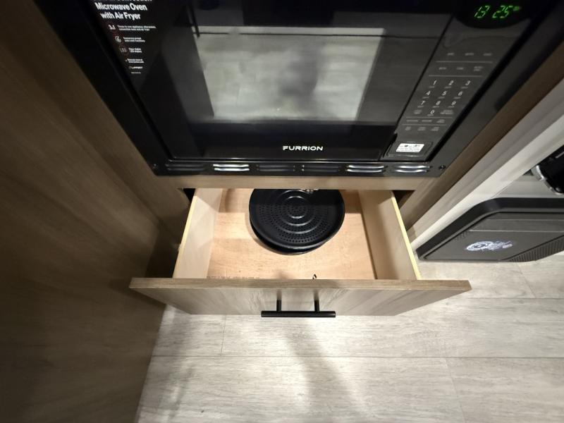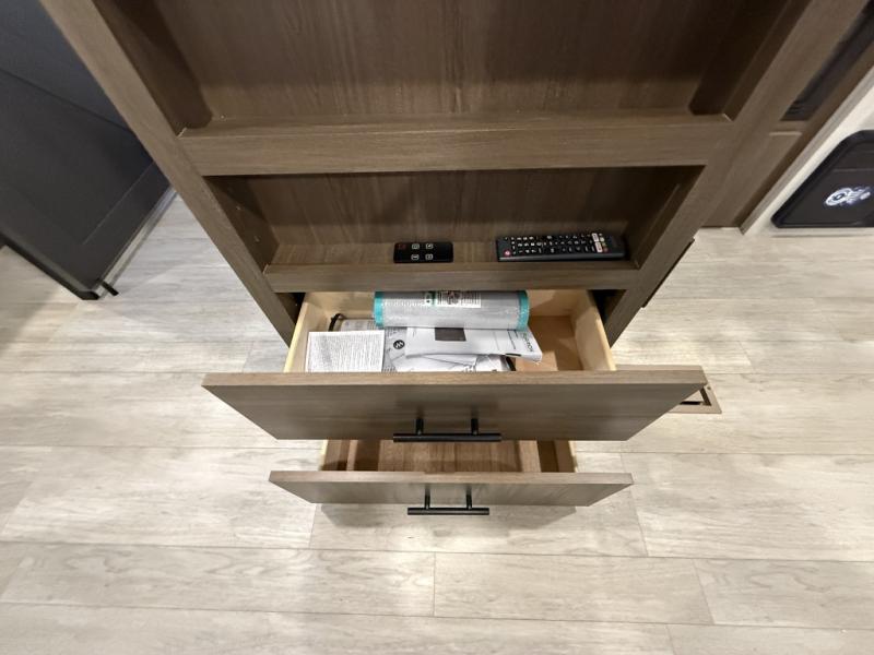 You'll appreciate the added space in this travel trailer thanks to the large slide out! The booth dinette and sofa are found here, and there is a moveable storage ottoman for extra blankets or board games. You'll have your own space up front in the private bedroom, complete with a camp king bed and storage for your things, while your guests take the double-size bunk beds towards the back. The chef of your group will find a three-burner cooktop and a built-in convection microwave with an air fryer to cook meals, plus there is a 12V refrigerator and large hidden pantry for food storage. This unit also includes a power awning outdoors and an outside refrigerator to keep cold drinks close by.