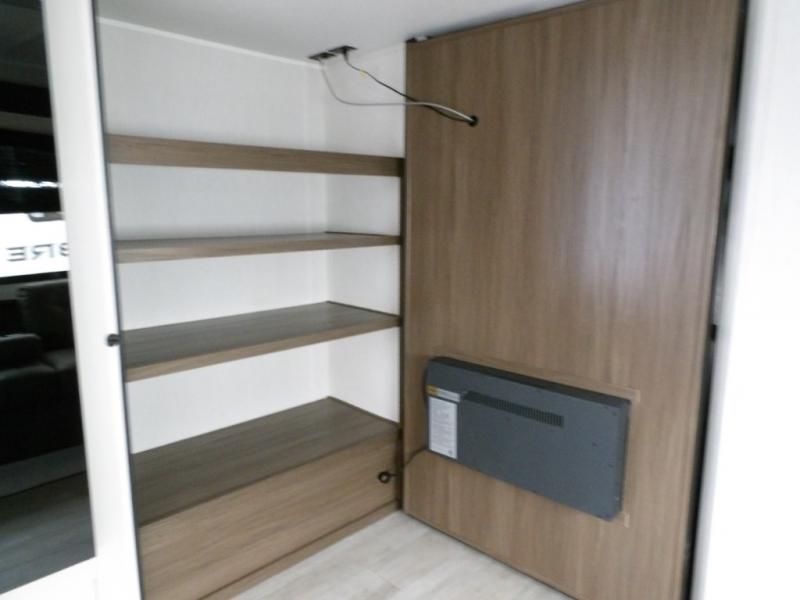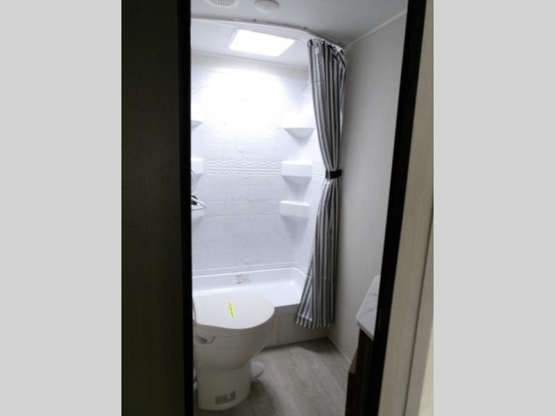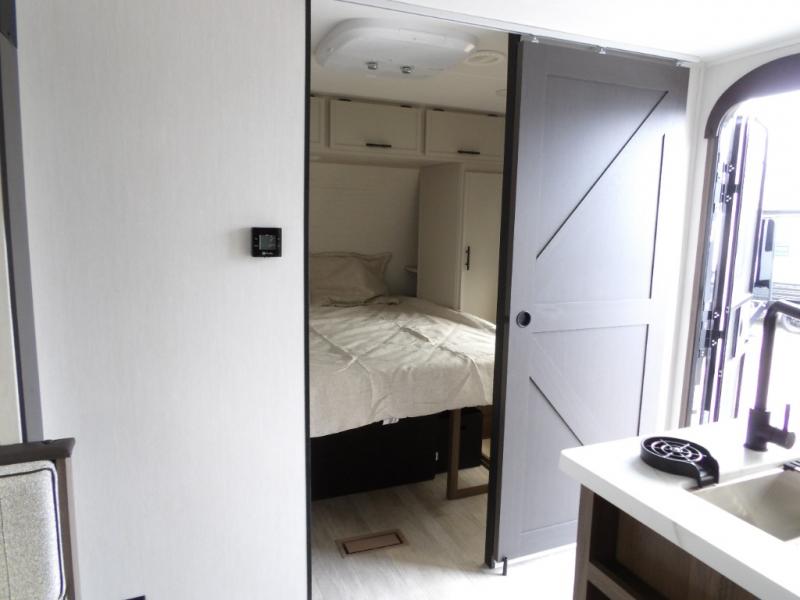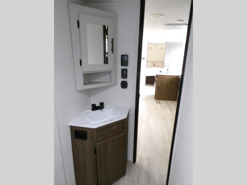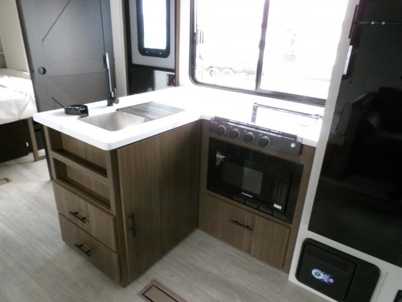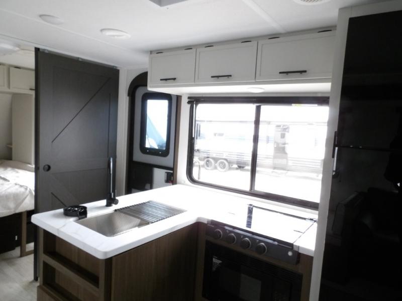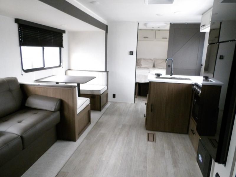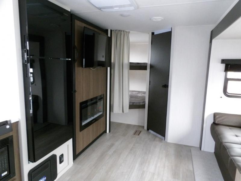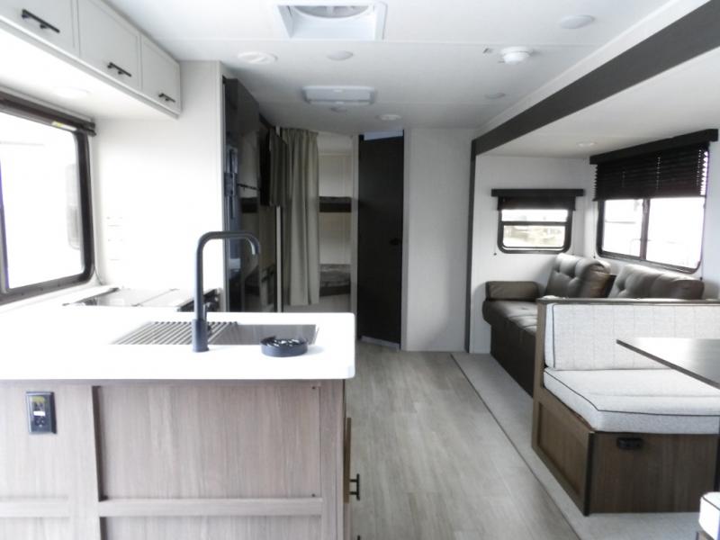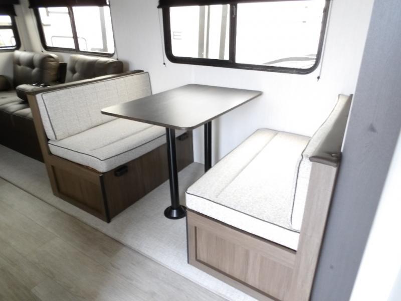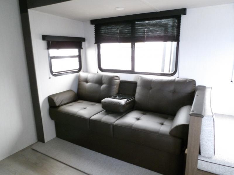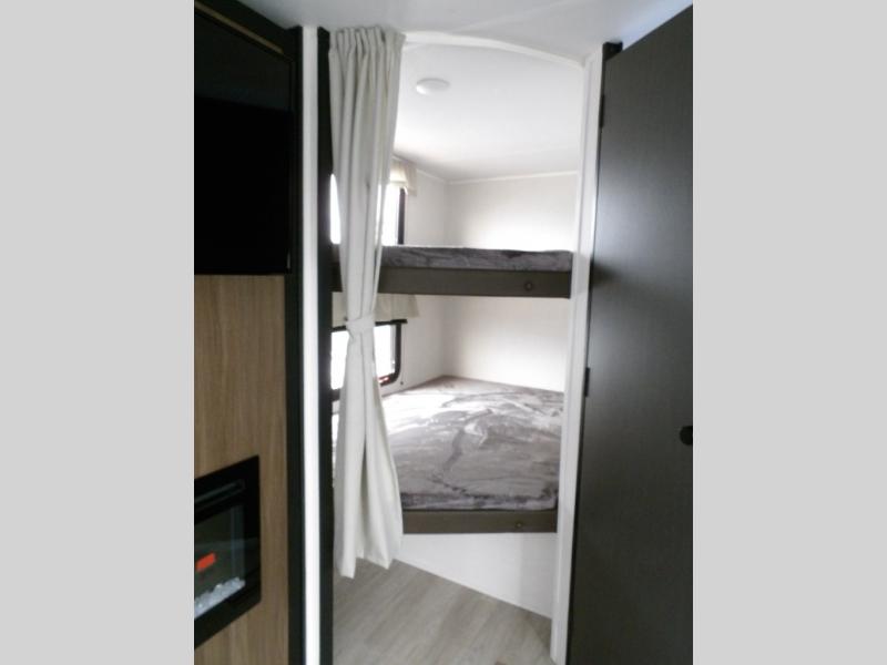 You'll appreciate the added space in this travel trailer thanks to the large slide out! The booth dinette and sofa are found here, and there is a moveable storage ottoman for extra blankets or board games. You'll have your own space up front in the private bedroom, complete with a camp king bed and storage for your things, while your guests take the double-size bunk beds towards the back. The chef of your group will find a three-burner cooktop and a built-in convection microwave with an air fryer to cook meals, plus there is a 12V refrigerator and large hidden pantry for food storage. This unit also includes a power awning outdoors and an outside refrigerator to keep cold drinks close by.
