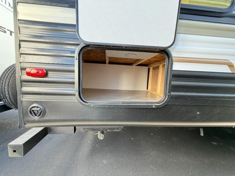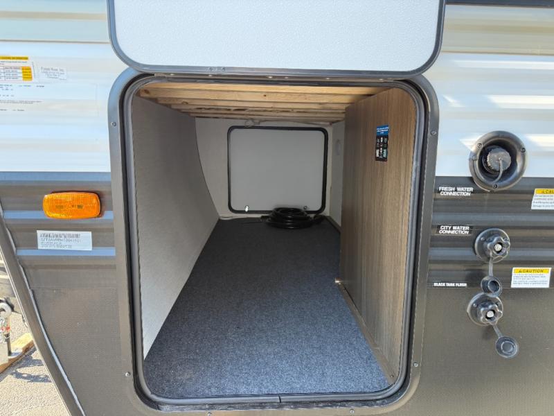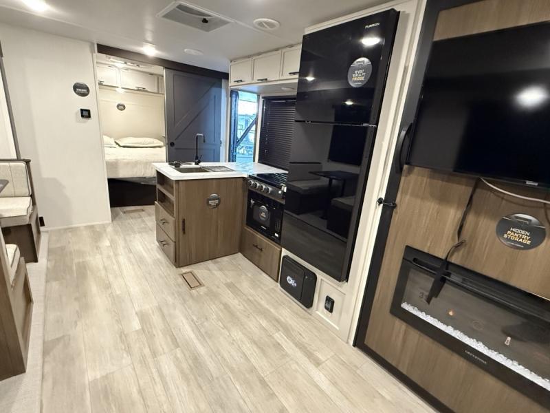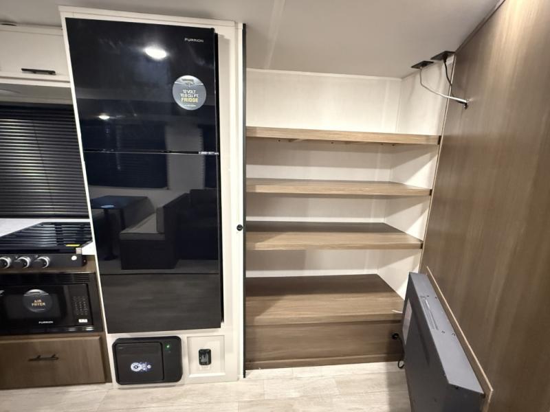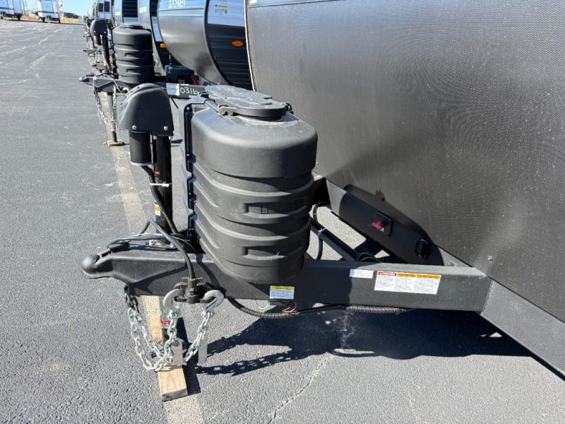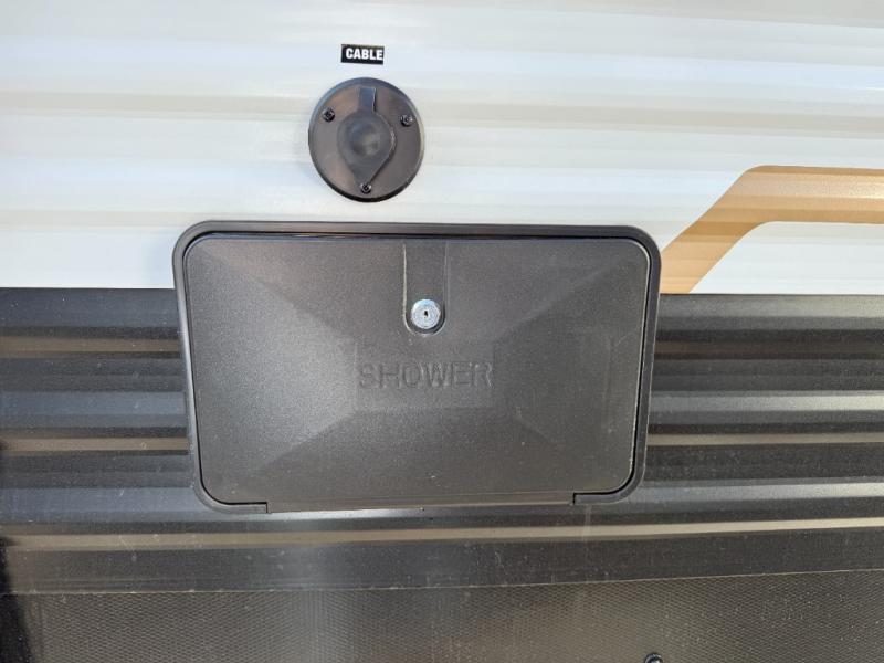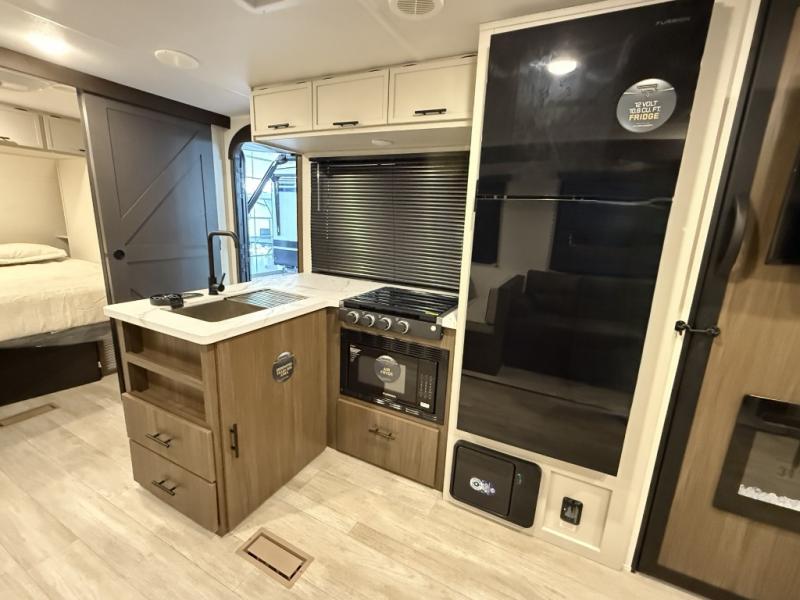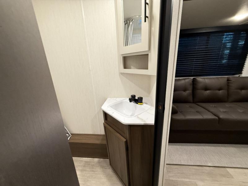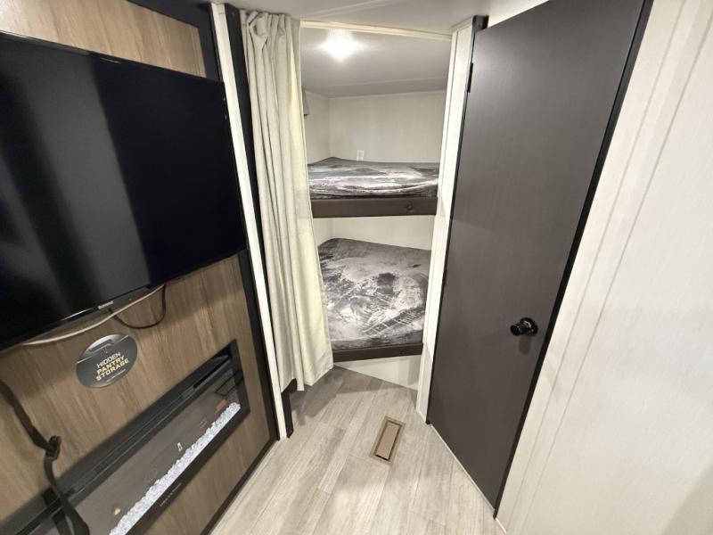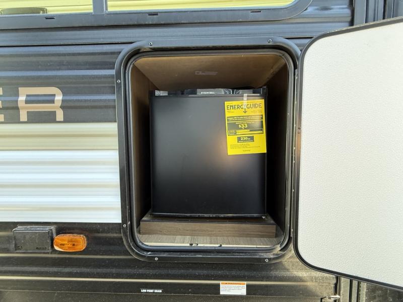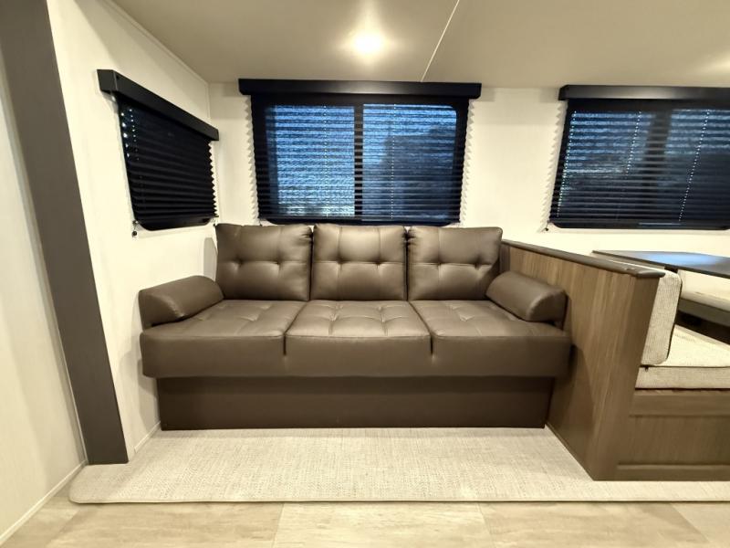 You'll appreciate the added space in this travel trailer thanks to the large slide out! The booth dinette and sofa are found here, and there is a moveable storage ottoman for extra blankets or board games. You'll have your own space up front in the private bedroom, complete with a camp king bed and storage for your things, while your guests take the double-size bunk beds towards the back. The chef of your group will find a three-burner cooktop and a built-in convection microwave with an air fryer to cook meals, plus there is a 12V refrigerator and large hidden pantry for food storage. This unit also includes a power awning outdoors and an outside refrigerator to keep cold drinks close by.