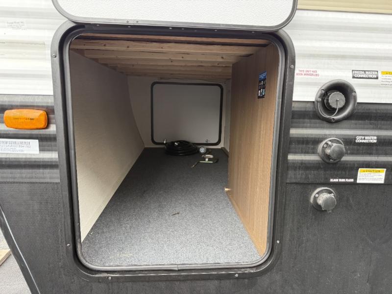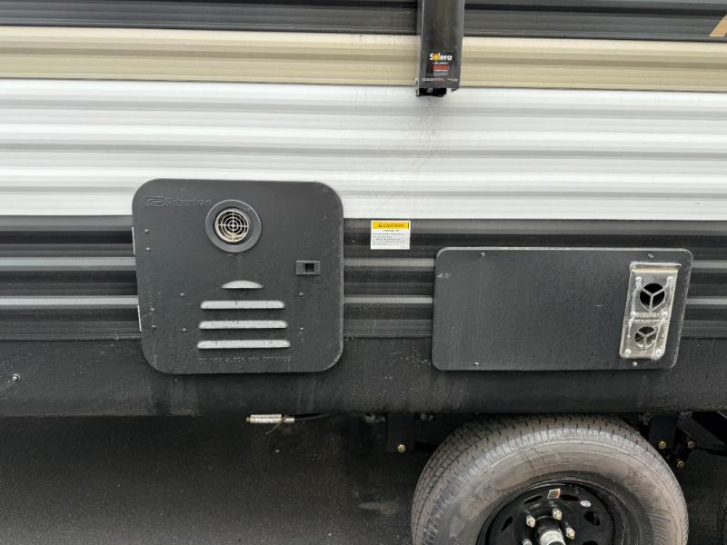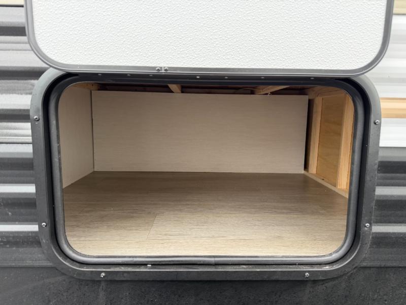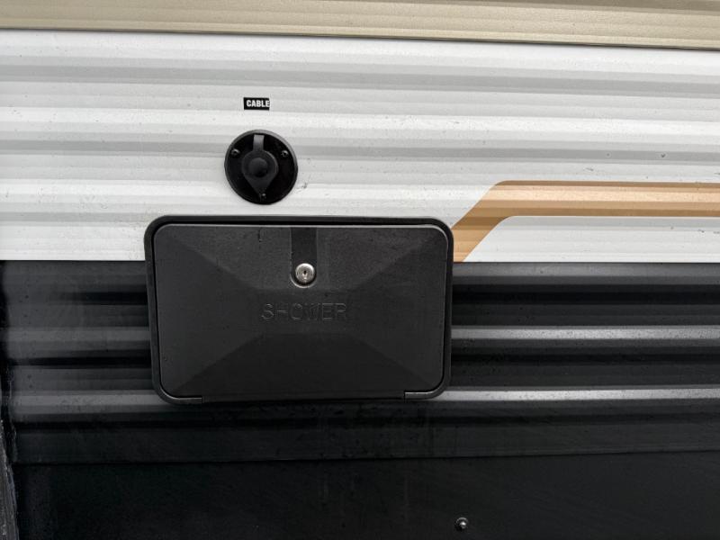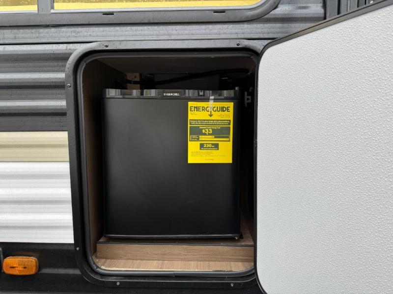 You'll appreciate the added space in this travel trailer thanks to the large slide out! The booth dinette and sofa are found here, and there is a moveable storage ottoman for extra blankets or board games. You'll have your own space up front in the private bedroom, complete with a camp king bed and storage for your things, while your guests take the double-size bunk beds towards the back. The chef of your group will find a three-burner cooktop and a built-in convection microwave with an air fryer to cook meals, plus there is a 12V refrigerator and large hidden pantry for food storage. This unit also includes a power awning outdoors and an outside refrigerator to keep cold drinks close by.