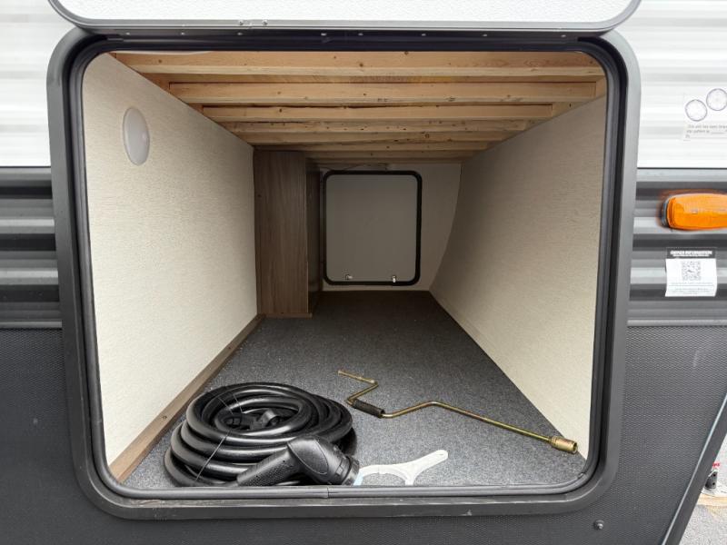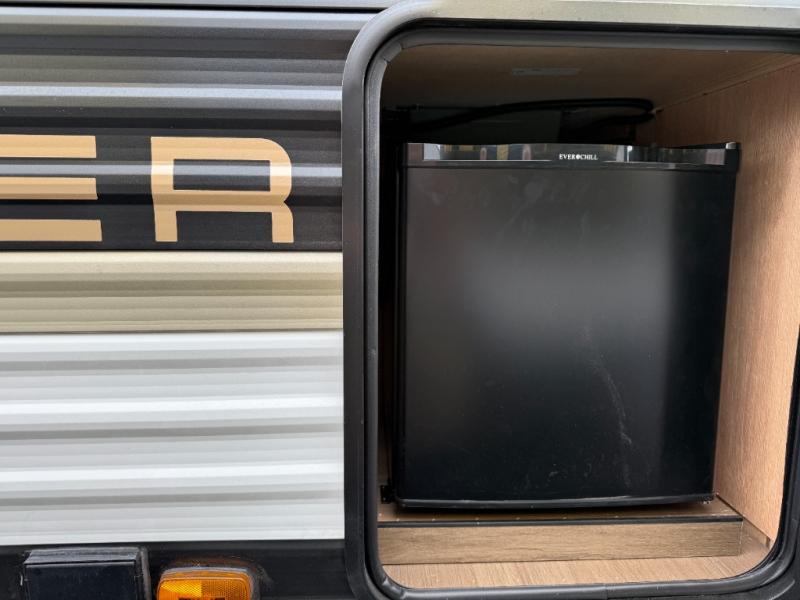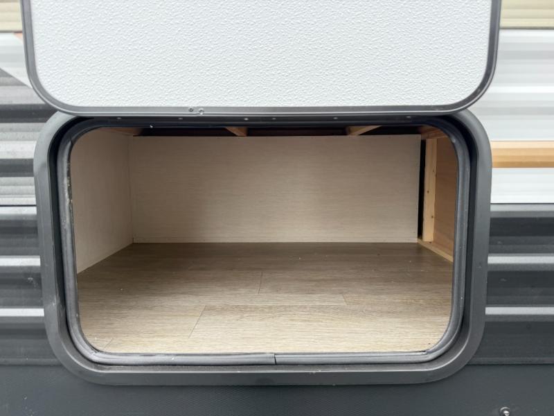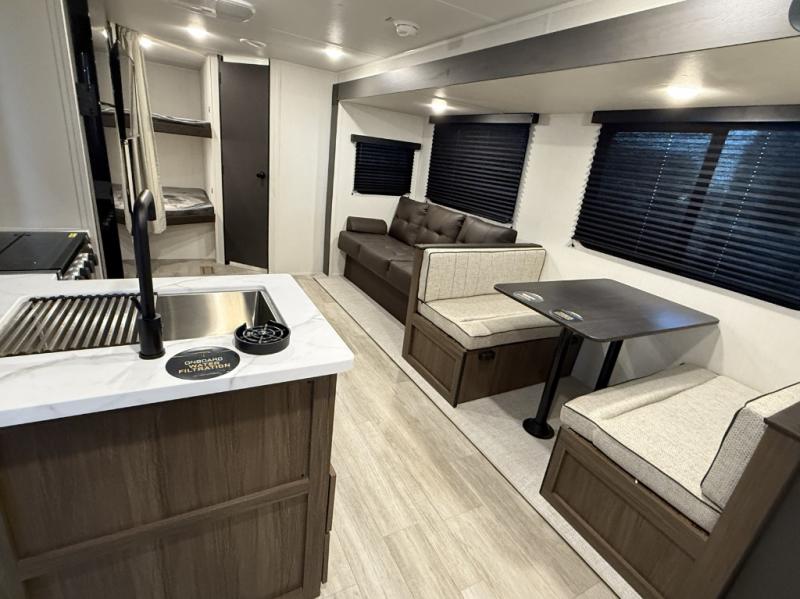 You'll appreciate the added space in this travel trailer thanks to the large slide out! The booth dinette and sofa are found here, and there is a moveable storage ottoman for extra blankets or board games. You'll have your own space up front in the private bedroom, complete with a camp king bed and storage for your things, while your guests take the double-size bunk beds towards the back. The chef of your group will find a three-burner cooktop and a built-in convection microwave with an air fryer to cook meals, plus there is a 12V refrigerator and large hidden pantry for food storage. This unit also includes a power awning outdoors and an outside refrigerator to keep cold drinks close by.