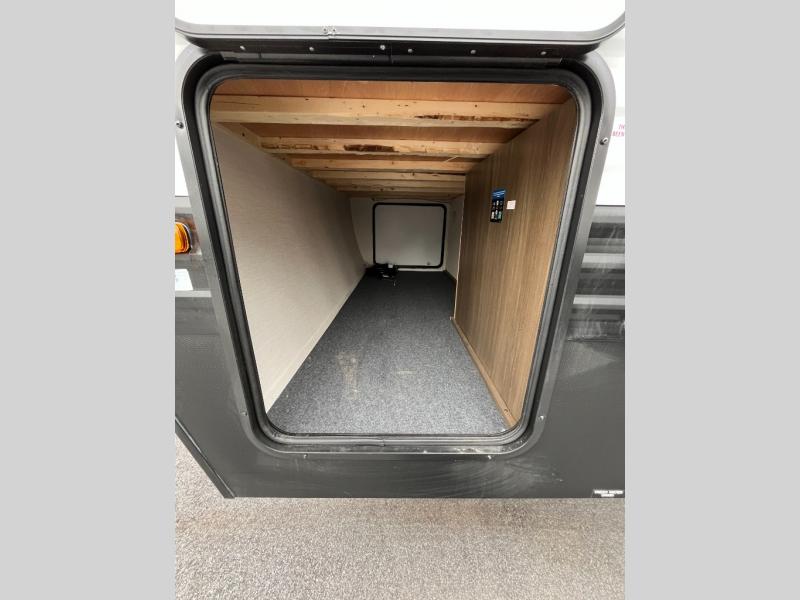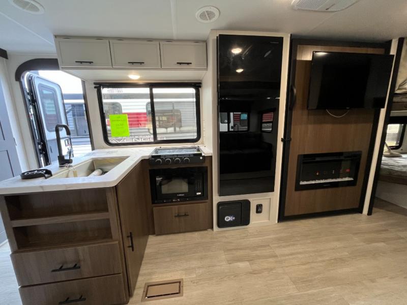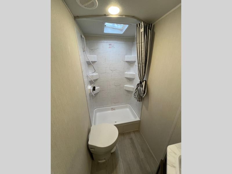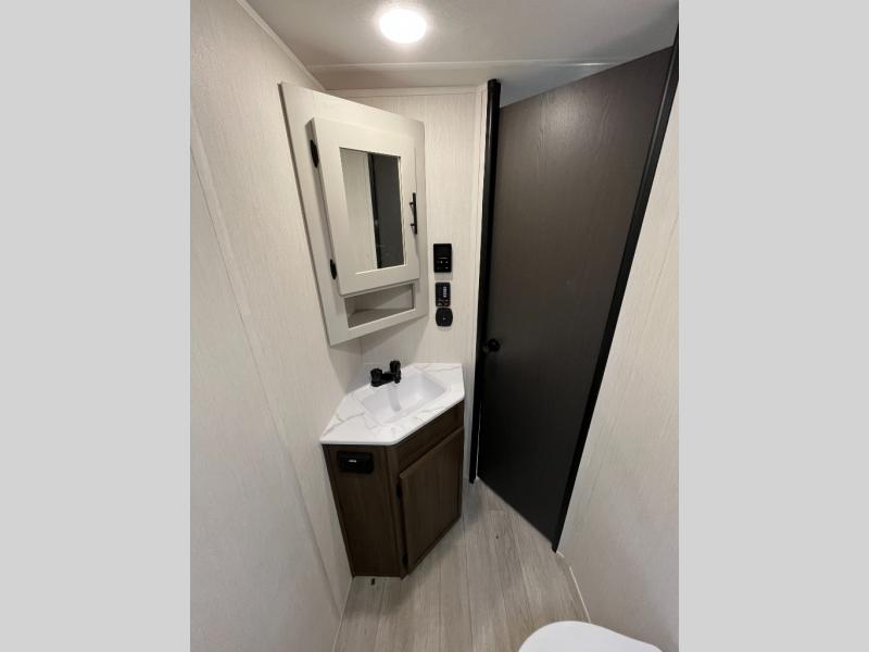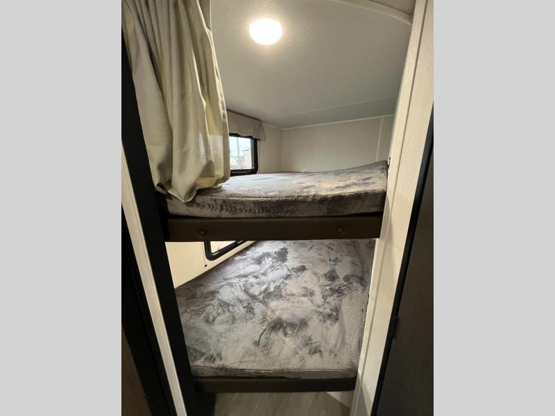 You'll appreciate the added space in this travel trailer thanks to the large slide out! The booth dinette and sofa are found here, and there is a moveable storage ottoman for extra blankets or board games. You'll have your own space up front in the private bedroom, complete with a camp king bed and storage for your things, while your guests take the double-size bunk beds towards the back. The chef of your group will find a three-burner cooktop and a built-in convection microwave with an air fryer to cook meals, plus there is a 12V refrigerator and large hidden pantry for food storage. This unit also includes a power awning outdoors and an outside refrigerator to keep cold drinks close by.