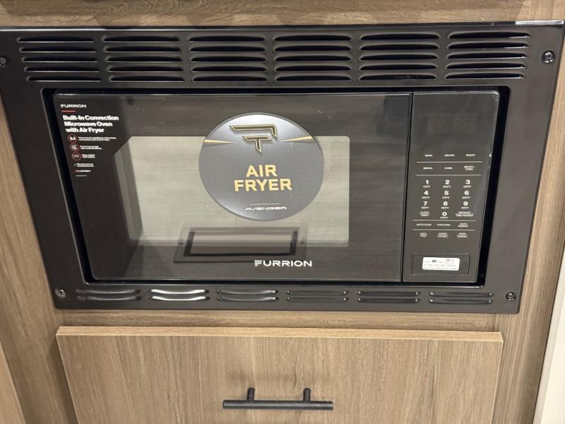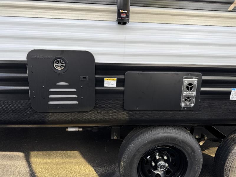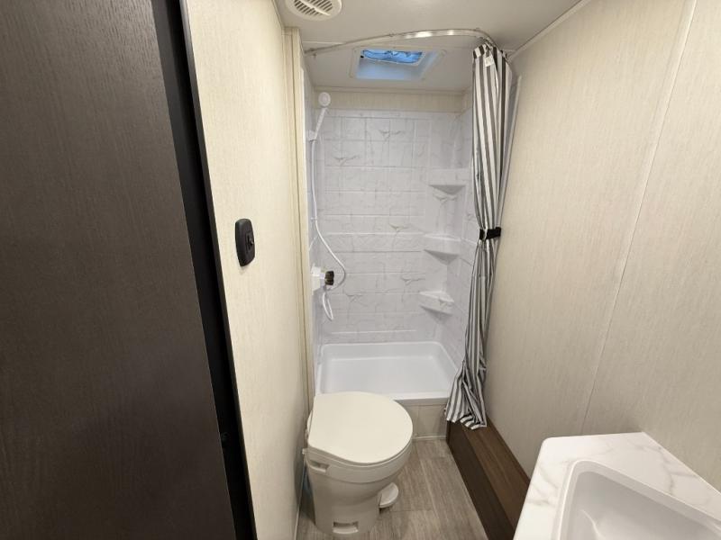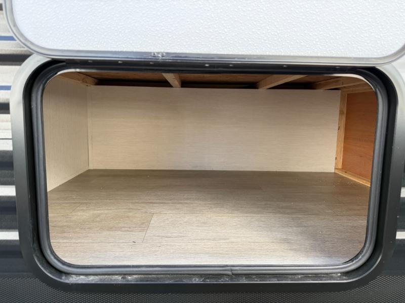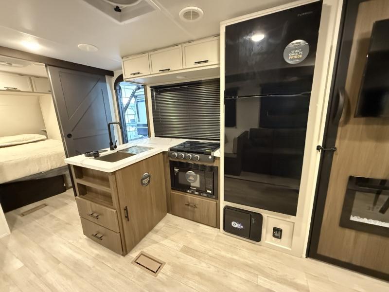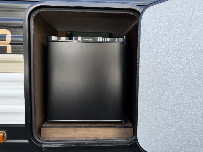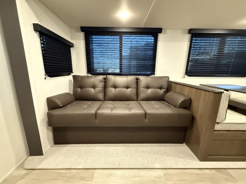 You'll appreciate the added space in this travel trailer thanks to the large slide out! The booth dinette and sofa are found here, and there is a moveable storage ottoman for extra blankets or board games. You'll have your own space up front in the private bedroom, complete with a camp king bed and storage for your things, while your guests take the double-size bunk beds towards the back. The chef of your group will find a three-burner cooktop and a built-in convection microwave with an air fryer to cook meals, plus there is a 12V refrigerator and large hidden pantry for food storage. This unit also includes a power awning outdoors and an outside refrigerator to keep cold drinks close by.