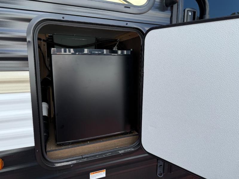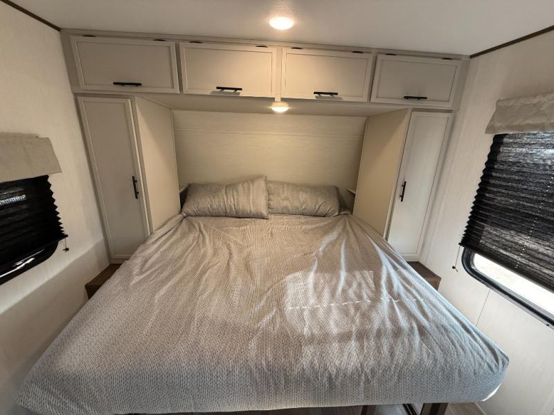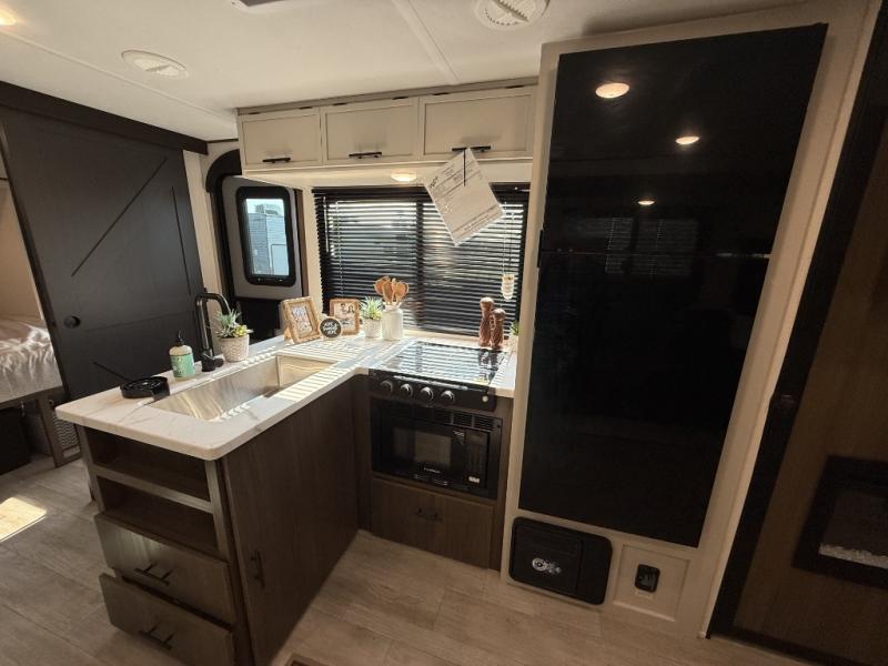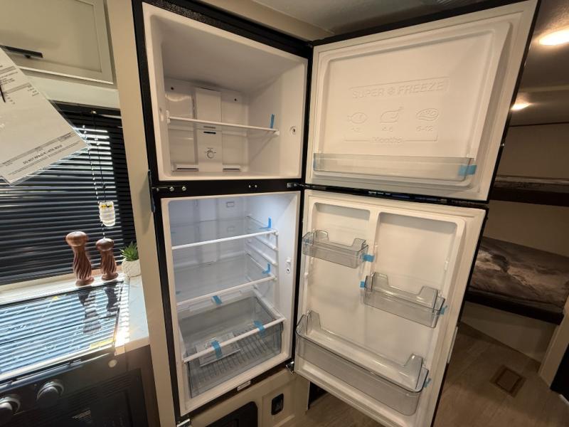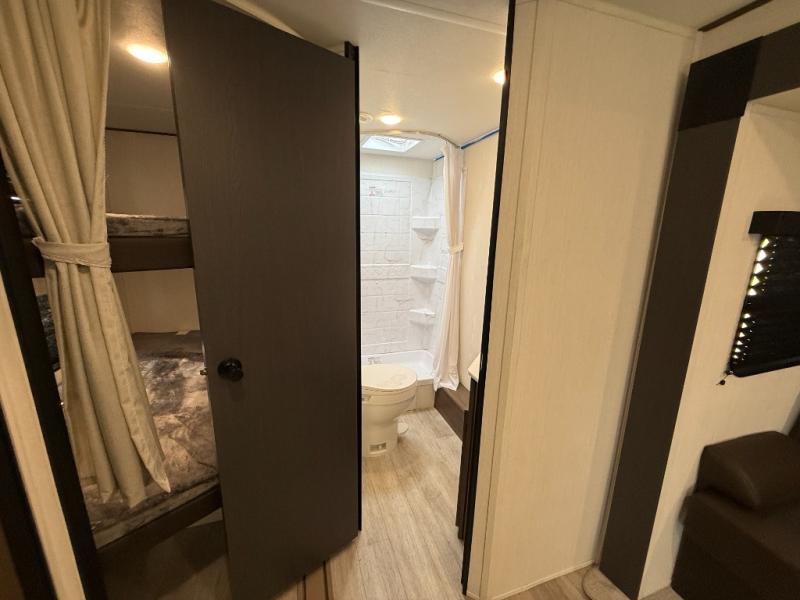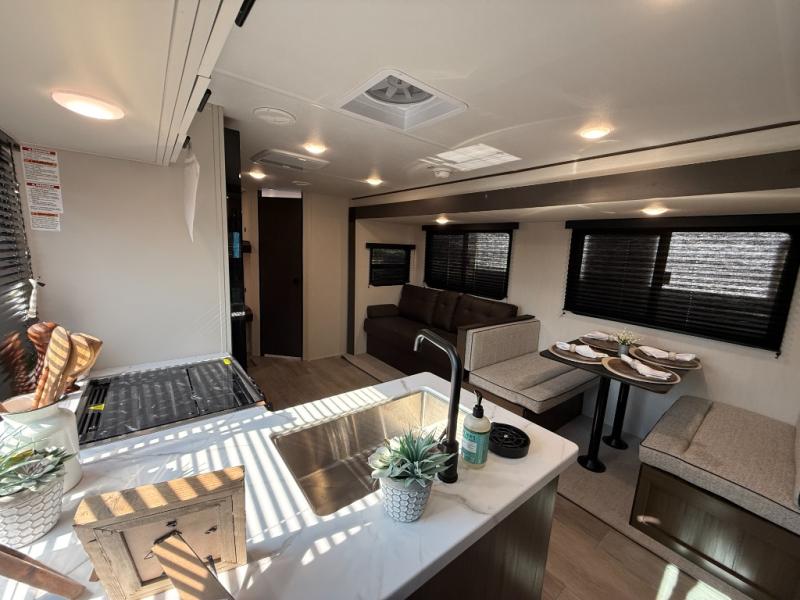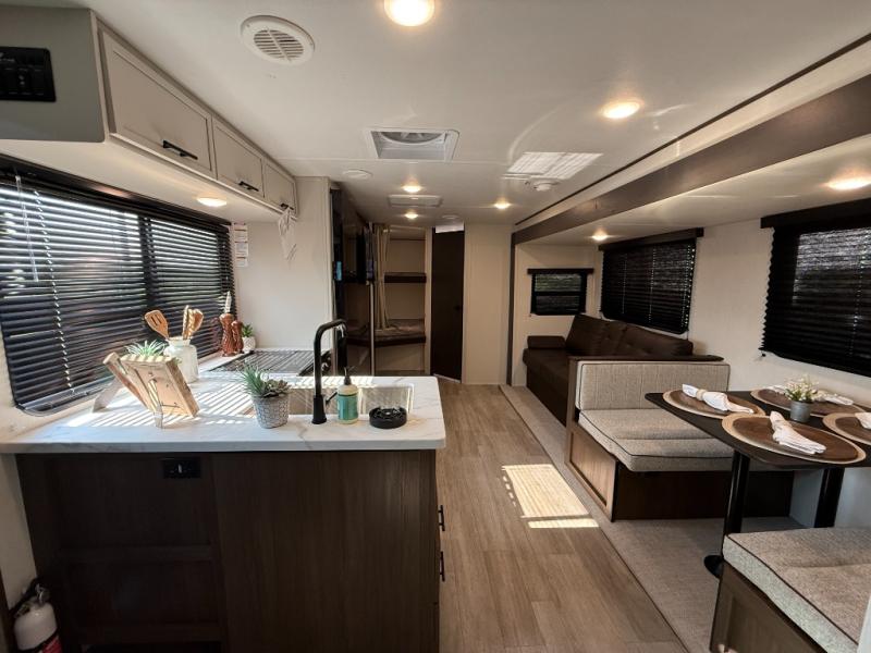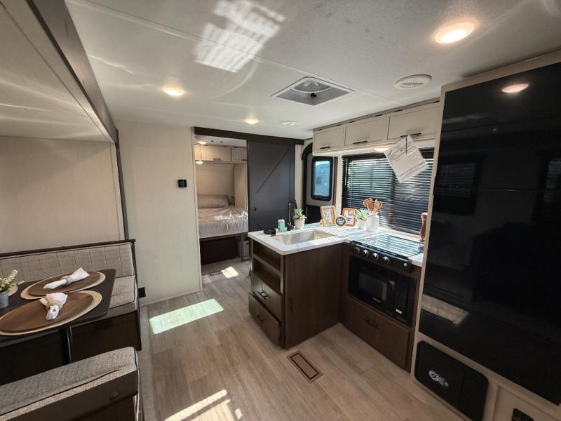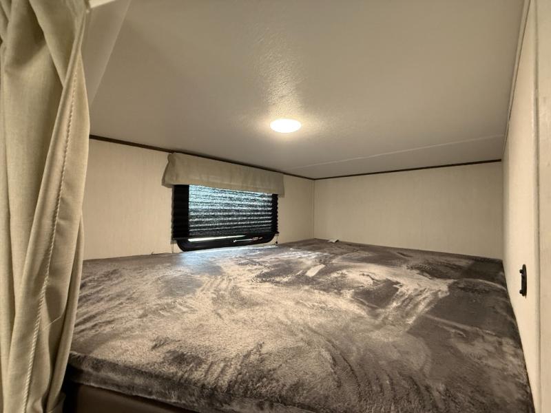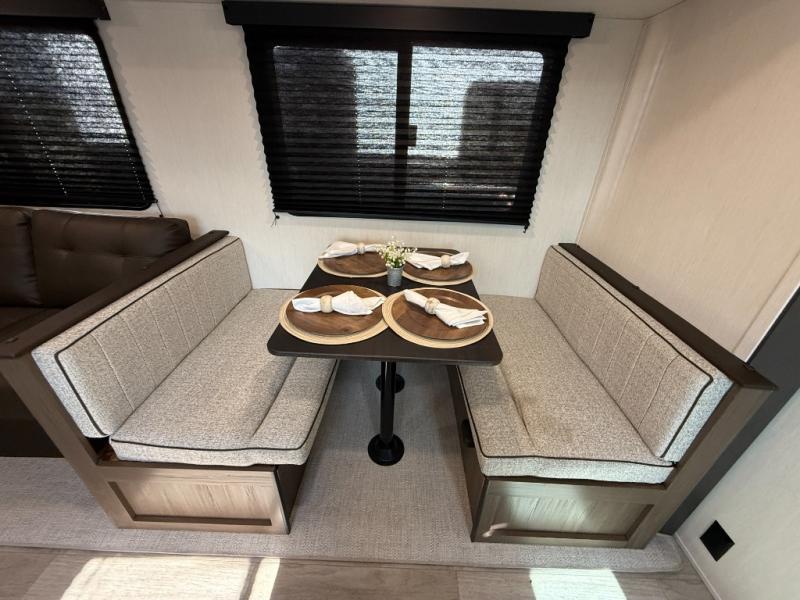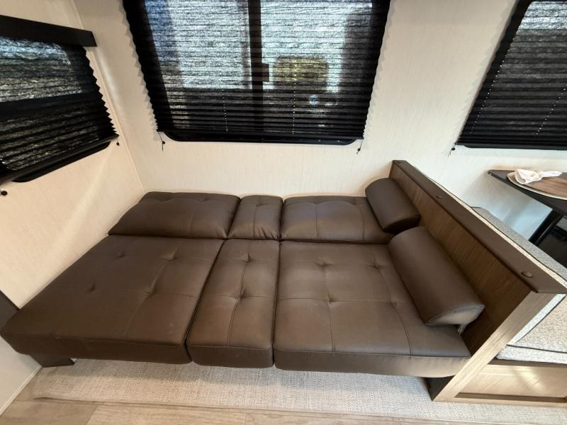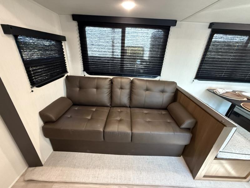You'll appreciate the added space in this travel trailer thanks to the large slide out! The booth dinette and sofa are found here, and there is a moveable storage ottoman for extra blankets or board games. You'll have your own space up front in the private bedroom, complete with a camp king bed and storage for your things, while your guests take the double-size bunk beds towards the back. The chef of your group will find a three-burner cooktop and a built-in convection microwave with an air fryer to cook meals, plus there is a 12V refrigerator and large hidden pantry for food storage. This unit also includes a power awning outdoors and an outside refrigerator to keep cold drinks close by.