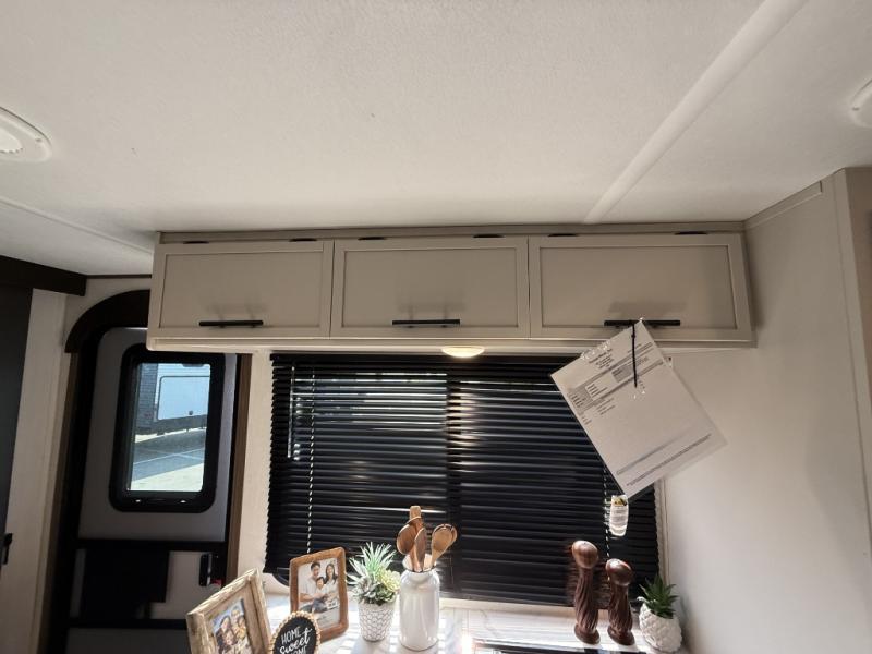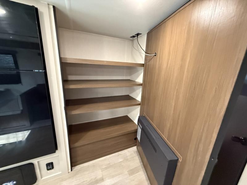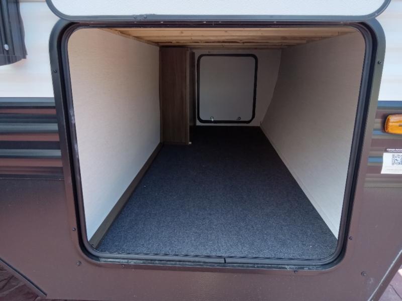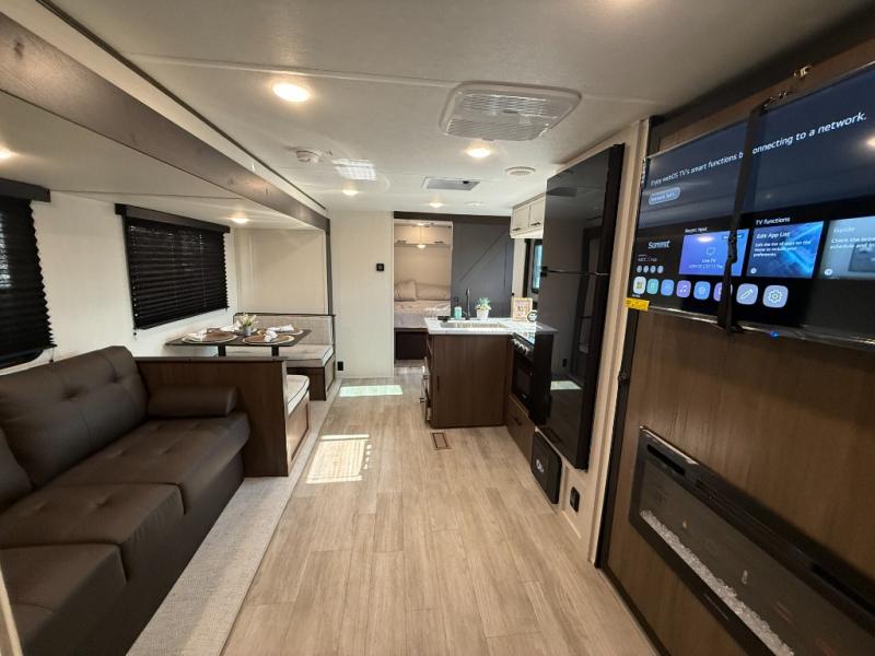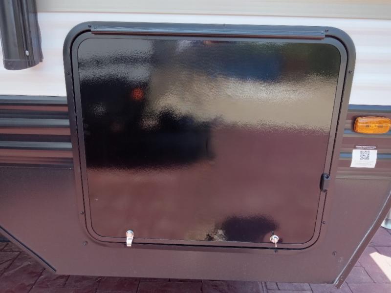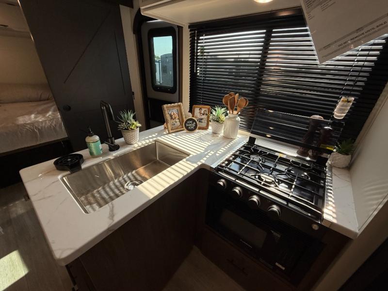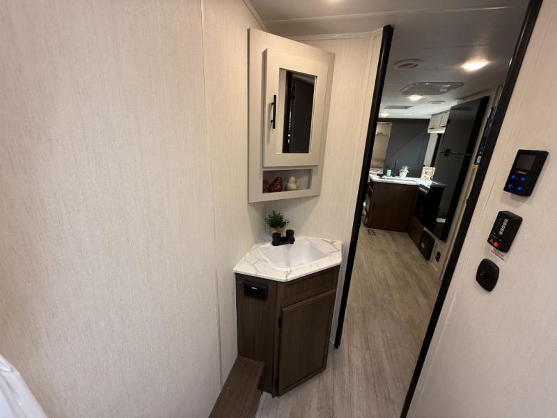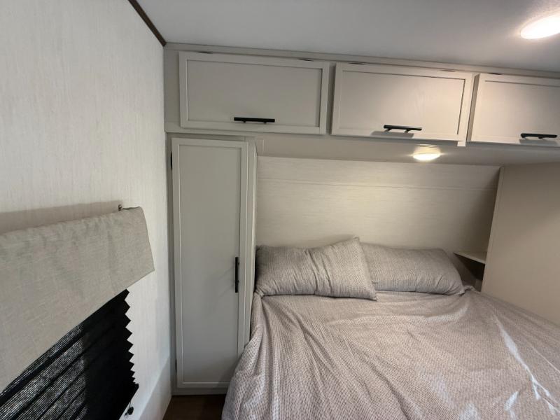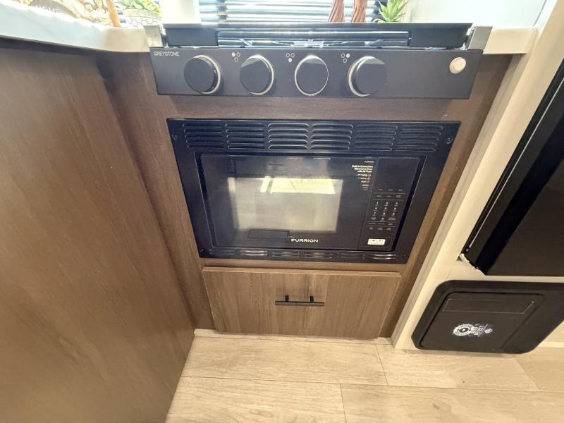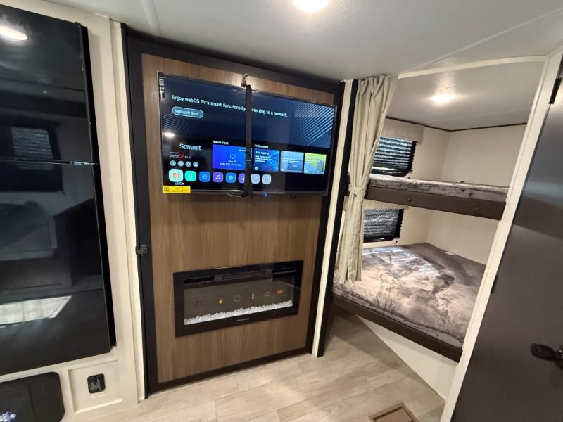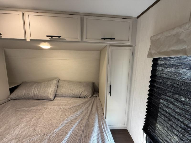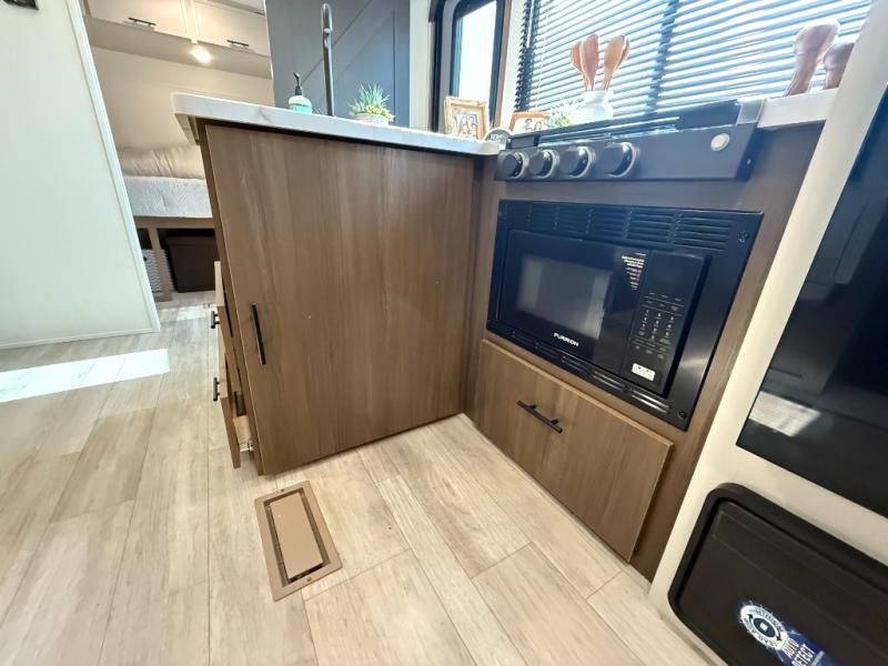 You'll appreciate the added space in this travel trailer thanks to the large slide out! The booth dinette and sofa are found here, and there is a moveable storage ottoman for extra blankets or board games. You'll have your own space up front in the private bedroom, complete with a camp king bed and storage for your things, while your guests take the double-size bunk beds towards the back. The chef of your group will find a three-burner cooktop and a built-in convection microwave with an air fryer to cook meals, plus there is a 12V refrigerator and large hidden pantry for food storage. This unit also includes a power awning outdoors and an outside refrigerator to keep cold drinks close by.