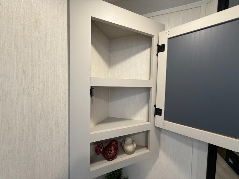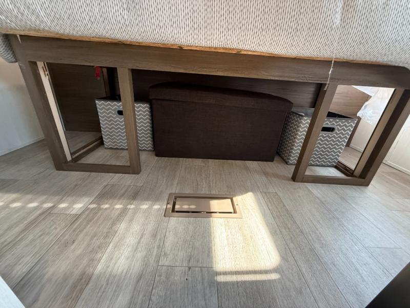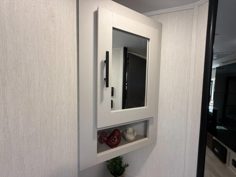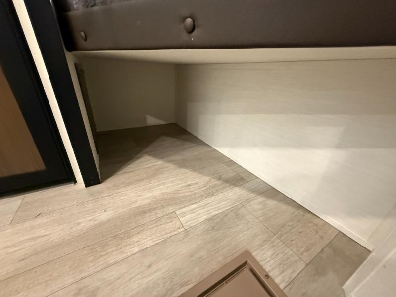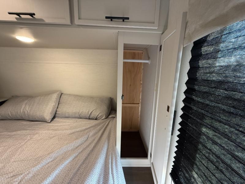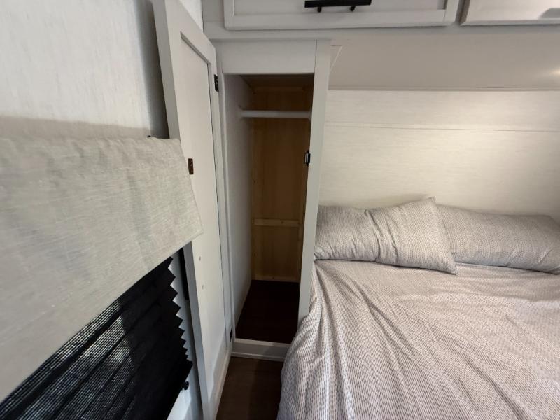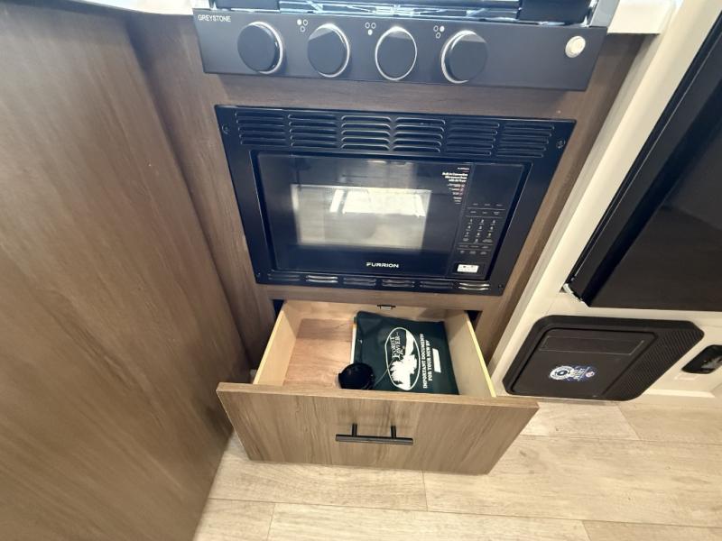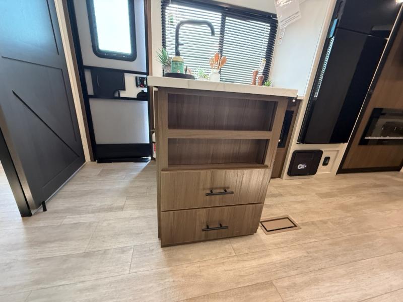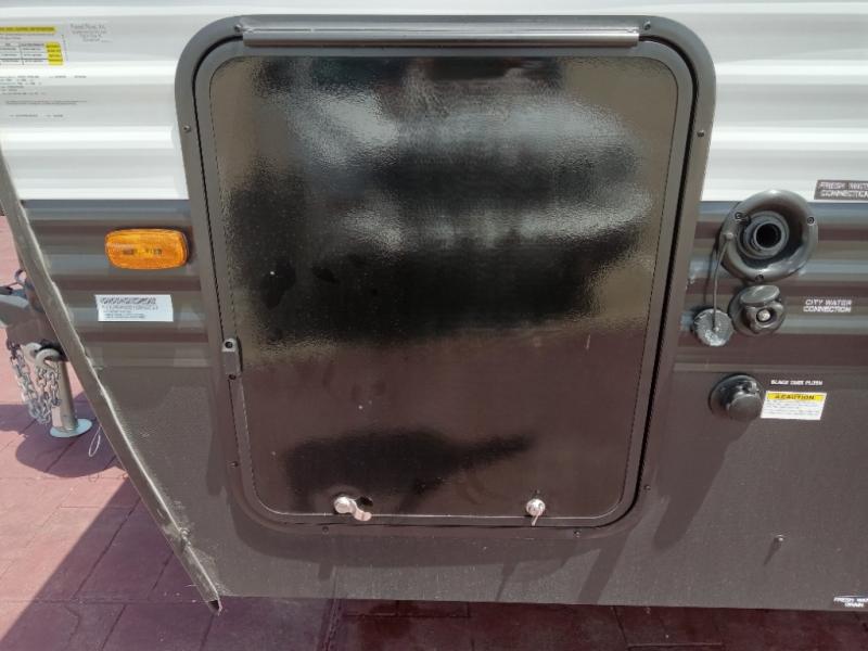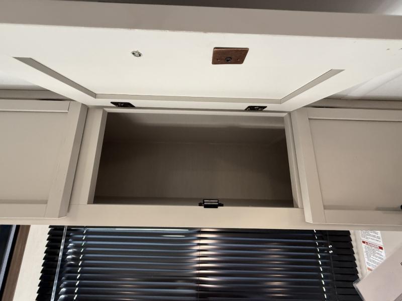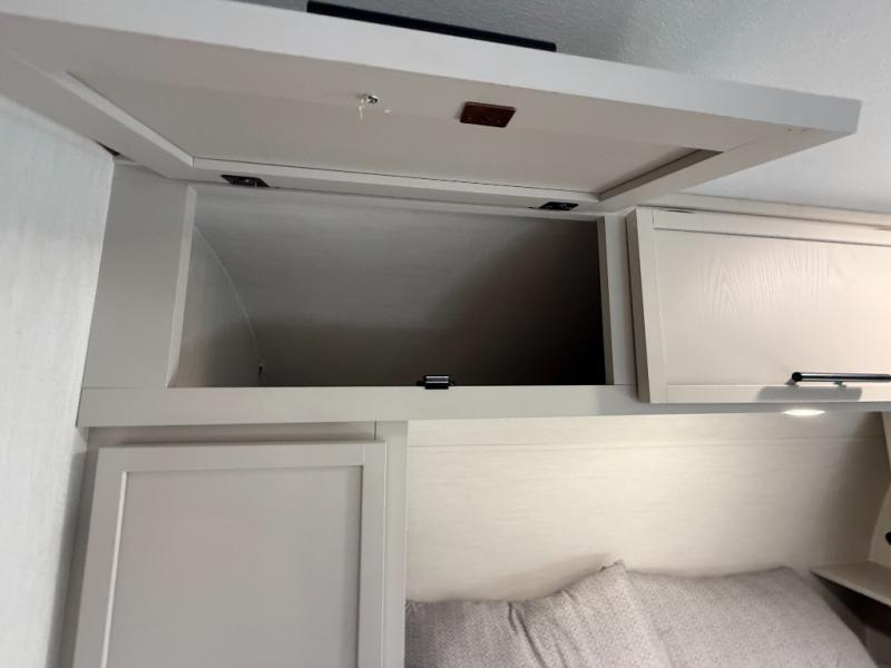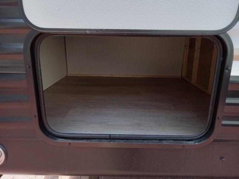 You'll appreciate the added space in this travel trailer thanks to the large slide out! The booth dinette and sofa are found here, and there is a moveable storage ottoman for extra blankets or board games. You'll have your own space up front in the private bedroom, complete with a camp king bed and storage for your things, while your guests take the double-size bunk beds towards the back. The chef of your group will find a three-burner cooktop and a built-in convection microwave with an air fryer to cook meals, plus there is a 12V refrigerator and large hidden pantry for food storage. This unit also includes a power awning outdoors and an outside refrigerator to keep cold drinks close by.