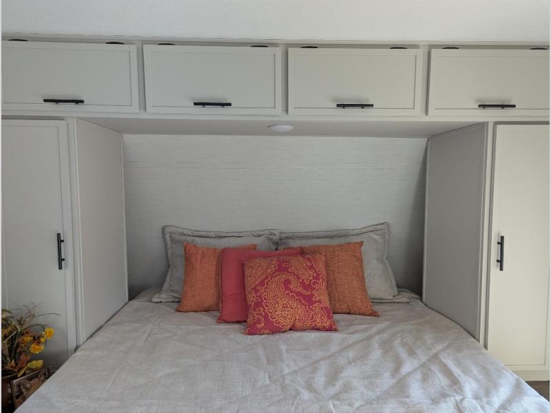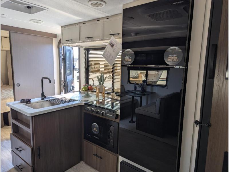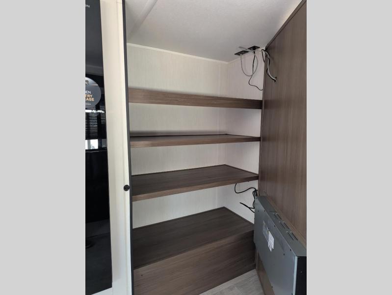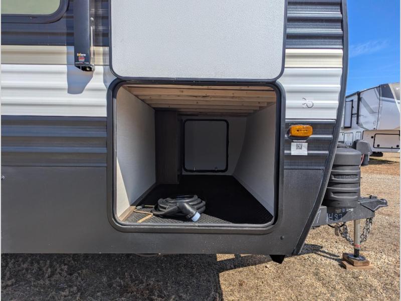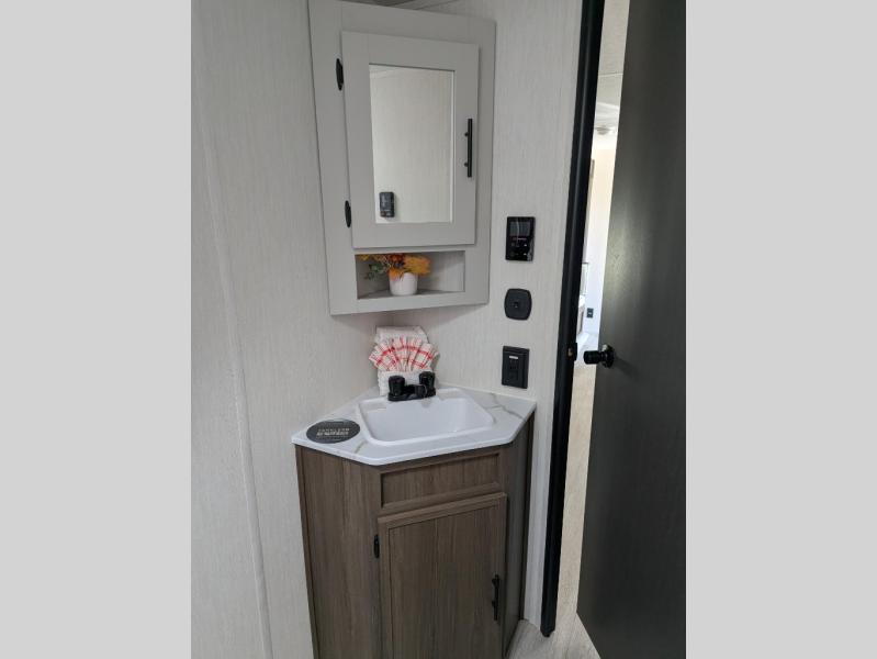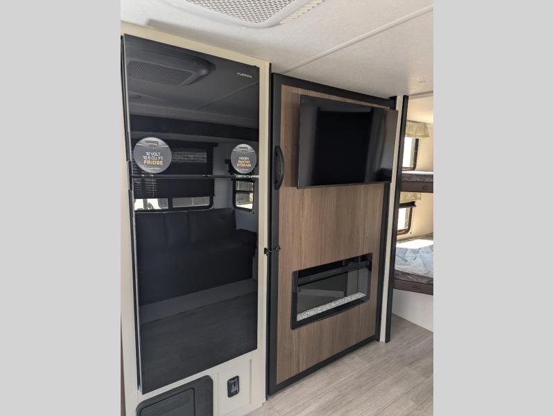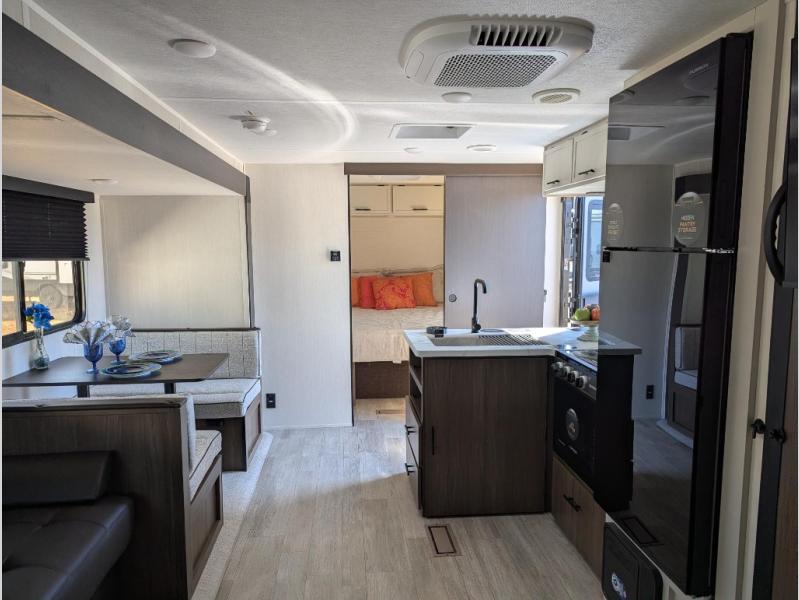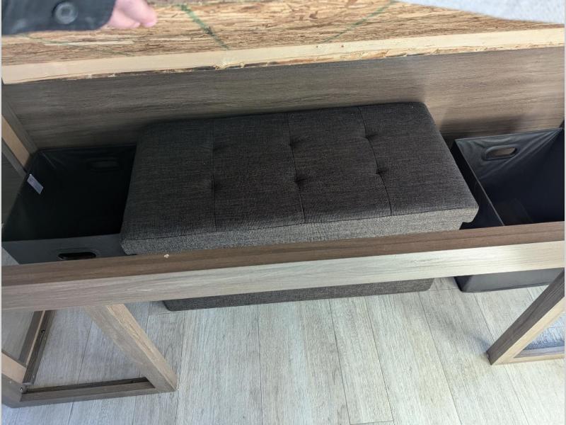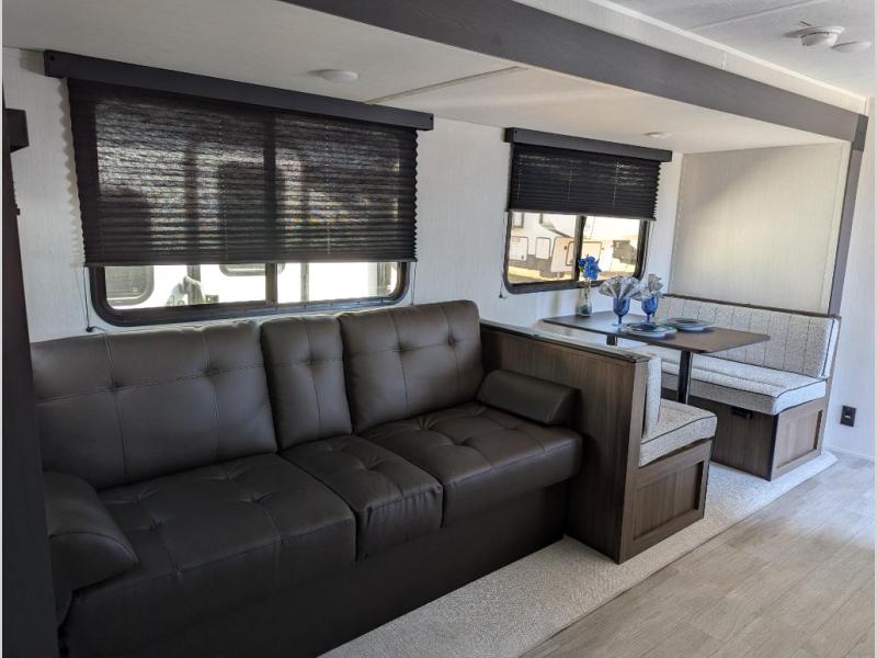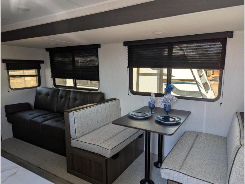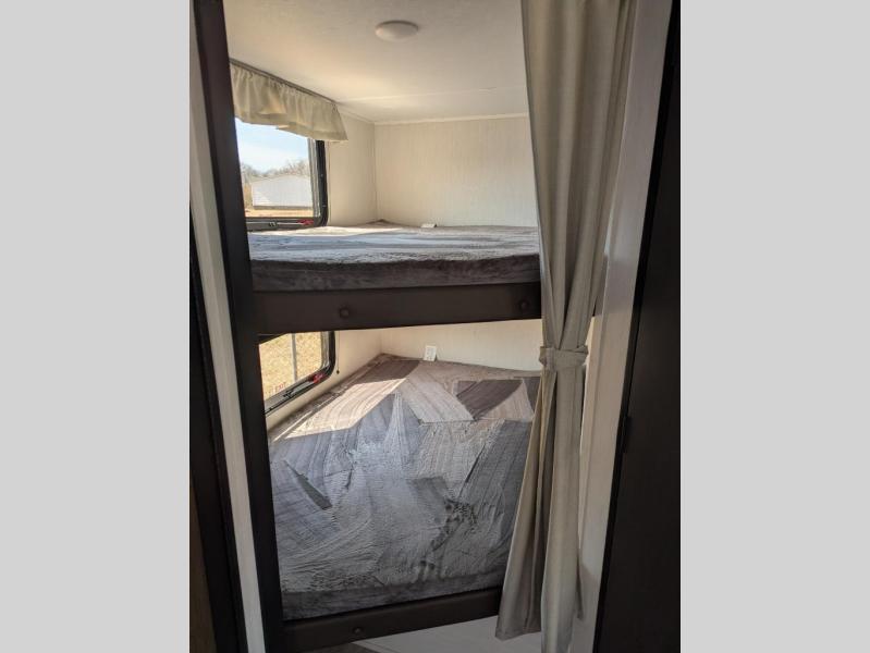 You'll appreciate the added space in this travel trailer thanks to the large slide out! The booth dinette and sofa are found here, and there is a moveable storage ottoman for extra blankets or board games. You'll have your own space up front in the private bedroom, complete with a camp king bed and storage for your things, while your guests take the double-size bunk beds towards the back. The chef of your group will find a three-burner cooktop and a built-in convection microwave with an air fryer to cook meals, plus there is a 12V refrigerator and large hidden pantry for food storage. This unit also includes a power awning outdoors and an outside refrigerator to keep cold drinks close by.