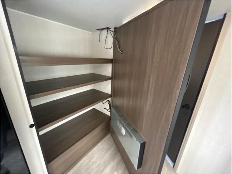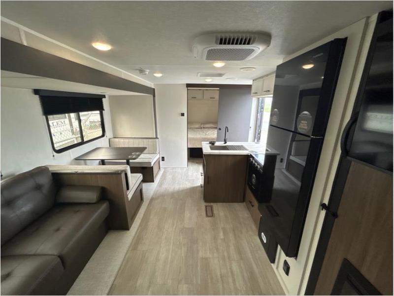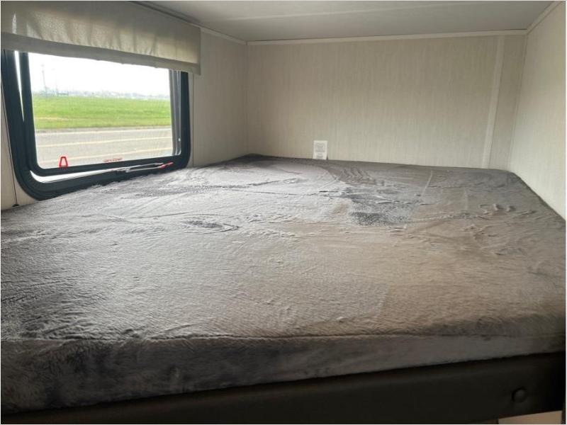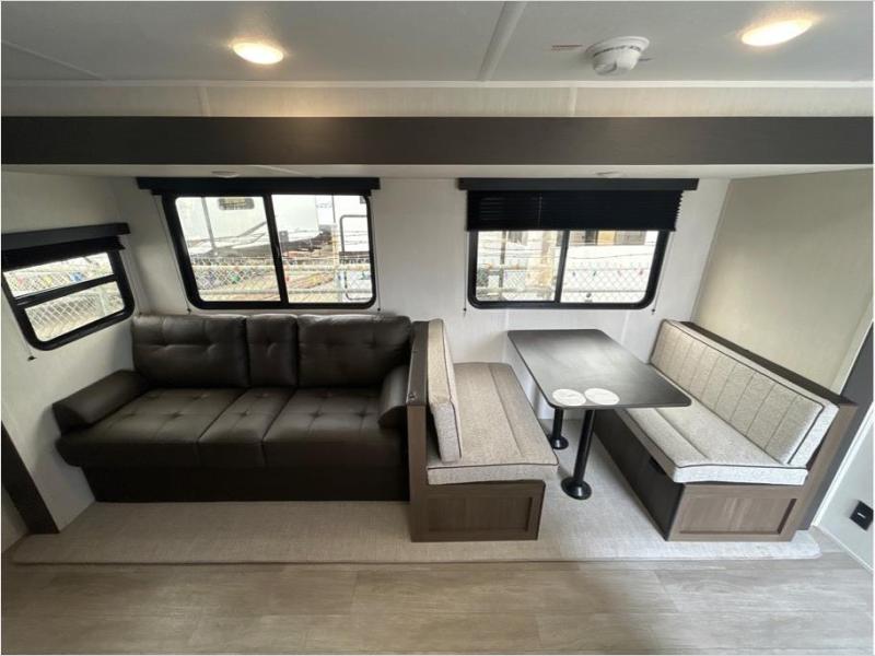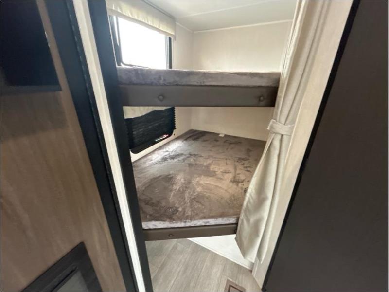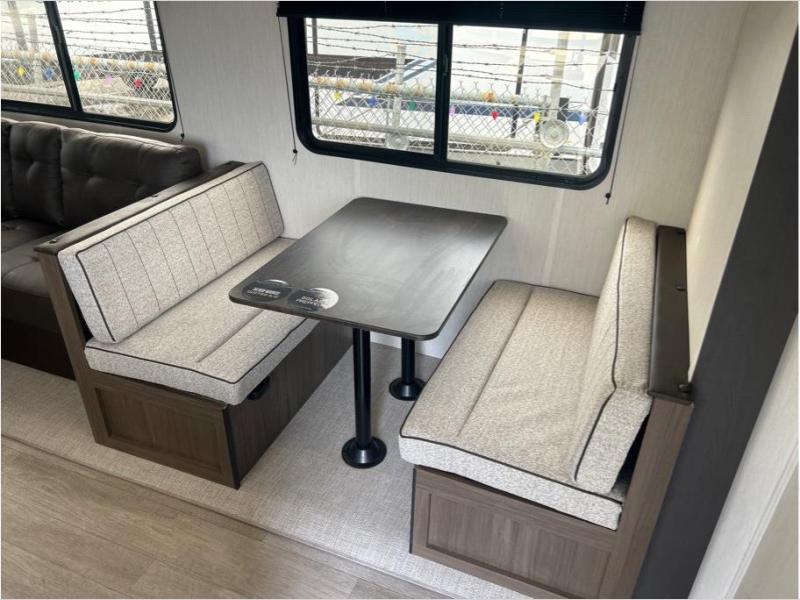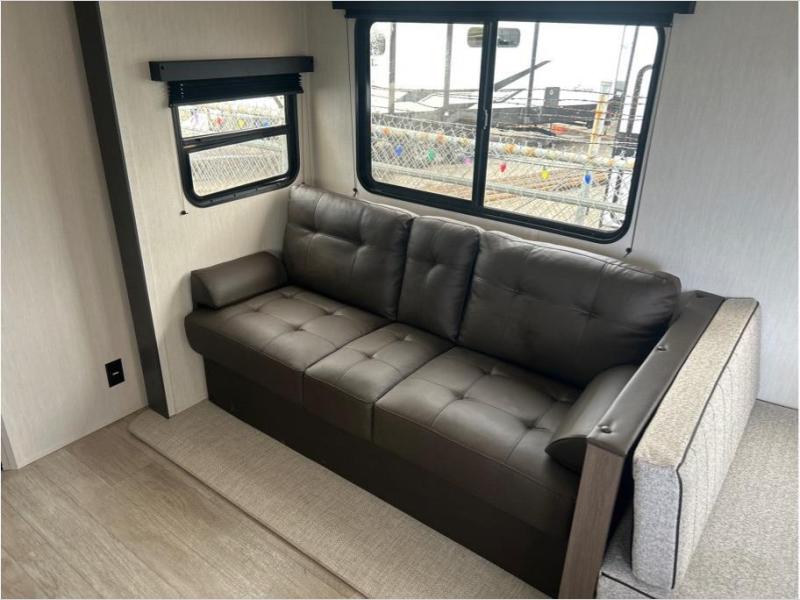 You'll appreciate the added space in this travel trailer thanks to the large slide out! The booth dinette and sofa are found here, and there is a moveable storage ottoman for extra blankets or board games. You'll have your own space up front in the private bedroom, complete with a camp king bed and storage for your things, while your guests take the double-size bunk beds towards the back. The chef of your group will find a three-burner cooktop and a built-in convection microwave with an air fryer to cook meals, plus there is a 12V refrigerator and large hidden pantry for food storage. This unit also includes a power awning outdoors and an outside refrigerator to keep cold drinks close by.