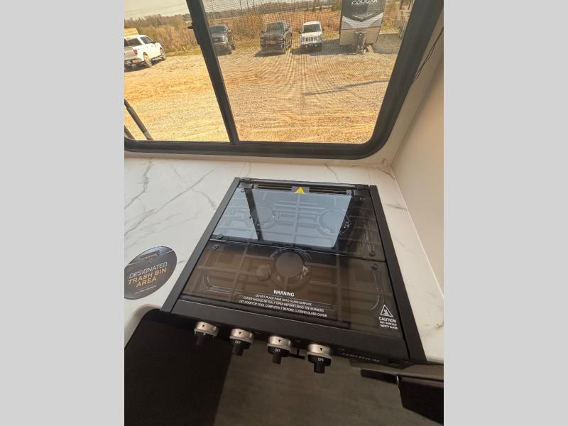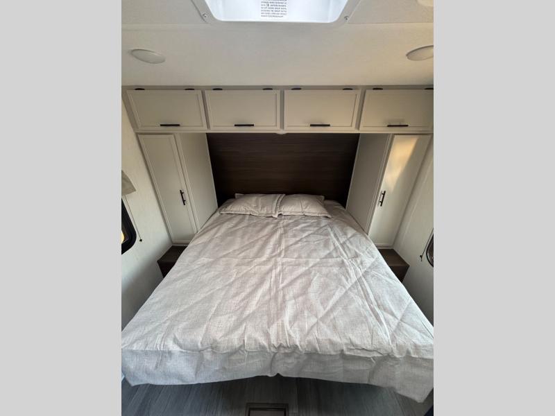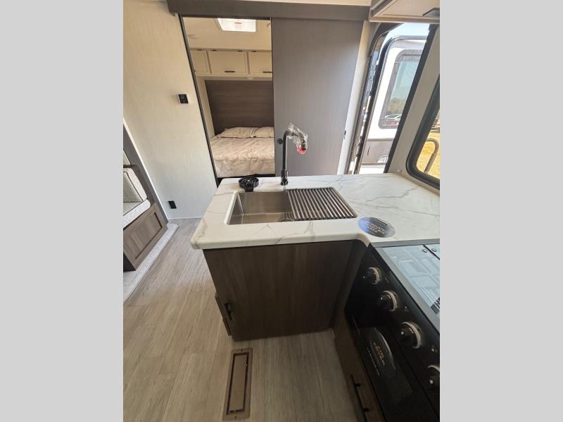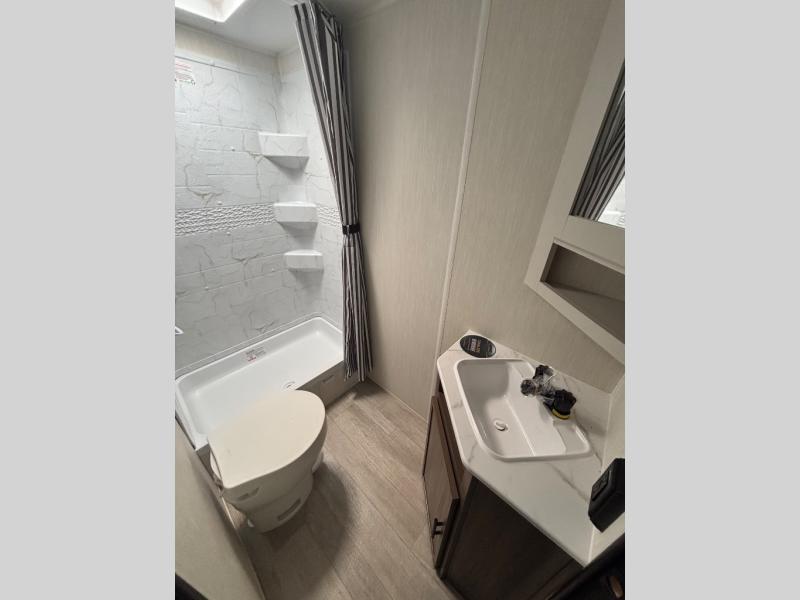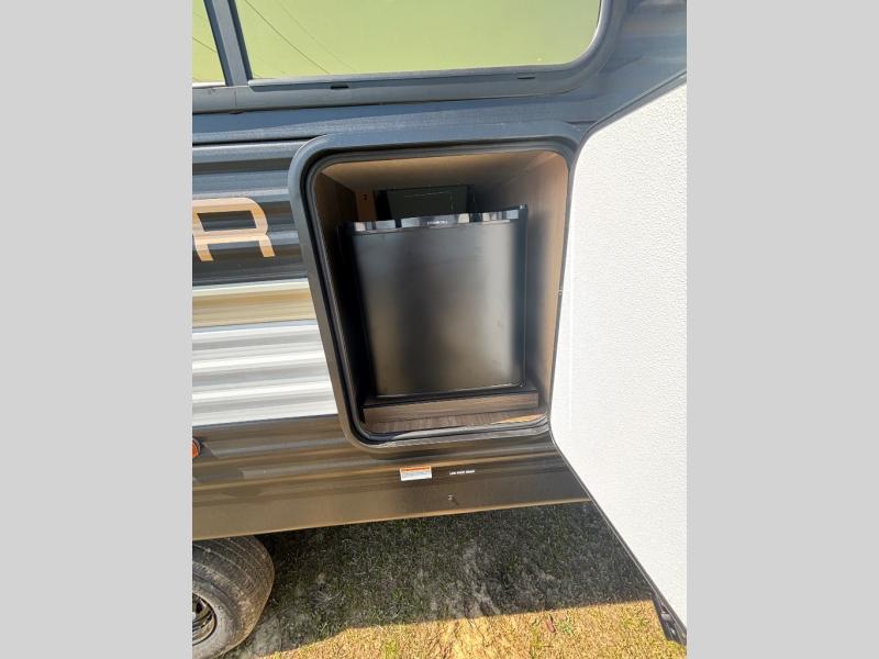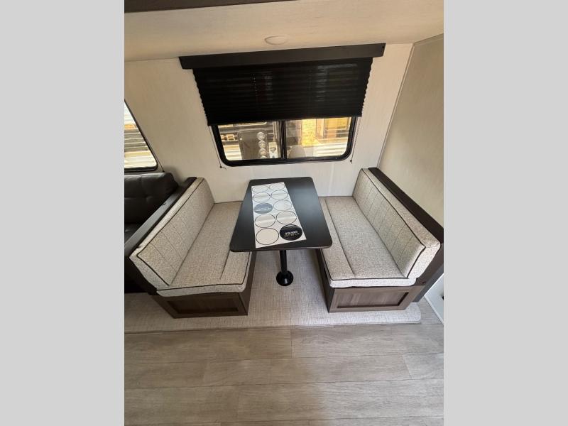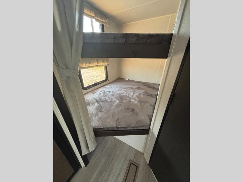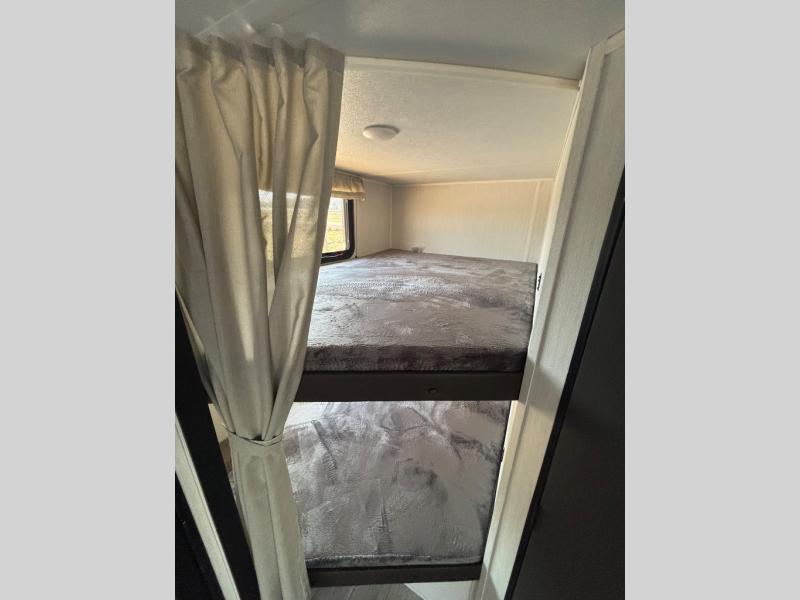 You'll appreciate the added space in this travel trailer thanks to the large slide out! The booth dinette and sofa are found here, and there is a moveable storage ottoman for extra blankets or board games. You'll have your own space up front in the private bedroom, complete with a camp king bed and storage for your things, while your guests take the double-size bunk beds towards the back. The chef of your group will find a three-burner cooktop and a built-in convection microwave with an air fryer to cook meals, plus there is a 12V refrigerator and large hidden pantry for food storage. This unit also includes a power awning outdoors and an outside refrigerator to keep cold drinks close by.