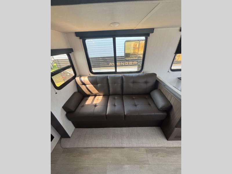 With any Avenger travel trailer by Prime Time RV, you will find innovation, a solid build, and comfort at every turn. Each model is built with Tuff Coat on the exterior metal, a fully enclosed underbelly, and a PVC roof membrane to help extend the life of your trailer. You will also find automotive name badging on the exterior, along with an exterior shower, front rail LED light strips, plus an XL padded entry grab handle to name a few conveniences. There are plenty of storage spaces inside, as well as Congoleum flooring and woven PVC marine grade slide out flooring, a designer shower surround, and seamless pressed countertops. You are sure to appreciate the onboard water filtration system, tankless water heater, plus 30K BTU furnace and 15K ducted A/C to help keep you comfortable.