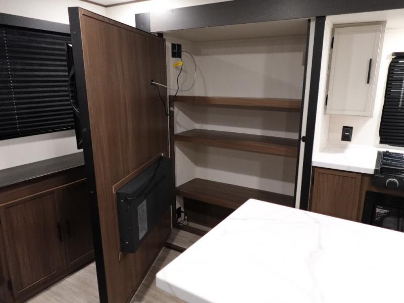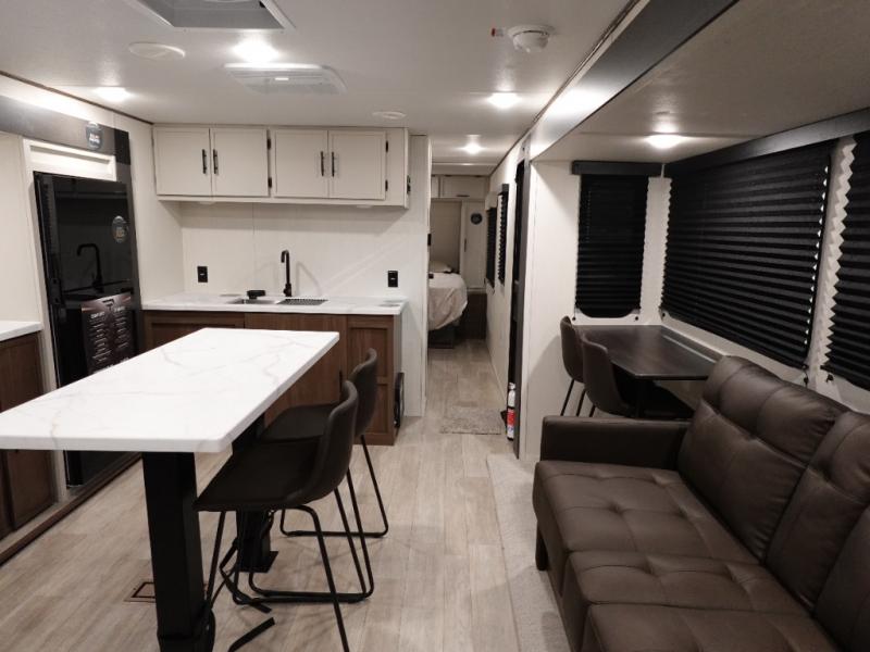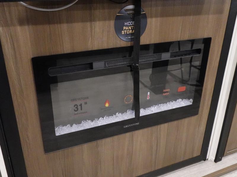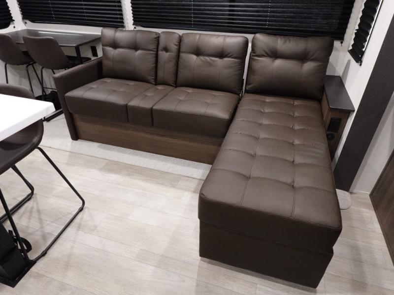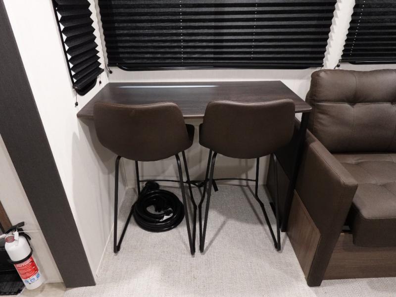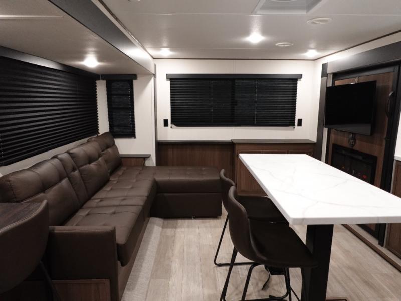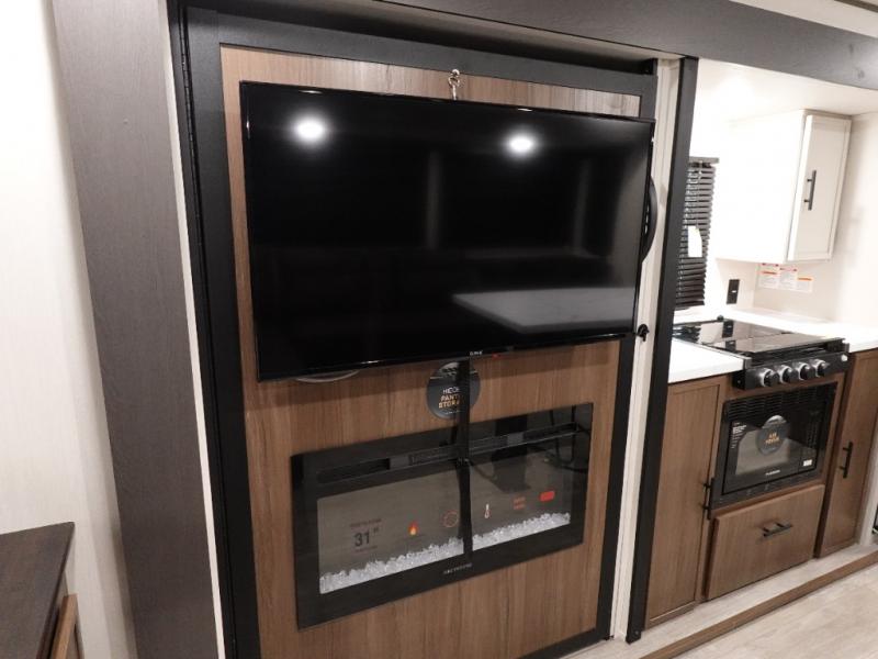 There is ample space to move about in this travel trailer thanks to the dual opposing slides! Here, you'll find an L-shaped sofa with a chaise lounge in direct view of TV and fireplace. There is also a hidden pantry behind the TV for snacks and movies! The center farm table includes four stools so you can gather around for meal times, and the desk with a chair will provide a place for you to get some work done if needed. This unit features a full bath towards the front private bedroom for easy access at night, and you're sure to get a great night's rest on the camp king bed!