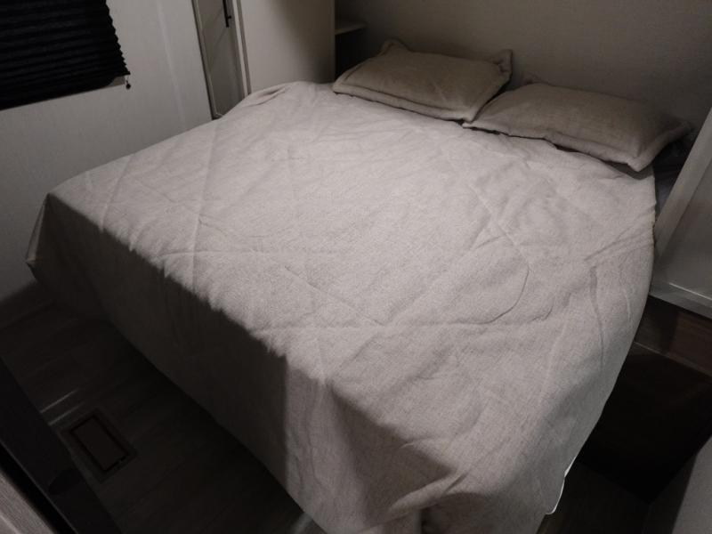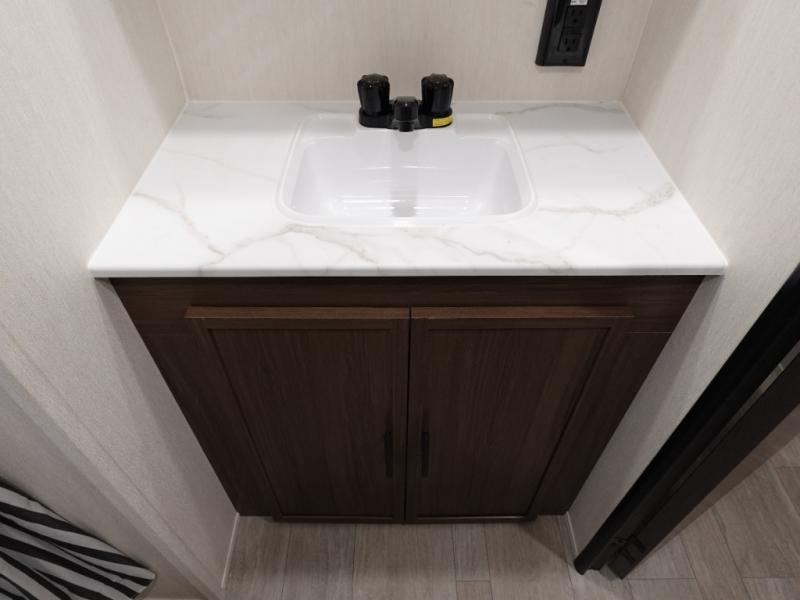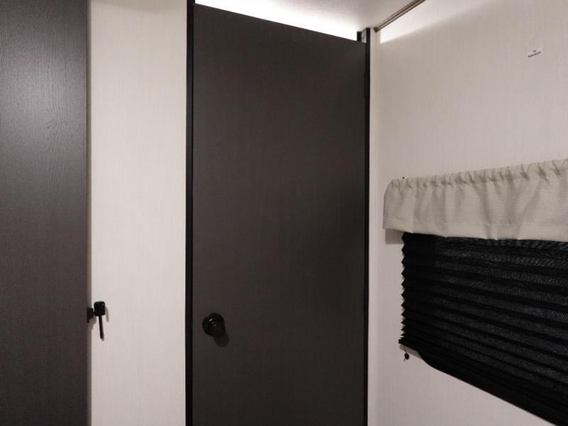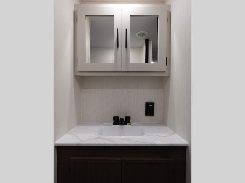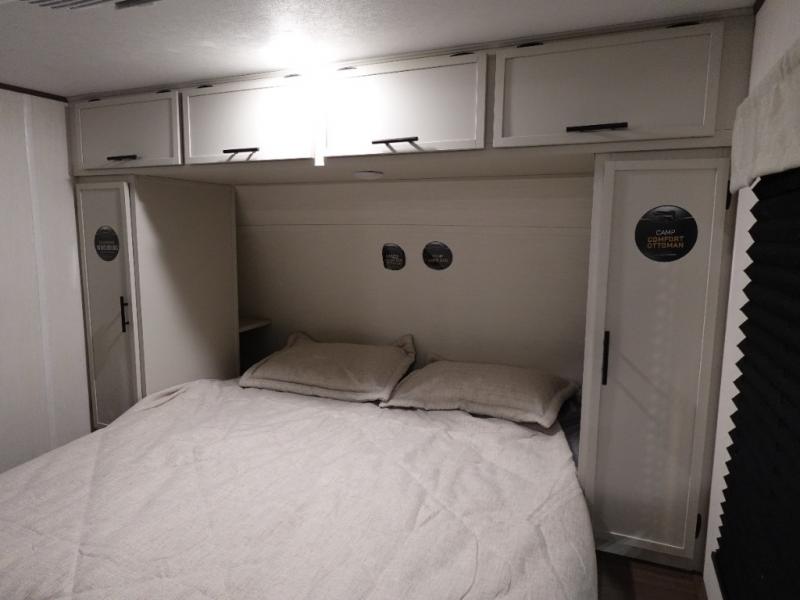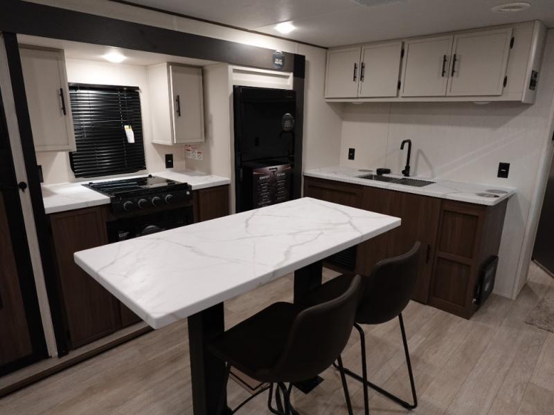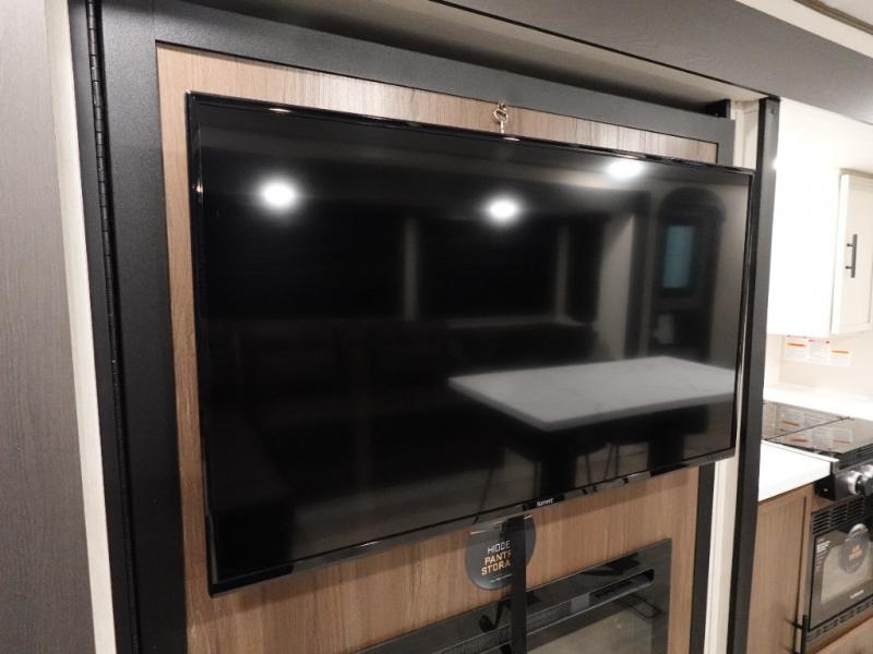 There is ample space to move about in this travel trailer thanks to the dual opposing slides! Here, you'll find an L-shaped sofa with a chaise lounge in direct view of TV and fireplace. There is also a hidden pantry behind the TV for snacks and movies! The center farm table includes four stools so you can gather around for meal times, and the desk with a chair will provide a place for you to get some work done if needed. This unit features a full bath towards the front private bedroom for easy access at night, and you're sure to get a great night's rest on the camp king bed!
