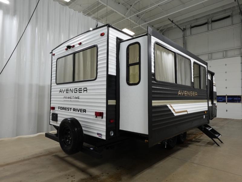 With any Avenger travel trailer by Prime Time RV, you will find innovation, a solid build, and comfort at every turn. Each model is built with Tuff Coat on the exterior metal, a fully enclosed underbelly, and a PVC roof membrane to help extend the life of your trailer. You will also find automotive name badging on the exterior, along with an exterior shower, front rail LED light strips, plus an XL padded entry grab handle to name a few conveniences. There are plenty of storage spaces inside, as well as Congoleum flooring and woven PVC marine grade slide out flooring, a designer shower surround, and seamless pressed countertops. You are sure to appreciate the onboard water filtration system, tankless water heater, plus 30K BTU furnace and 15K ducted A/C to help keep you comfortable.