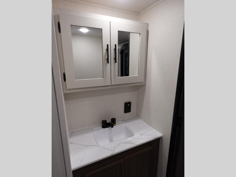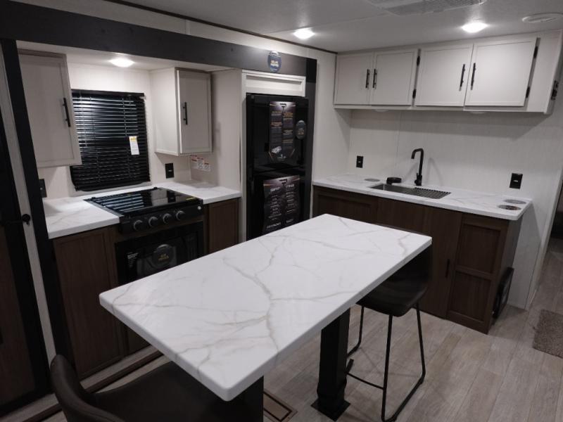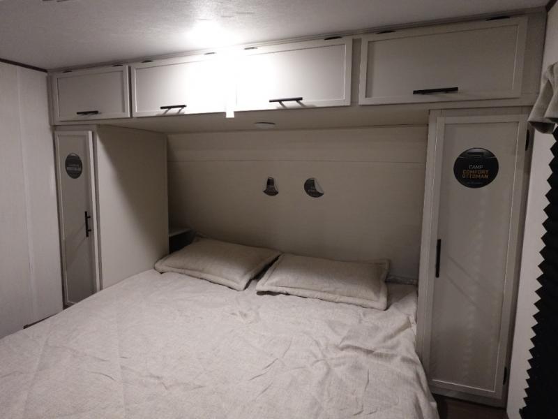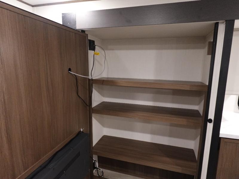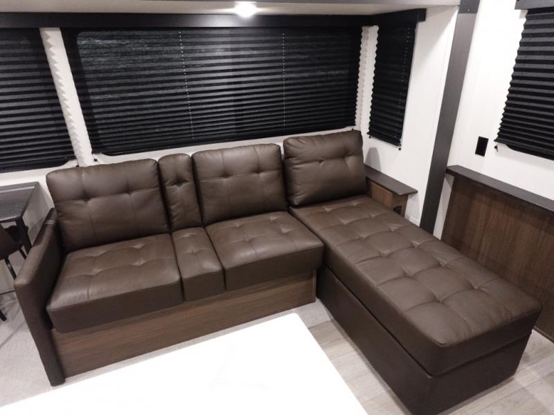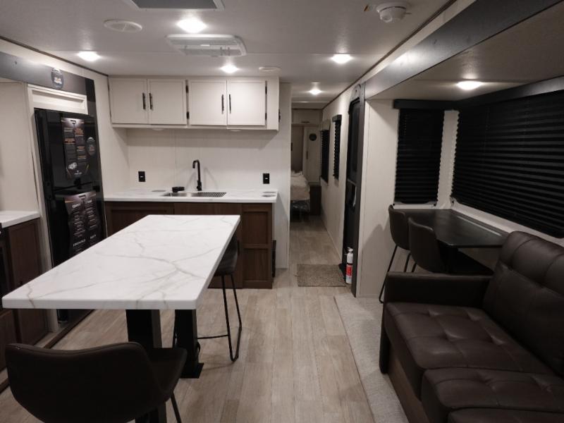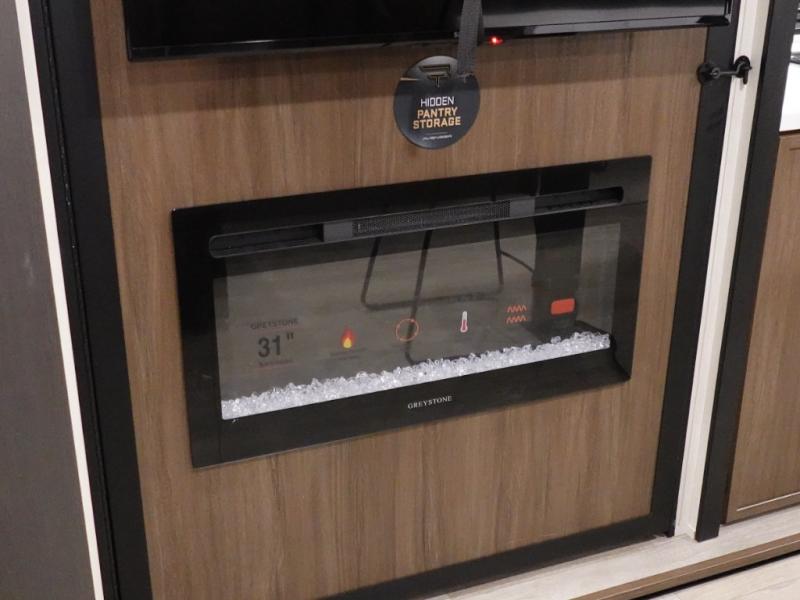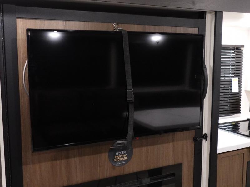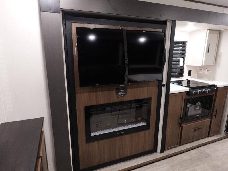 There is ample space to move about in this travel trailer thanks to the dual opposing slides! Here, you'll find an L-shaped sofa with a chaise lounge in direct view of TV and fireplace. There is also a hidden pantry behind the TV for snacks and movies! The center farm table includes four stools so you can gather around for meal times, and the desk with a chair will provide a place for you to get some work done if needed. This unit features a full bath towards the front private bedroom for easy access at night, and you're sure to get a great night's rest on the camp king bed!