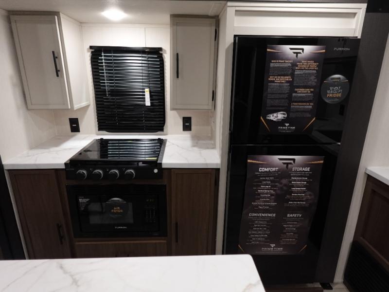 With any Avenger travel trailer by Prime Time RV, you will find innovation, a solid build, and comfort at every turn. Each model is built with Tuff Coat on the exterior metal, a fully enclosed underbelly, and a PVC roof membrane to help extend the life of your trailer. You will also find automotive name badging on the exterior, along with an exterior shower, front rail LED light strips, plus an XL padded entry grab handle to name a few conveniences. There are plenty of storage spaces inside, as well as Congoleum flooring and woven PVC marine grade slide out flooring, a designer shower surround, and seamless pressed countertops. You are sure to appreciate the onboard water filtration system, tankless water heater, plus 30K BTU furnace and 15K ducted A/C to help keep you comfortable.