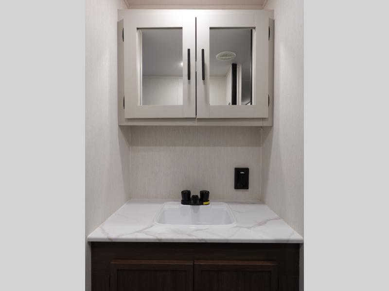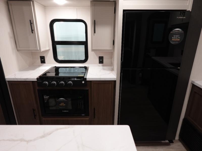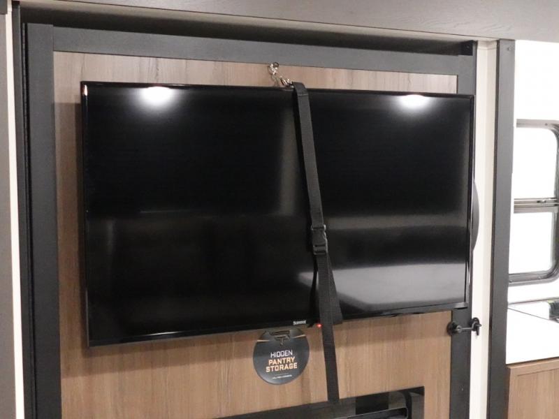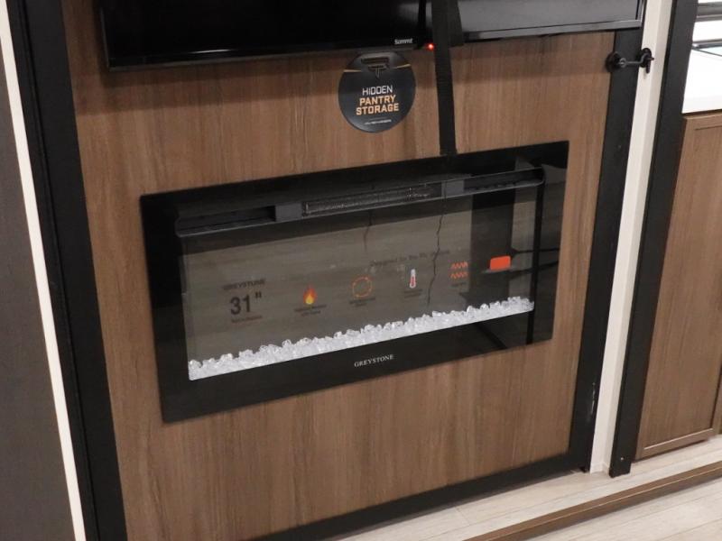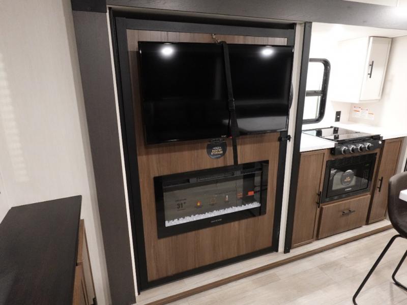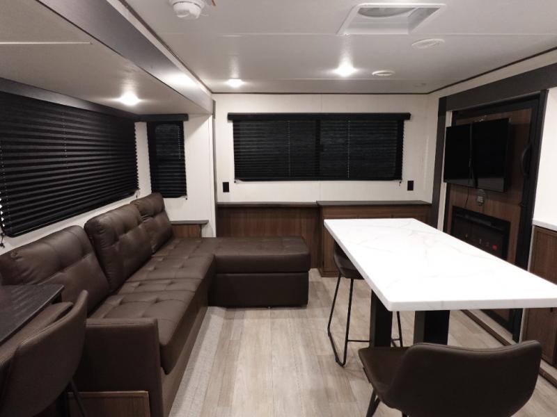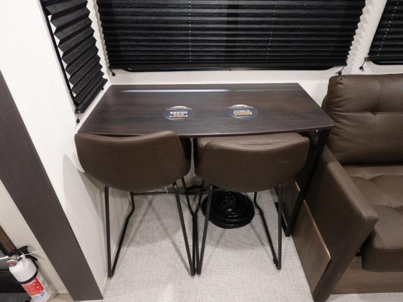 There is ample space to move about in this travel trailer thanks to the dual opposing slides! Here, you'll find an L-shaped sofa with a chaise lounge in direct view of TV and fireplace. There is also a hidden pantry behind the TV for snacks and movies! The center farm table includes four stools so you can gather around for meal times, and the desk with a chair will provide a place for you to get some work done if needed. This unit features a full bath towards the front private bedroom for easy access at night, and you're sure to get a great night's rest on the camp king bed!