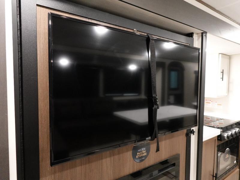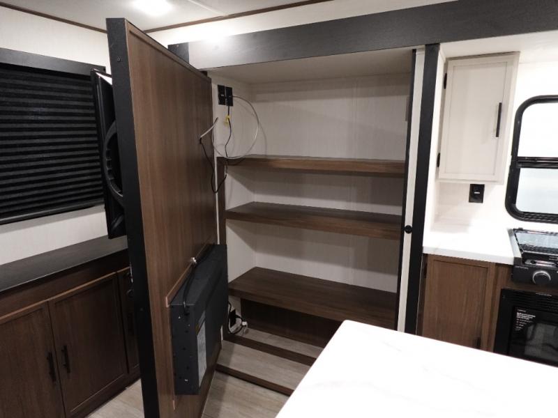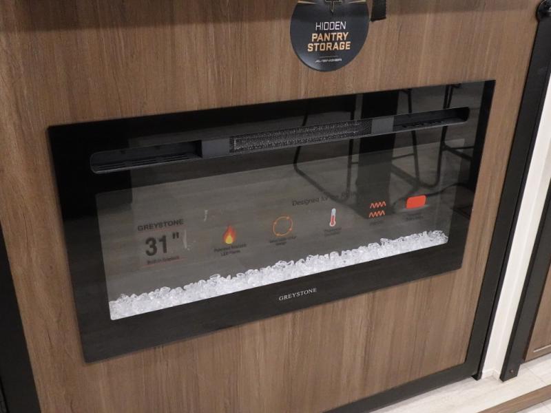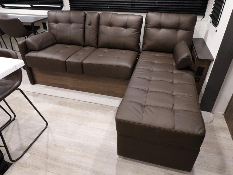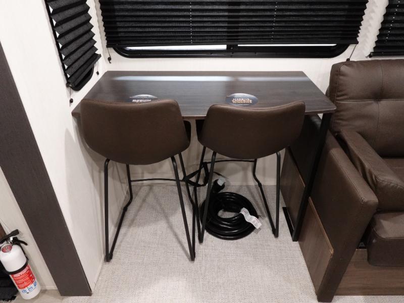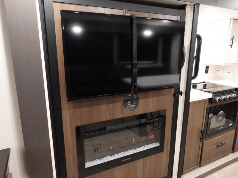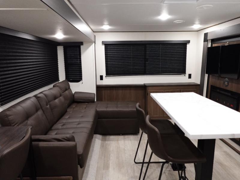 There is ample space to move about in this travel trailer thanks to the dual opposing slides! Here, you'll find an L-shaped sofa with a chaise lounge in direct view of TV and fireplace. There is also a hidden pantry behind the TV for snacks and movies! The center farm table includes four stools so you can gather around for meal times, and the desk with a chair will provide a place for you to get some work done if needed. This unit features a full bath towards the front private bedroom for easy access at night, and you're sure to get a great night's rest on the camp king bed!