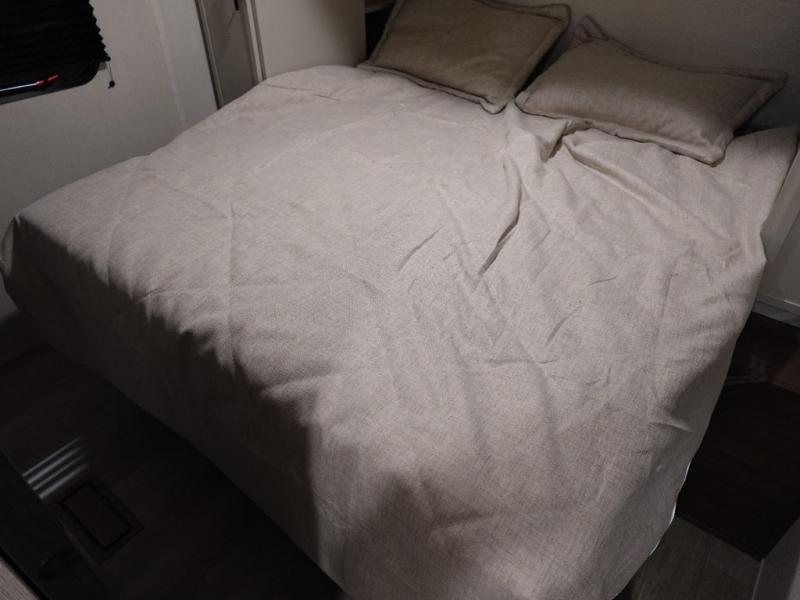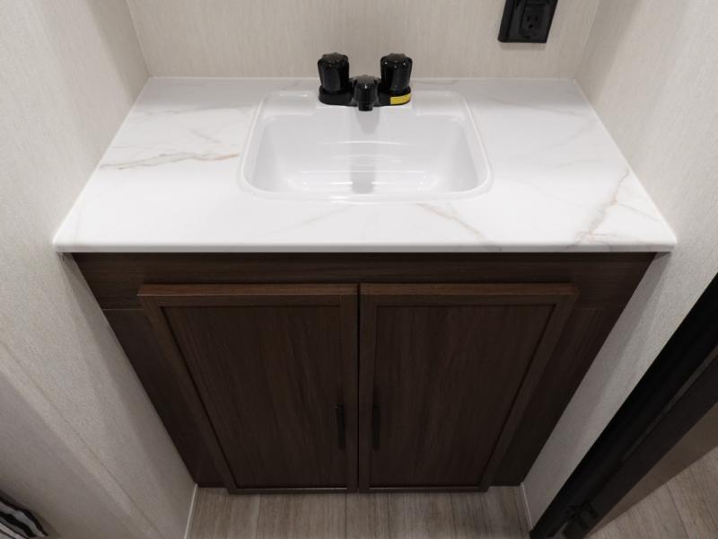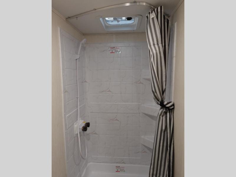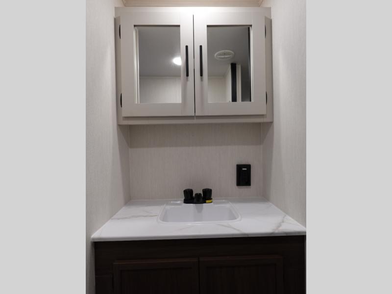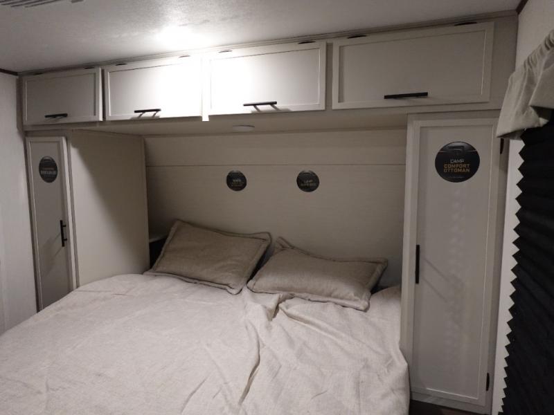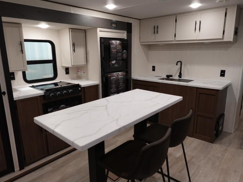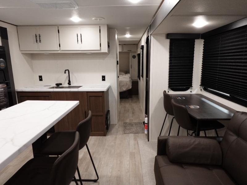 There is ample space to move about in this travel trailer thanks to the dual opposing slides! Here, you'll find an L-shaped sofa with a chaise lounge in direct view of TV and fireplace. There is also a hidden pantry behind the TV for snacks and movies! The center farm table includes four stools so you can gather around for meal times, and the desk with a chair will provide a place for you to get some work done if needed. This unit features a full bath towards the front private bedroom for easy access at night, and you're sure to get a great night's rest on the camp king bed!