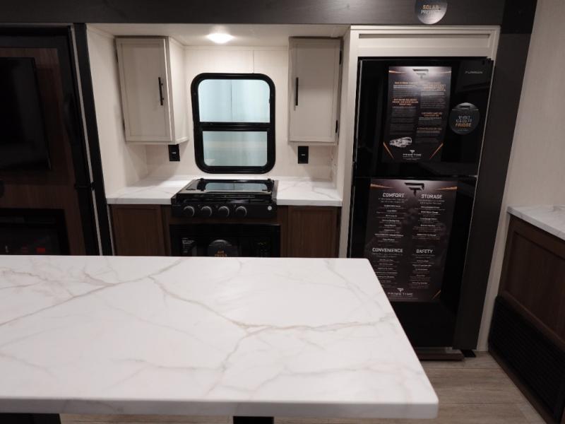 With any Avenger travel trailer by Prime Time RV, you will find innovation, a solid build, and comfort at every turn. Each model is built with Tuff Coat on the exterior metal, a fully enclosed underbelly, and a PVC roof membrane to help extend the life of your trailer. You will also find automotive name badging on the exterior, along with an exterior shower, front rail LED light strips, plus an XL padded entry grab handle to name a few conveniences. There are plenty of storage spaces inside, as well as Congoleum flooring and woven PVC marine grade slide out flooring, a designer shower surround, and seamless pressed countertops. You are sure to appreciate the onboard water filtration system, tankless water heater, plus 30K BTU furnace and 15K ducted A/C to help keep you comfortable.