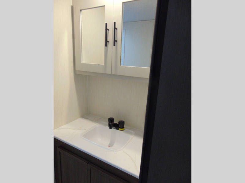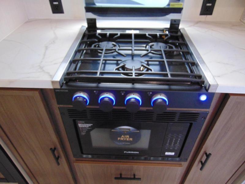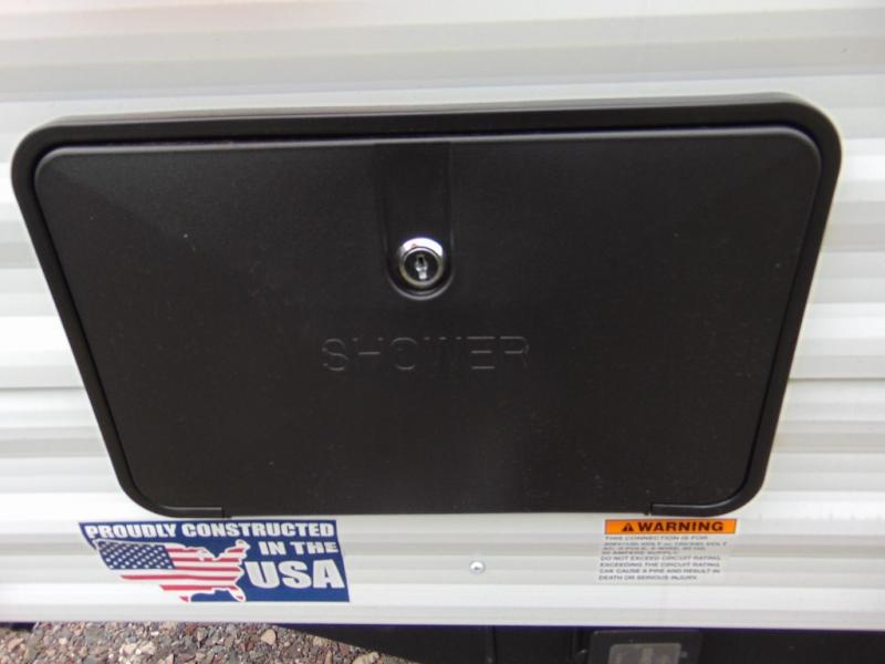 There is ample space to move about in this travel trailer thanks to the dual opposing slides! Here, you'll find an L-shaped sofa with a chaise lounge in direct view of TV and fireplace. There is also a hidden pantry behind the TV for snacks and movies! The center farm table includes four stools so you can gather around for meal times, and the desk with a chair will provide a place for you to get some work done if needed. This unit features a full bath towards the front private bedroom for easy access at night, and you're sure to get a great night's rest on the camp king bed!