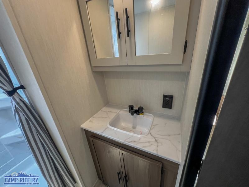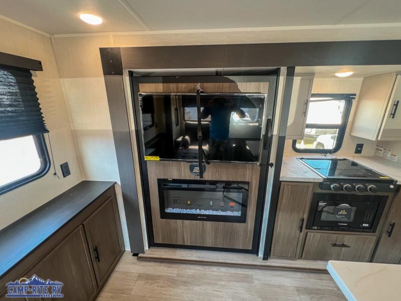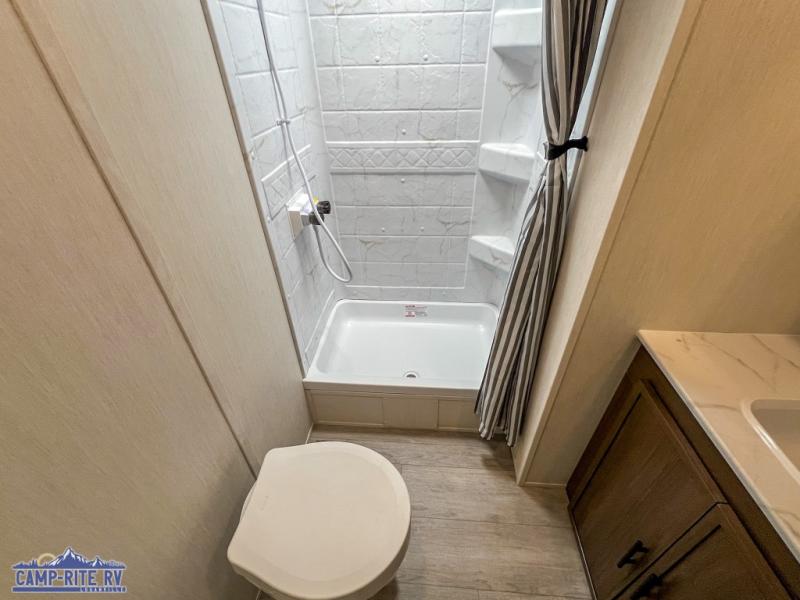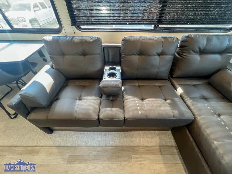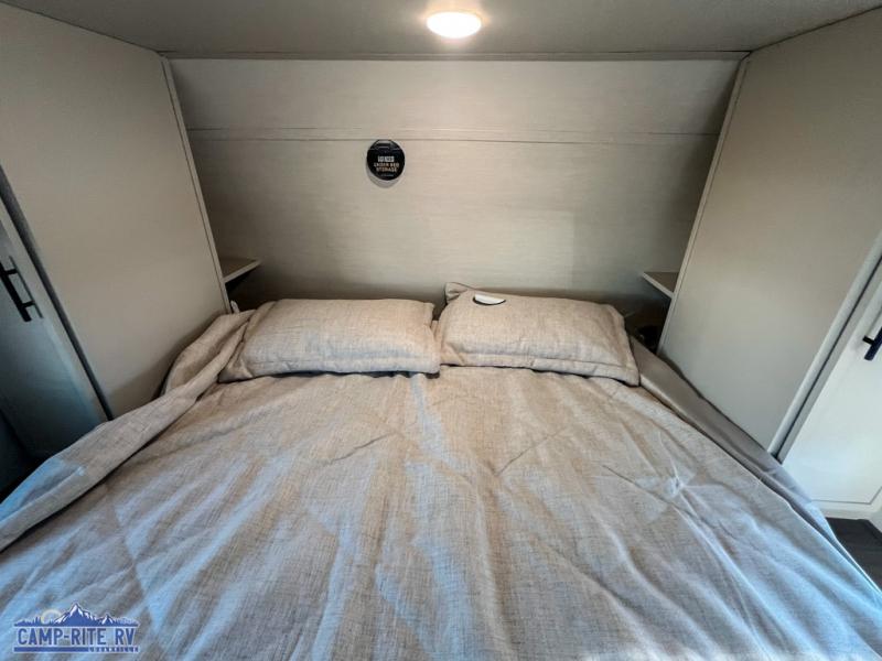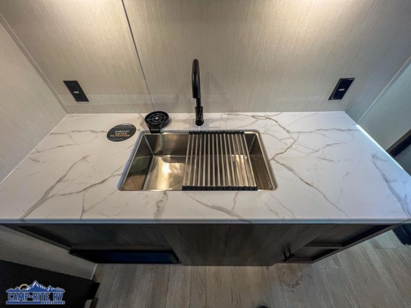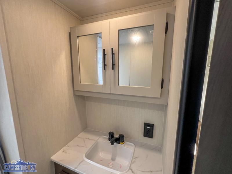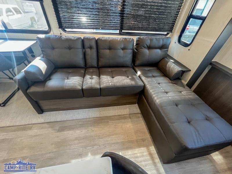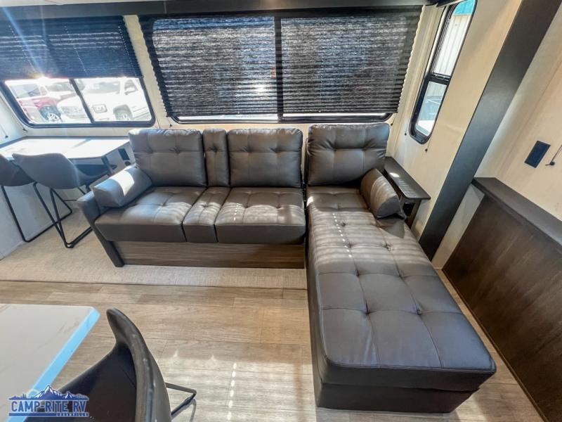 A couple or family will enjoy all the space in the main living and kitchen area, and the privacy in the front bedroom. As you spend each night sleeping on the queen-size bed in the master suite, you will appreciate the convenience of discreetly entering the full bathroom with a neo-angled shower without waking up your guests who are sleeping on the sofa or booth dinette. Because there are two opposing slides included in the central living area, there is plenty of space to prep dinner or wash dishes on the kitchen island.