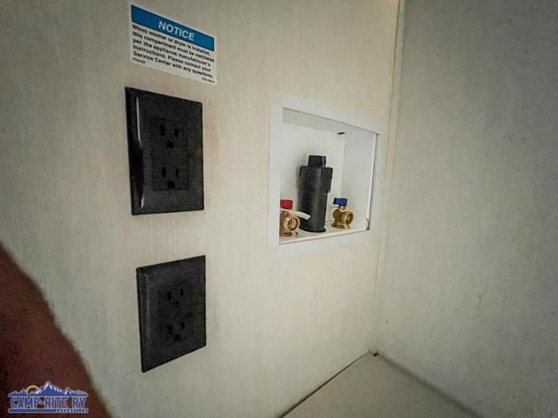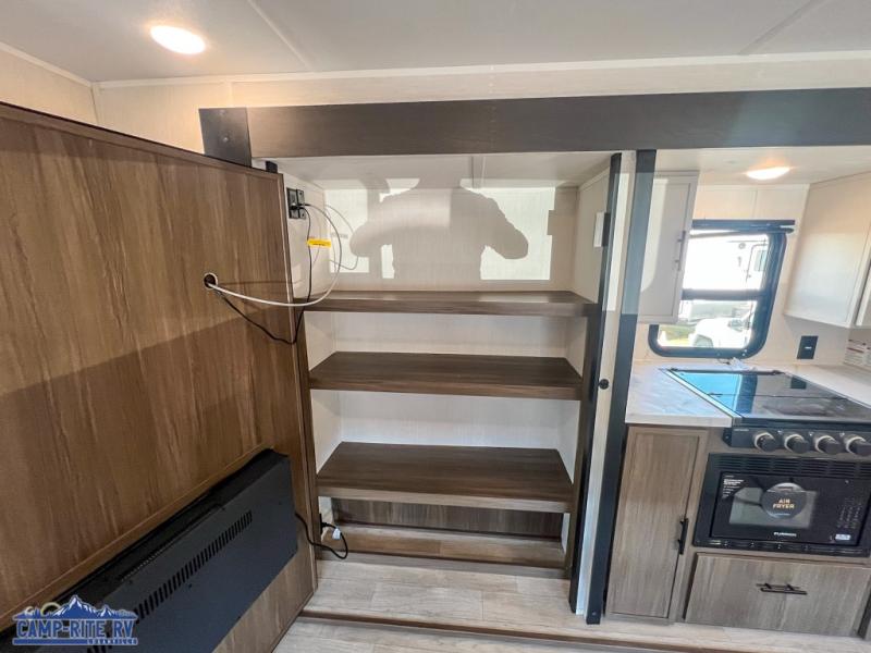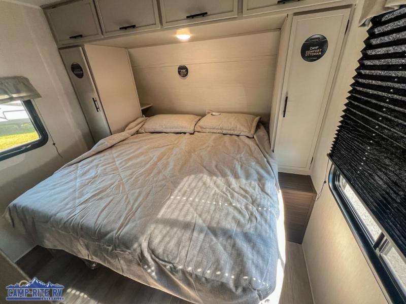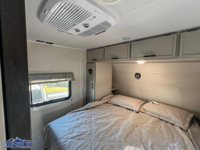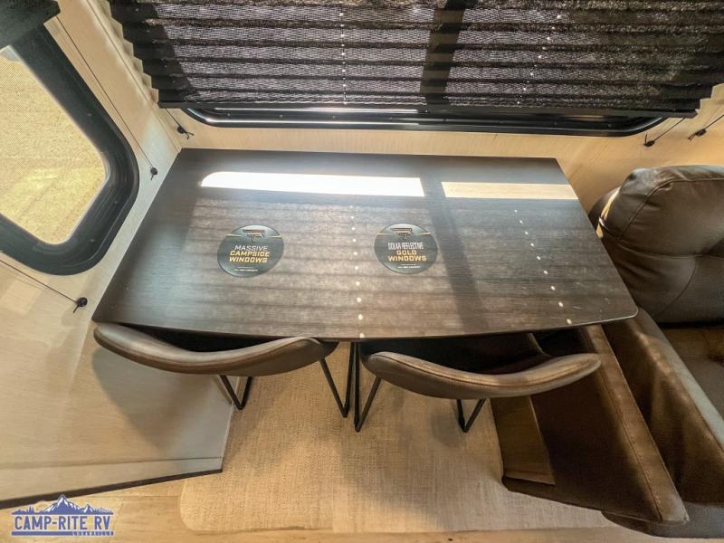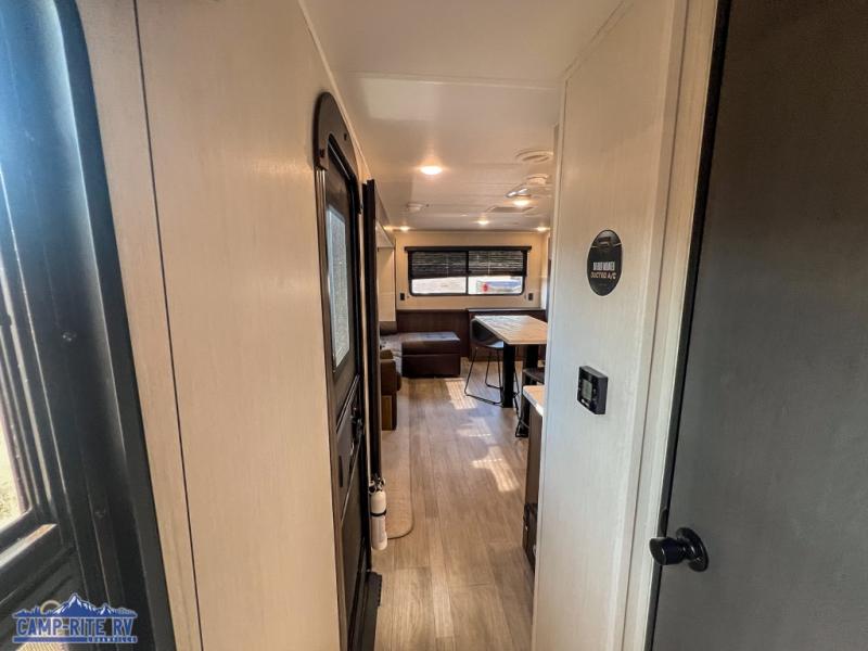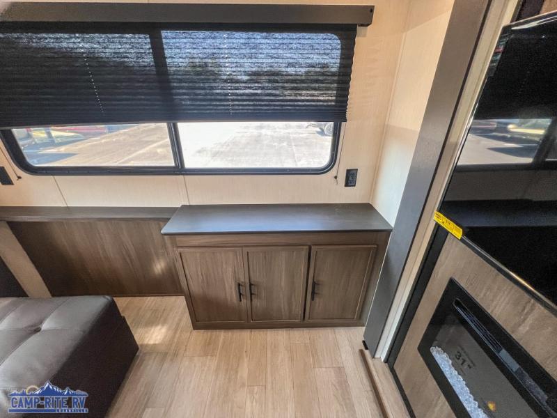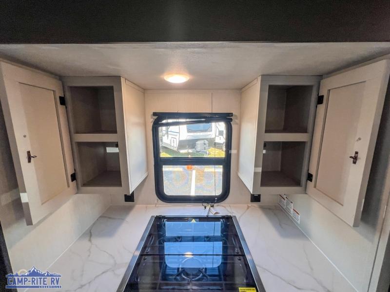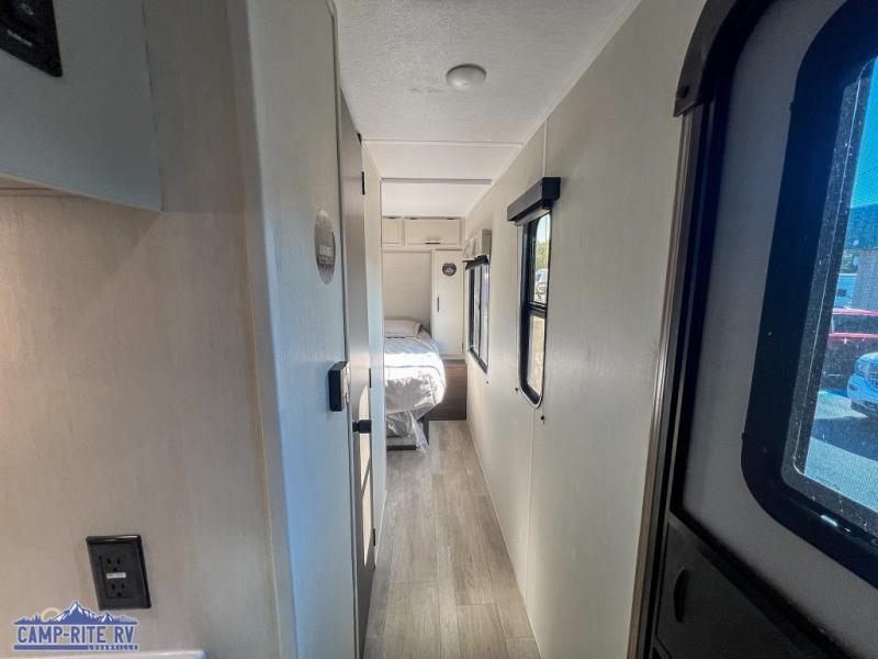 A couple or family will enjoy all the space in the main living and kitchen area, and the privacy in the front bedroom. As you spend each night sleeping on the queen-size bed in the master suite, you will appreciate the convenience of discreetly entering the full bathroom with a neo-angled shower without waking up your guests who are sleeping on the sofa or booth dinette. Because there are two opposing slides included in the central living area, there is plenty of space to prep dinner or wash dishes on the kitchen island.