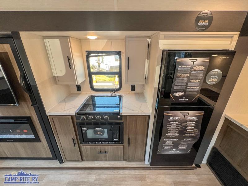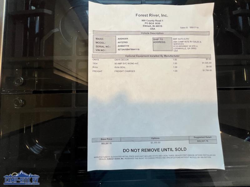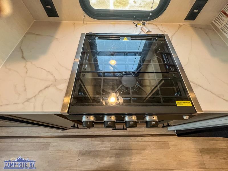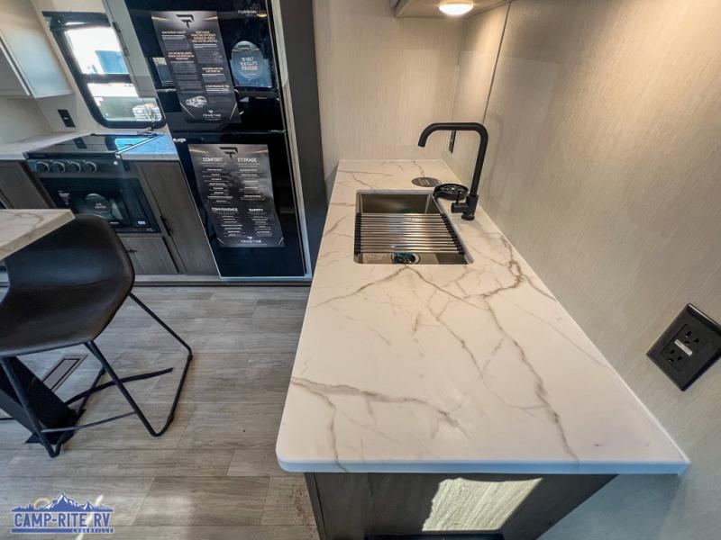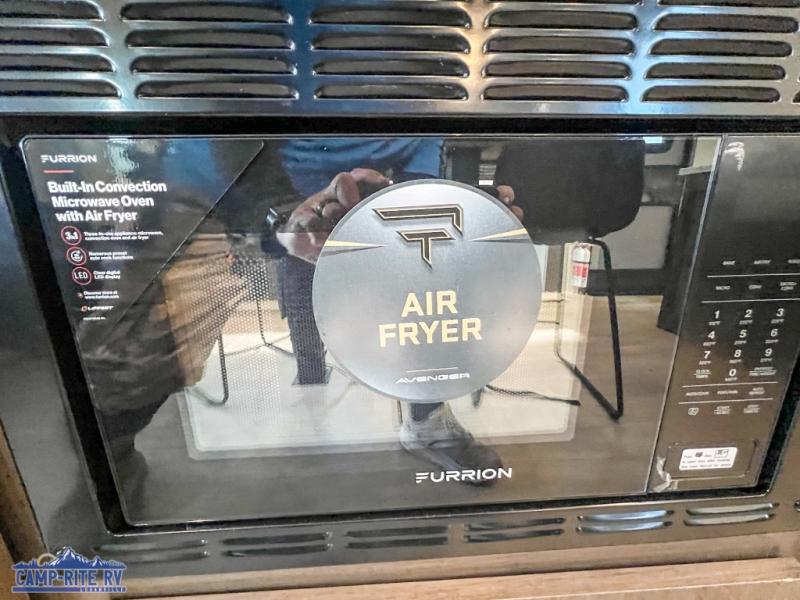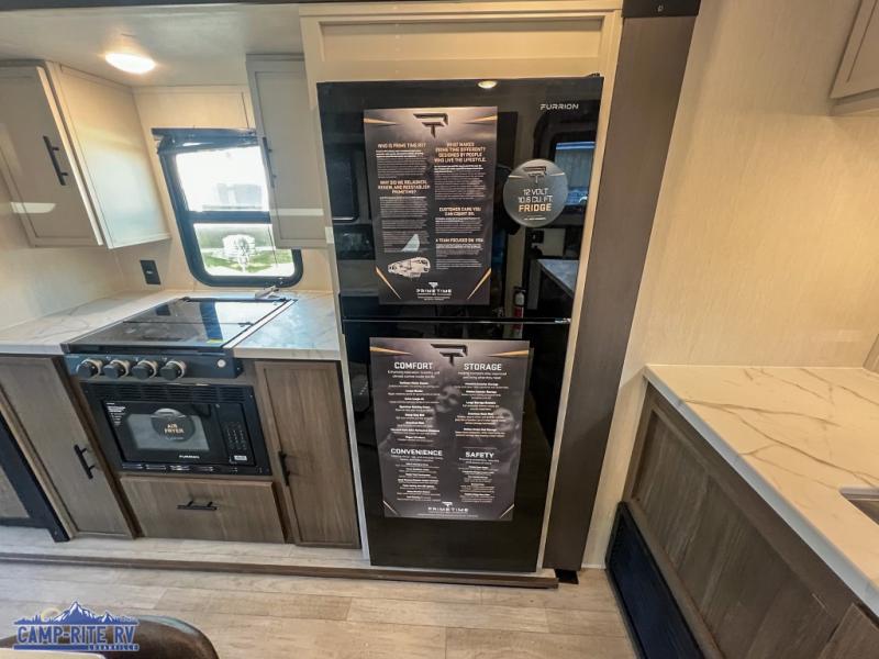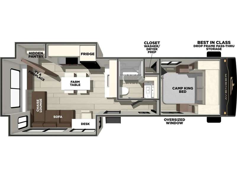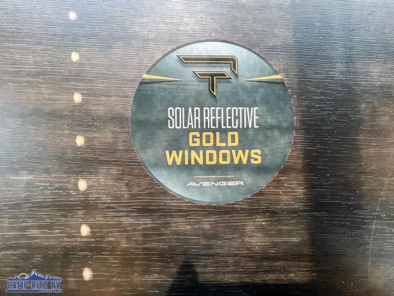 With any Avenger travel trailer by Prime Time, the exterior includes an aerodynamic smooth front metal, a diamond plate front rock guard for protection on the road, and four stabilizer jacks to keep your unit secure. There is a fully walkable roof plus an enclosed and heated underbelly that will help extend your camping season. The interior offers a 15,000 BTU air conditioner for the perfect climate inside, in-floor ducted heat, a systems monitor panel, and a Winegard 360+ antenna with Wi-Fi prep that will give you the option to stay connected as you camp. Each model also includes seamless Carefree Congoleum flooring, kitchen backsplash, shower pans in all models, and pleated nightshades throughout to name a few interior comforts!