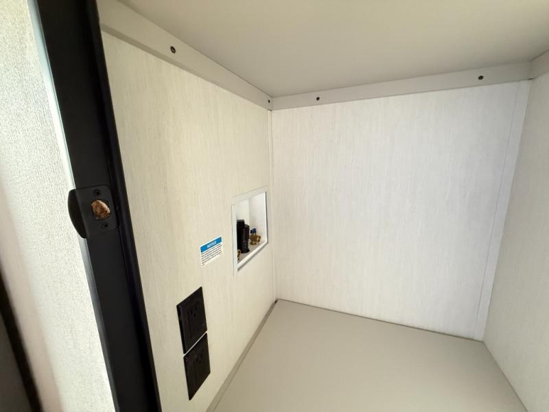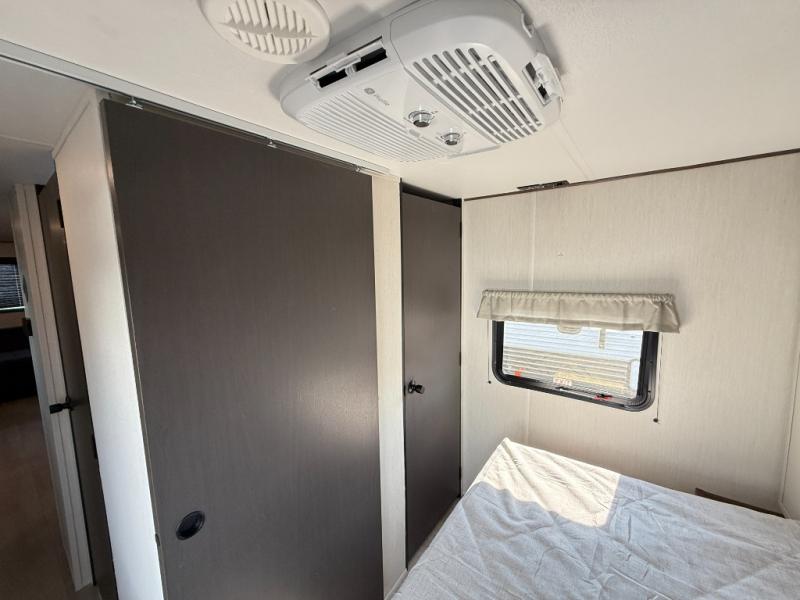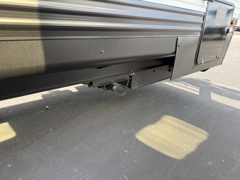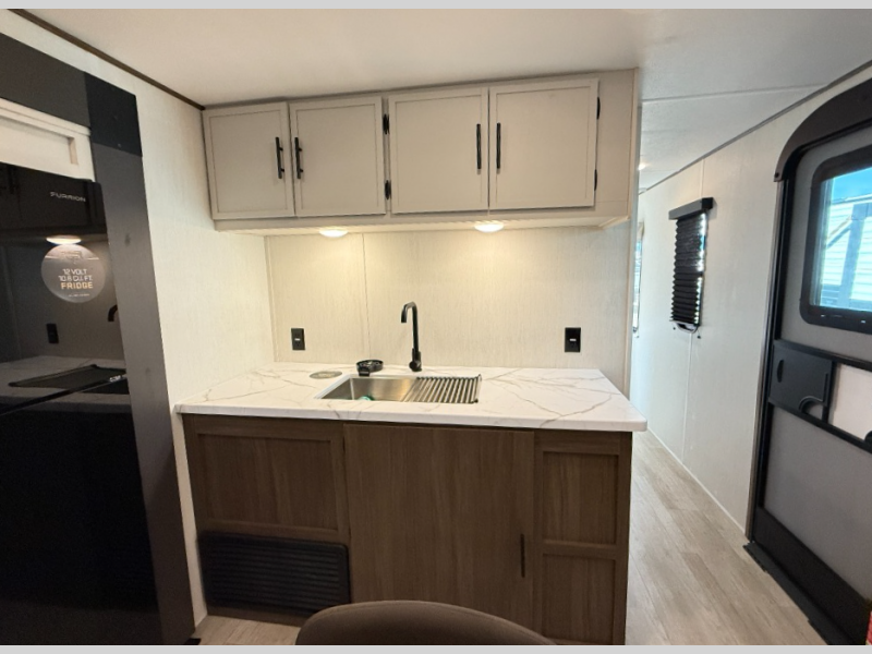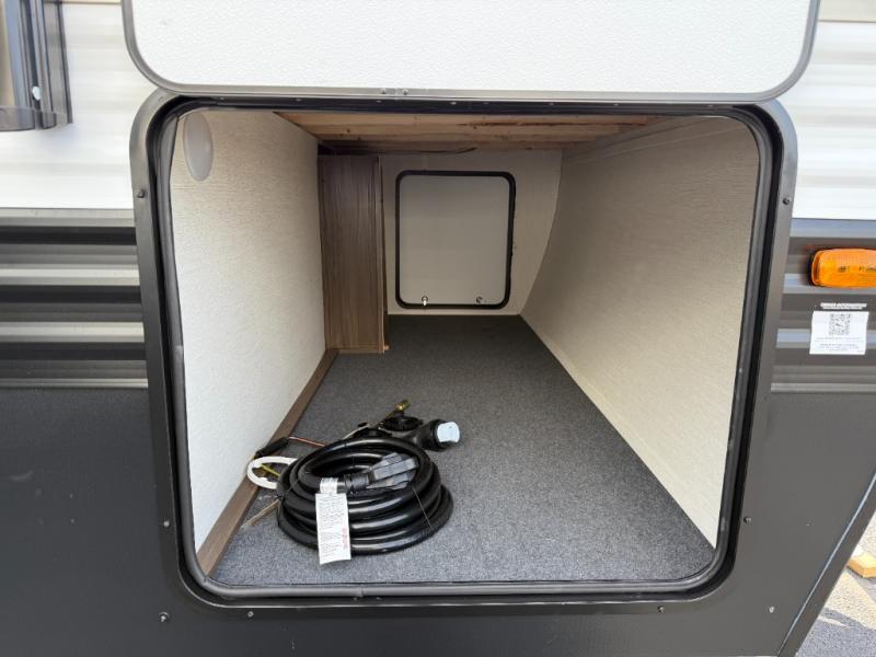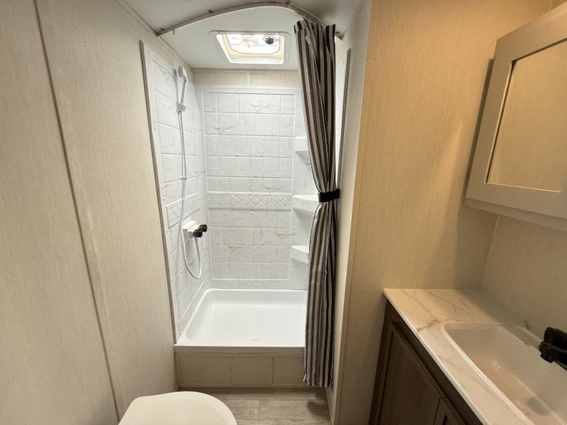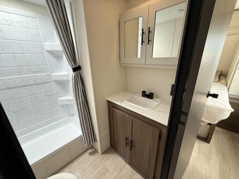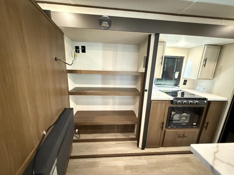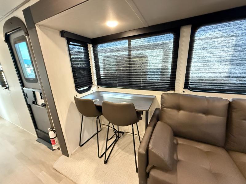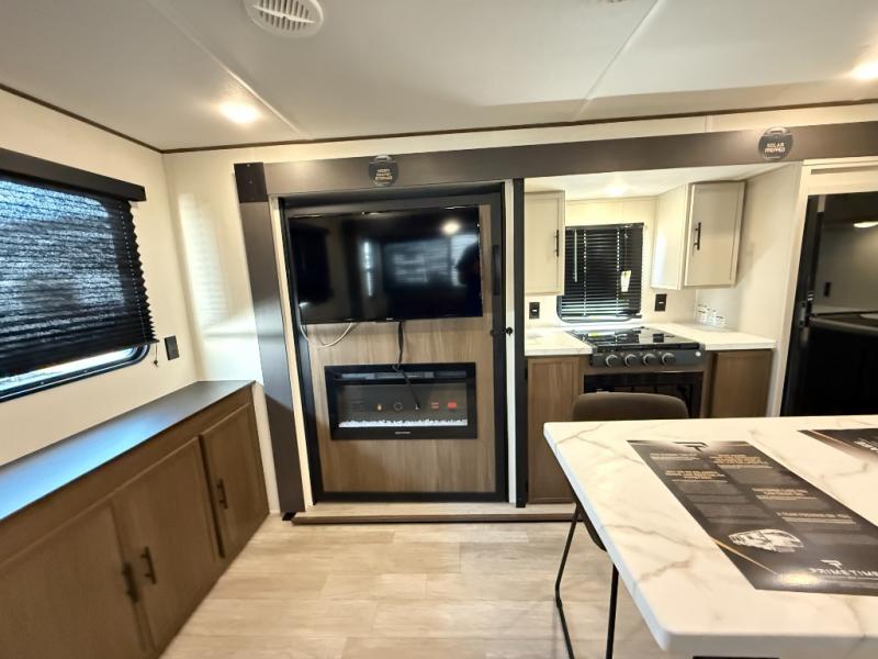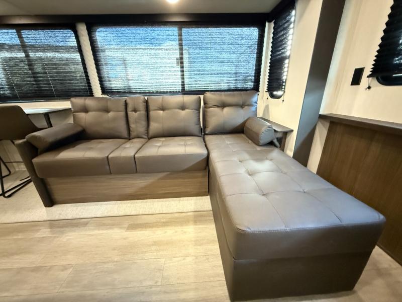 There is ample space to move about in this travel trailer thanks to the dual opposing slides! Here, you'll find an L-shaped sofa with a chaise lounge in direct view of TV and fireplace. There is also a hidden pantry behind the TV for snacks and movies! The center farm table includes four stools so you can gather around for meal times, and the desk with a chair will provide a place for you to get some work done if needed. This unit features a full bath towards the front private bedroom for easy access at night, and you're sure to get a great night's rest on the camp king bed!