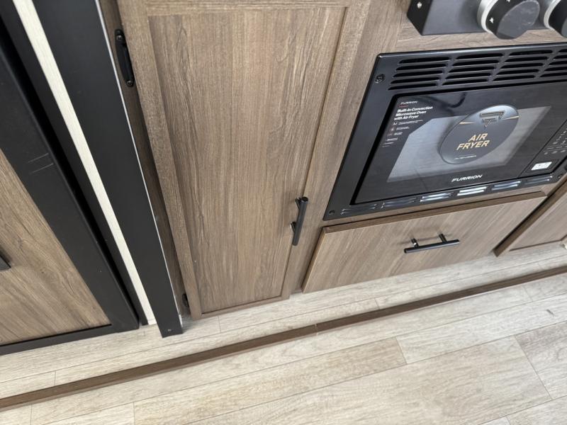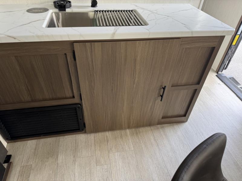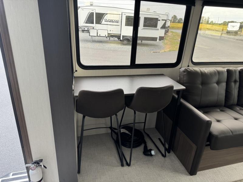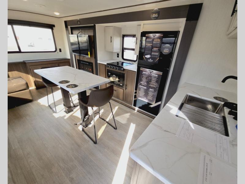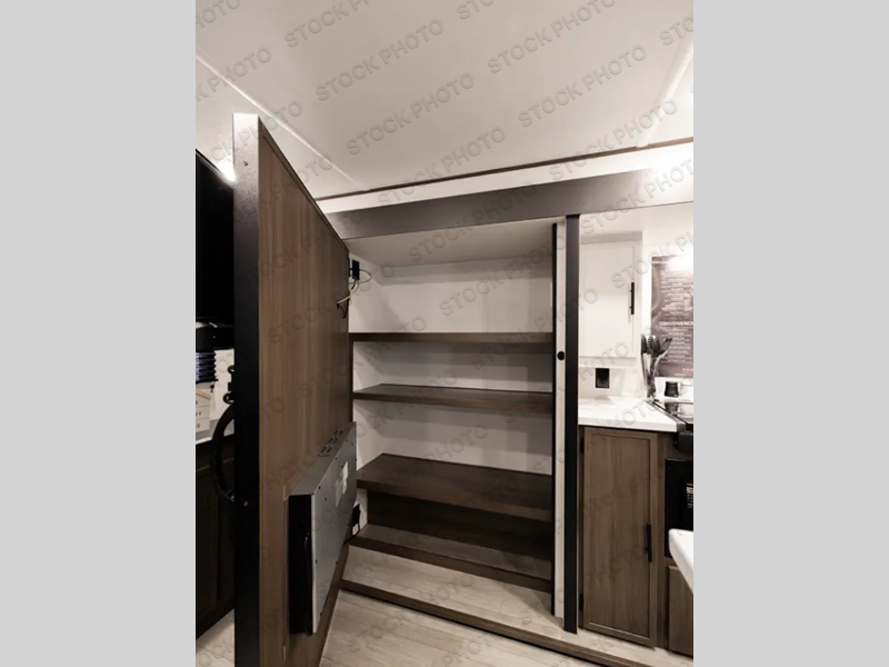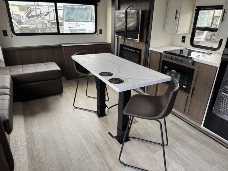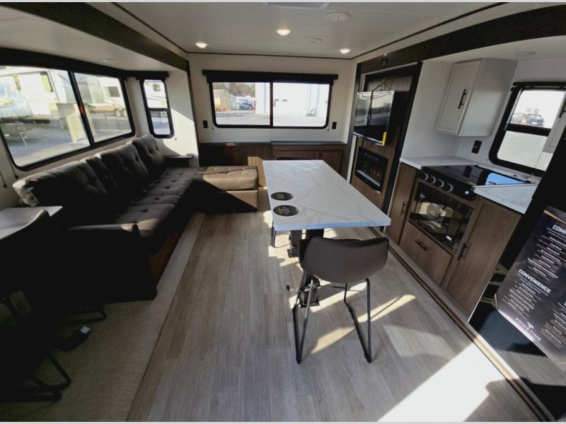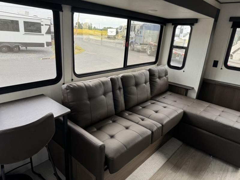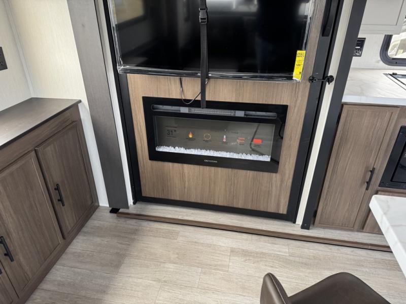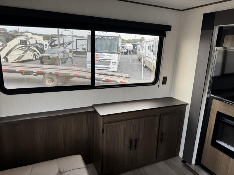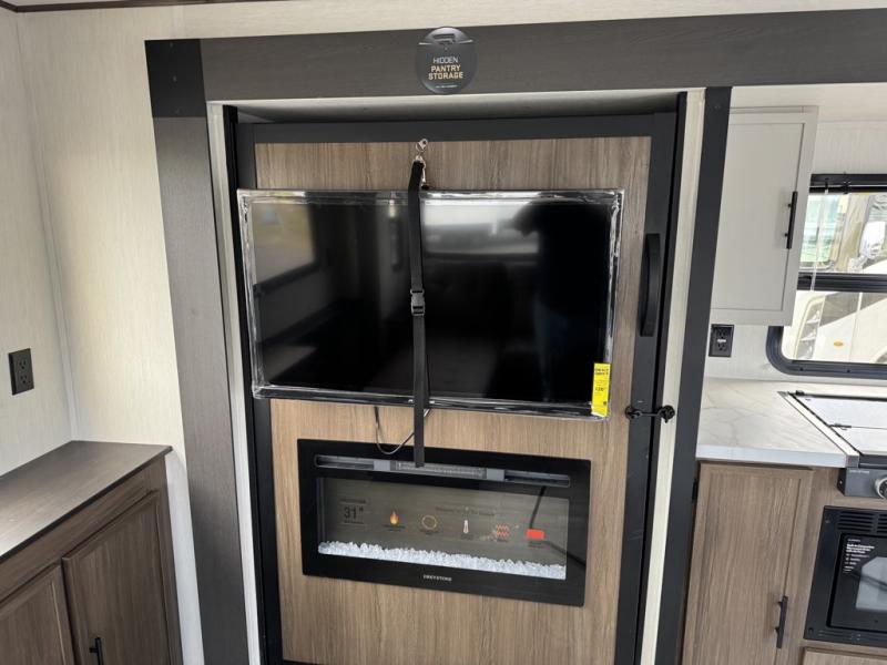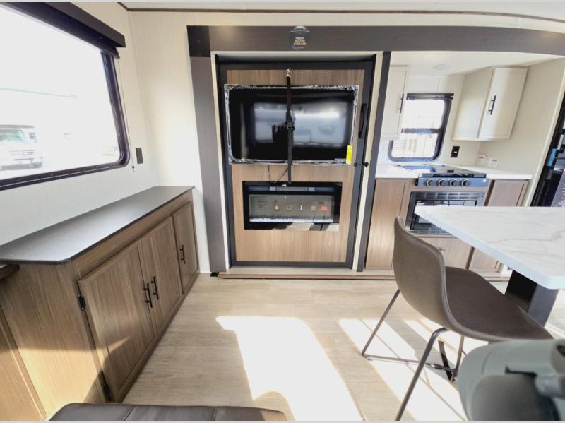 There is ample space to move about in this travel trailer thanks to the dual opposing slides! Here, you'll find an L-shaped sofa with a chaise lounge in direct view of TV and fireplace. There is also a hidden pantry behind the TV for snacks and movies! The center farm table includes four stools so you can gather around for meal times, and the desk with a chair will provide a place for you to get some work done if needed. This unit features a full bath towards the front private bedroom for easy access at night, and you're sure to get a great night's rest on the camp king bed!