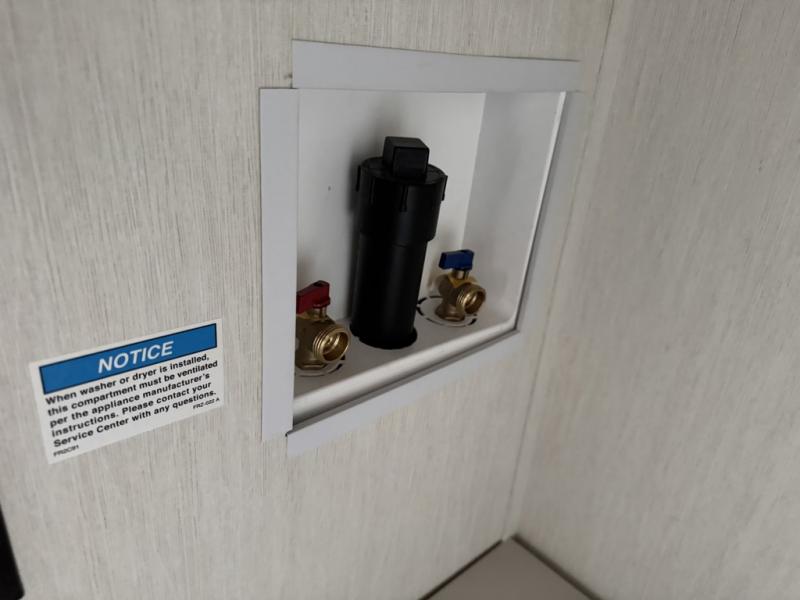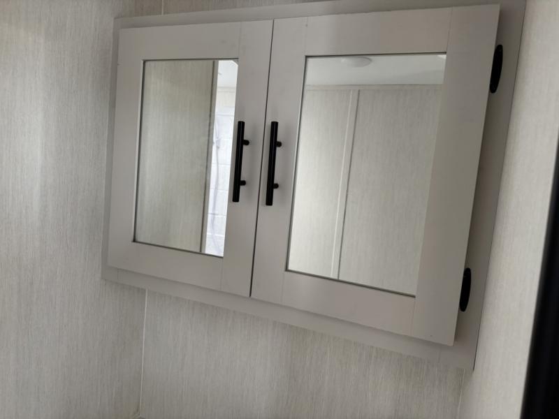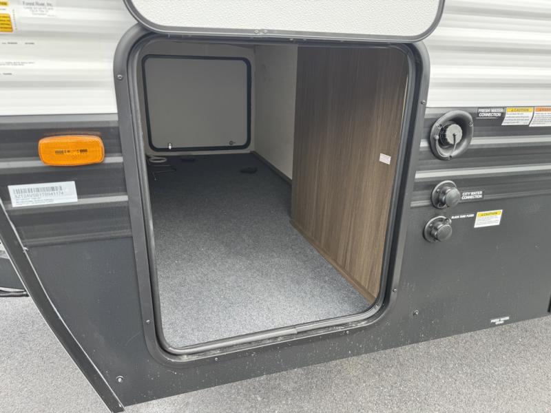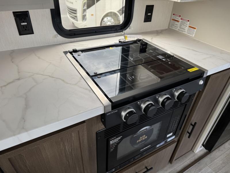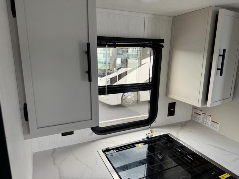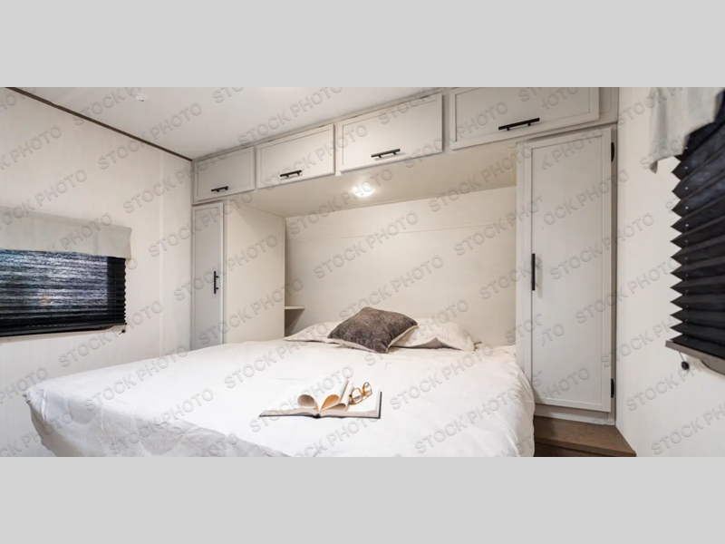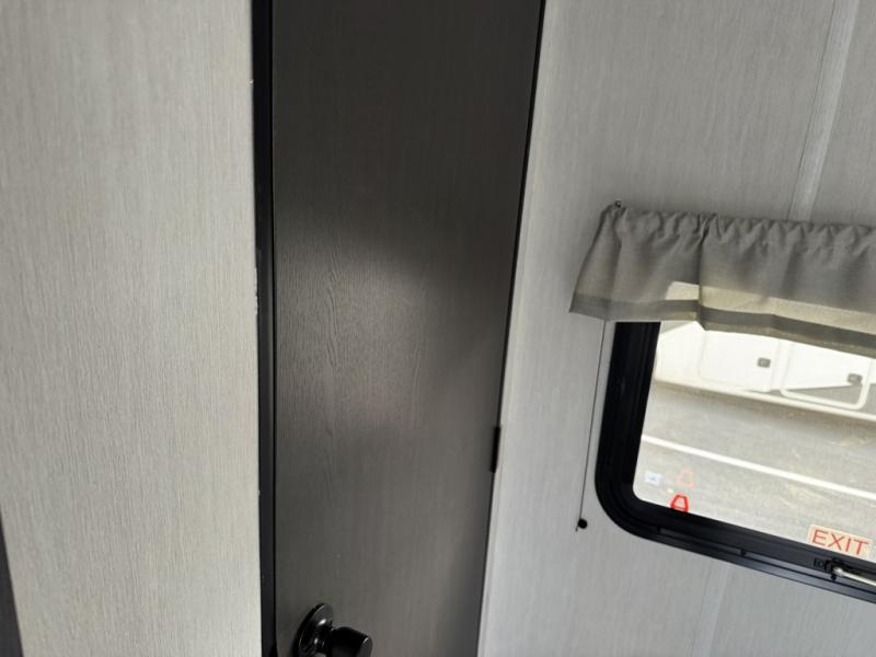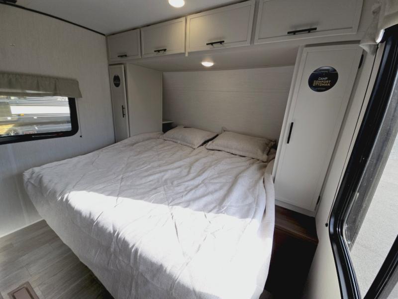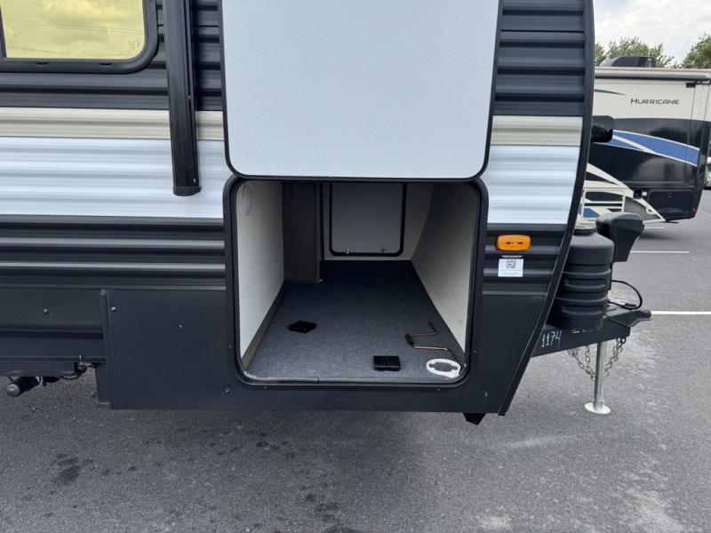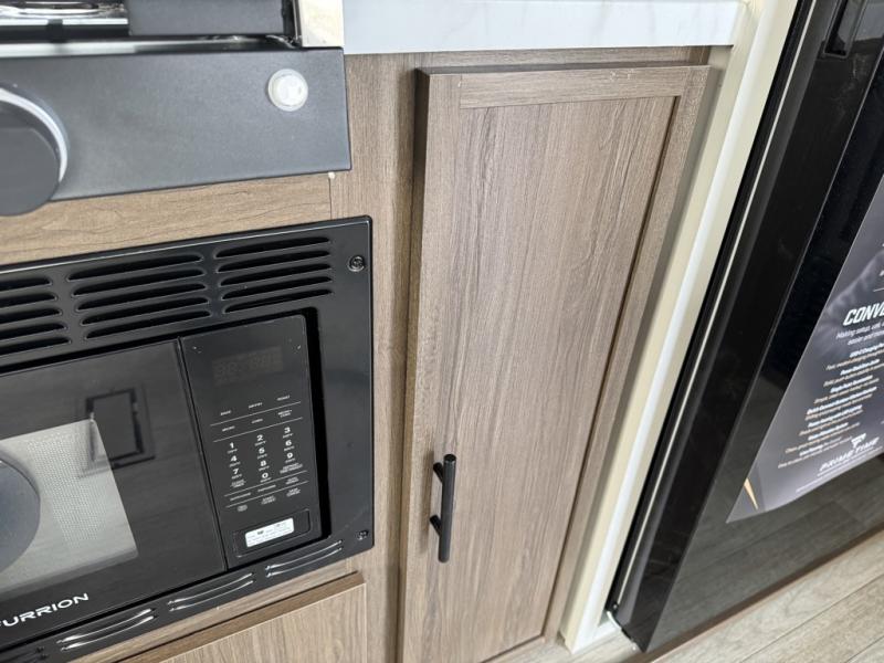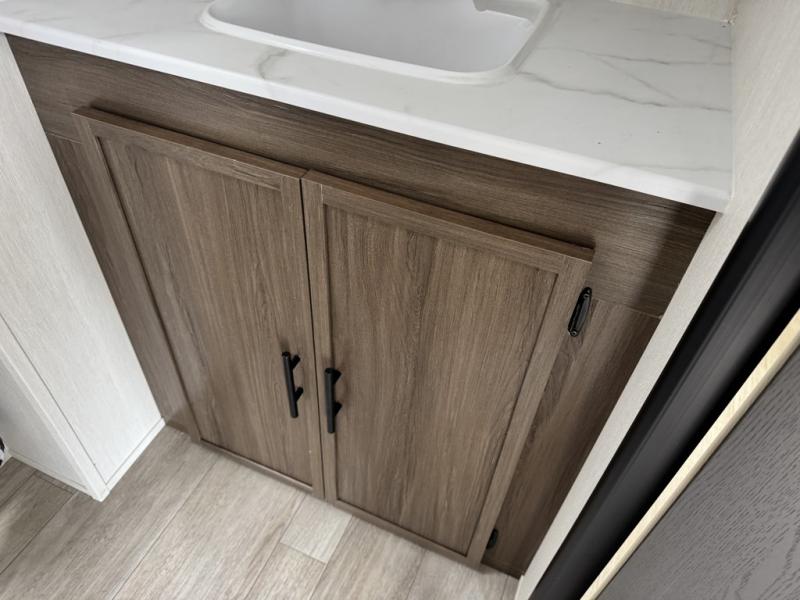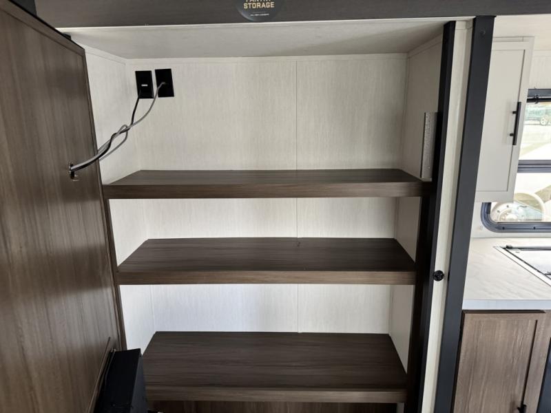 There is ample space to move about in this travel trailer thanks to the dual opposing slides! Here, you'll find an L-shaped sofa with a chaise lounge in direct view of TV and fireplace. There is also a hidden pantry behind the TV for snacks and movies! The center farm table includes four stools so you can gather around for meal times, and the desk with a chair will provide a place for you to get some work done if needed. This unit features a full bath towards the front private bedroom for easy access at night, and you're sure to get a great night's rest on the camp king bed!