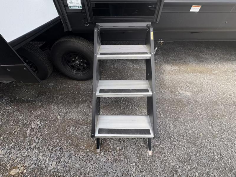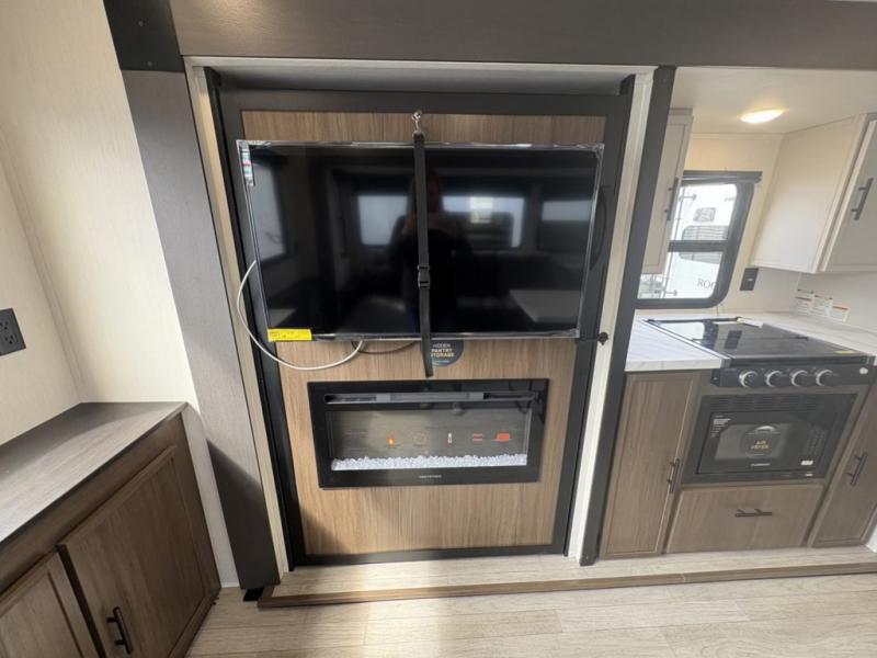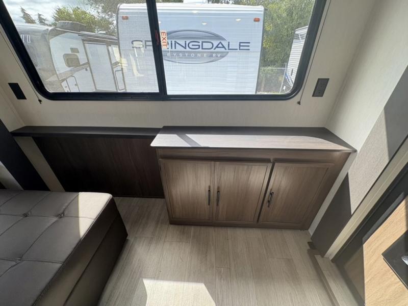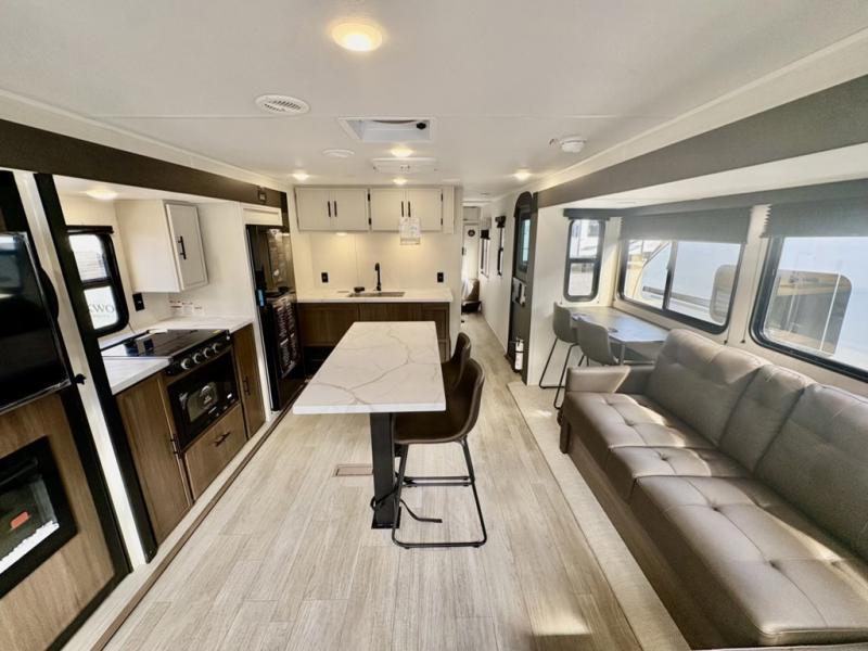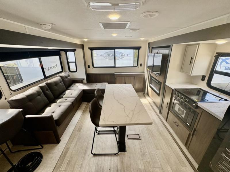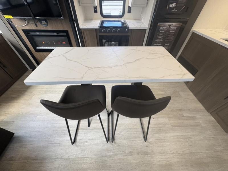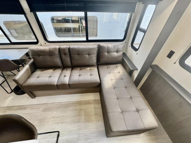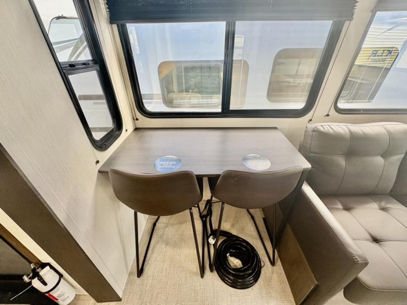 There is ample space to move about in this travel trailer thanks to the dual opposing slides! Here, you'll find an L-shaped sofa with a chaise lounge in direct view of TV and fireplace. There is also a hidden pantry behind the TV for snacks and movies! The center farm table includes four stools so you can gather around for meal times, and the desk with a chair will provide a place for you to get some work done if needed. This unit features a full bath towards the front private bedroom for easy access at night, and you're sure to get a great night's rest on the camp king bed!