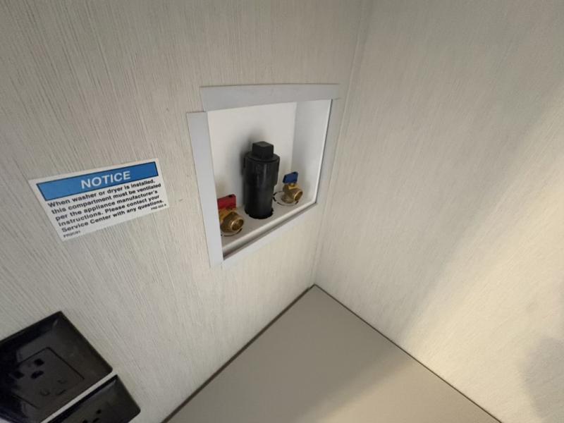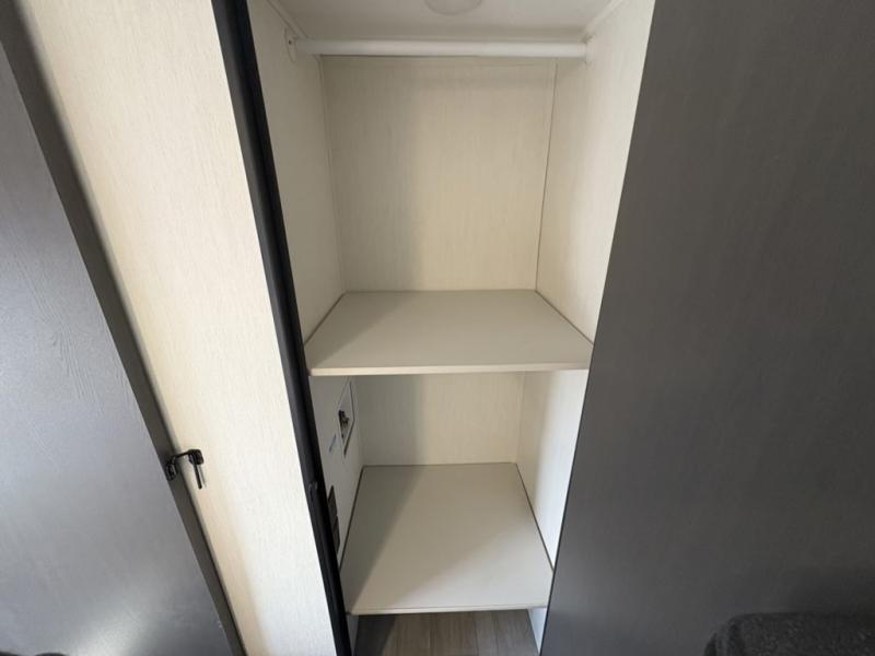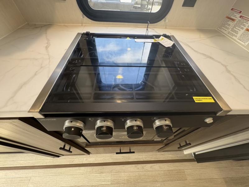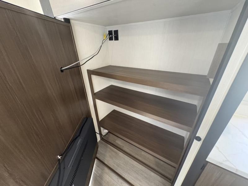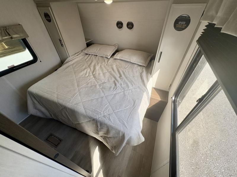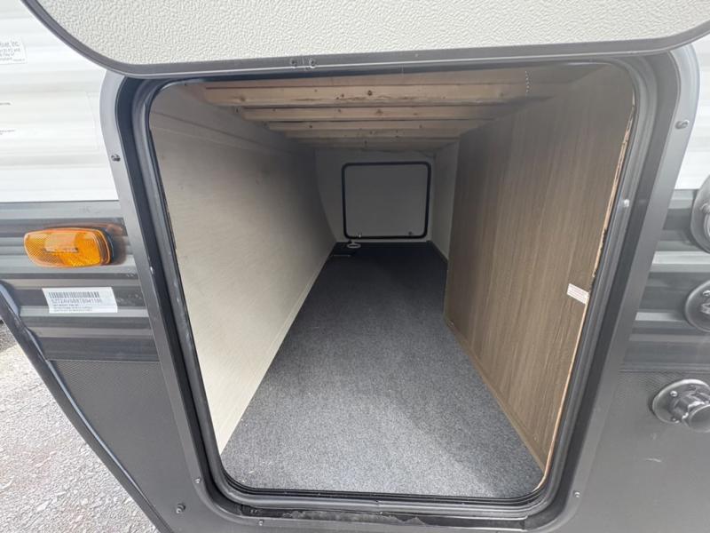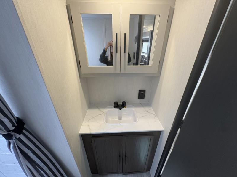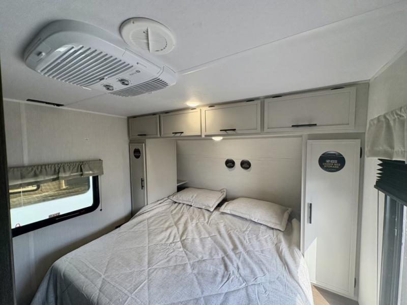 There is ample space to move about in this travel trailer thanks to the dual opposing slides! Here, you'll find an L-shaped sofa with a chaise lounge in direct view of TV and fireplace. There is also a hidden pantry behind the TV for snacks and movies! The center farm table includes four stools so you can gather around for meal times, and the desk with a chair will provide a place for you to get some work done if needed. This unit features a full bath towards the front private bedroom for easy access at night, and you're sure to get a great night's rest on the camp king bed!