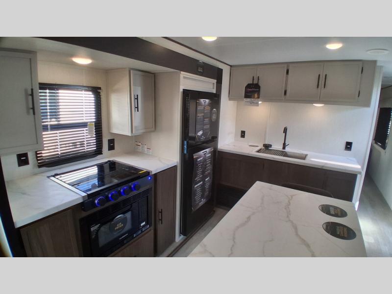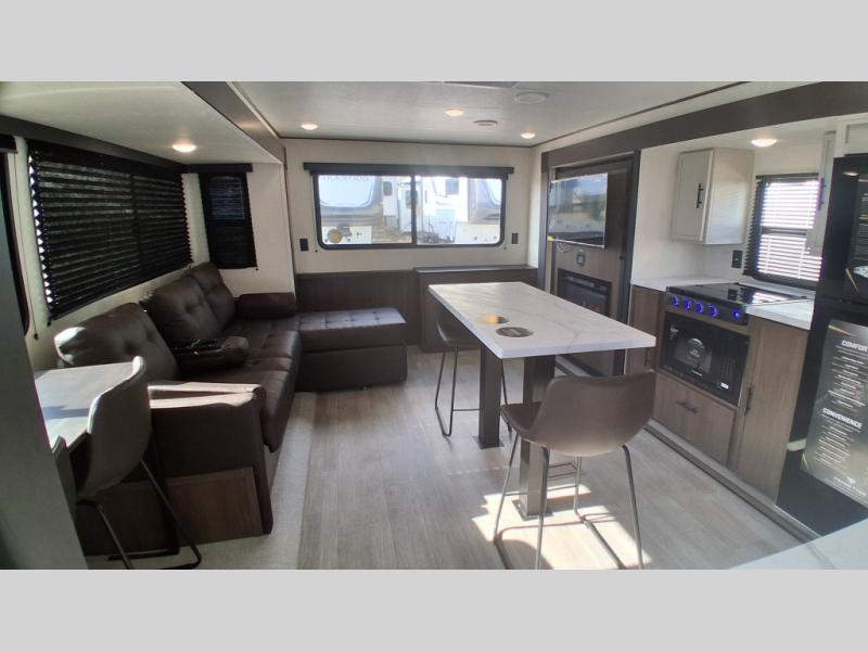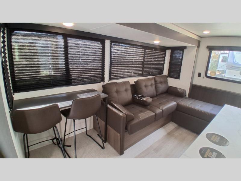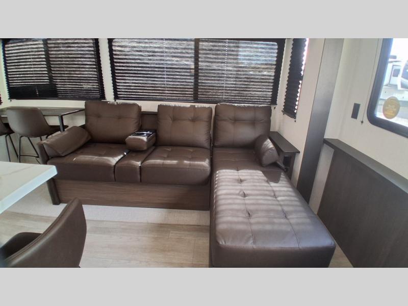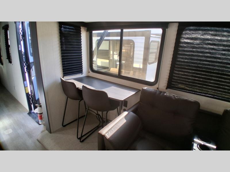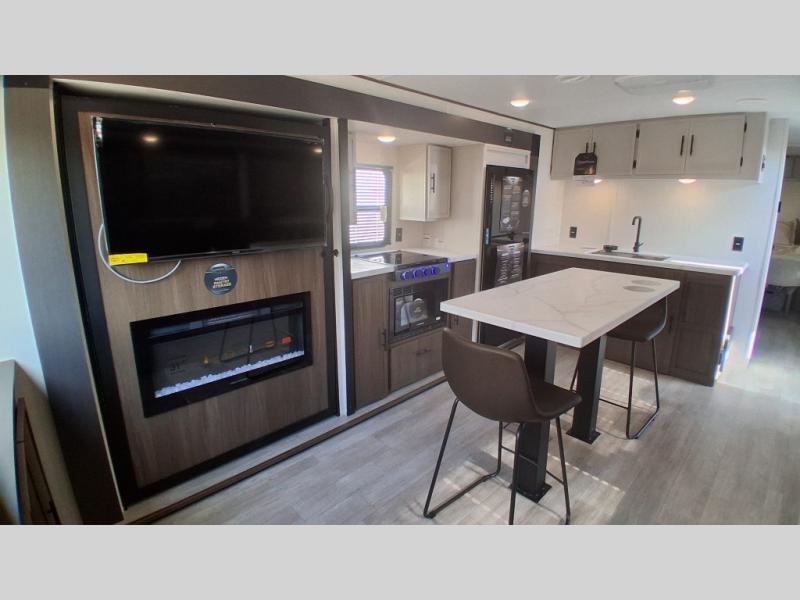 There is ample space to move about in this travel trailer thanks to the dual opposing slides! Here, you'll find an L-shaped sofa with a chaise lounge in direct view of TV and fireplace. There is also a hidden pantry behind the TV for snacks and movies! The center farm table includes four stools so you can gather around for meal times, and the desk with a chair will provide a place for you to get some work done if needed. This unit features a full bath towards the front private bedroom for easy access at night, and you're sure to get a great night's rest on the camp king bed!