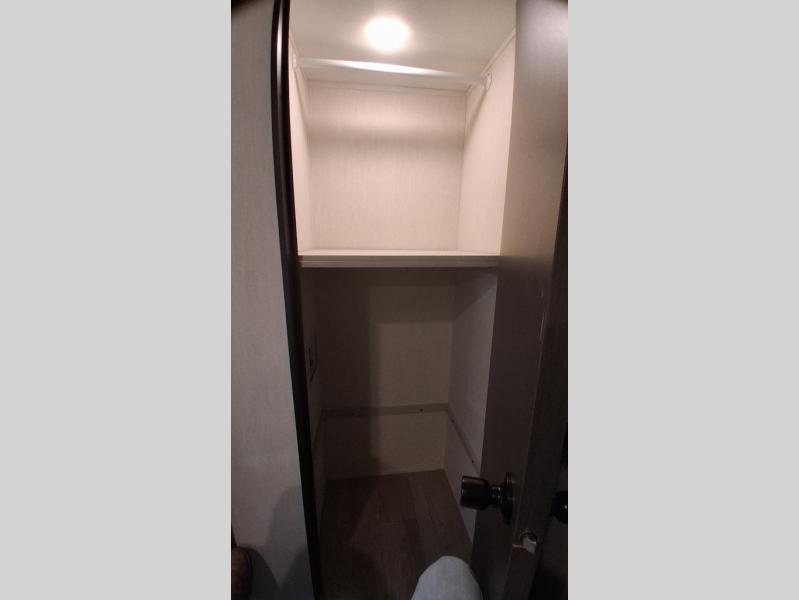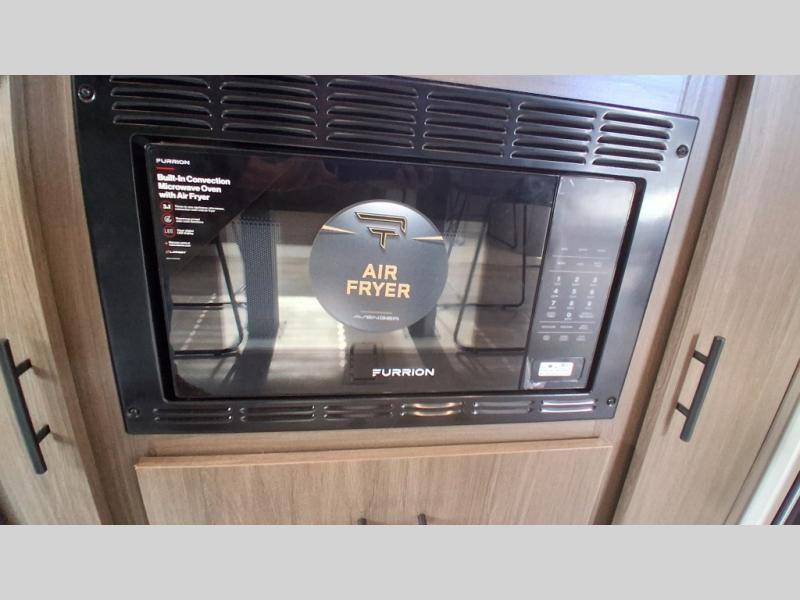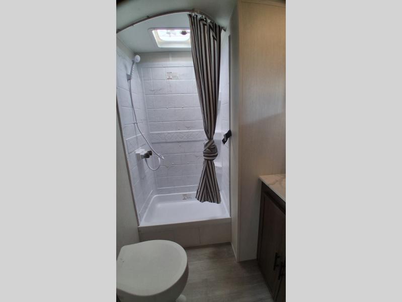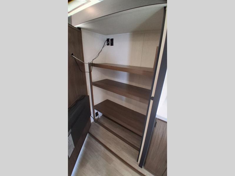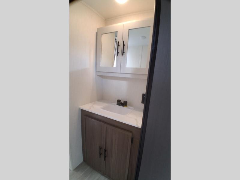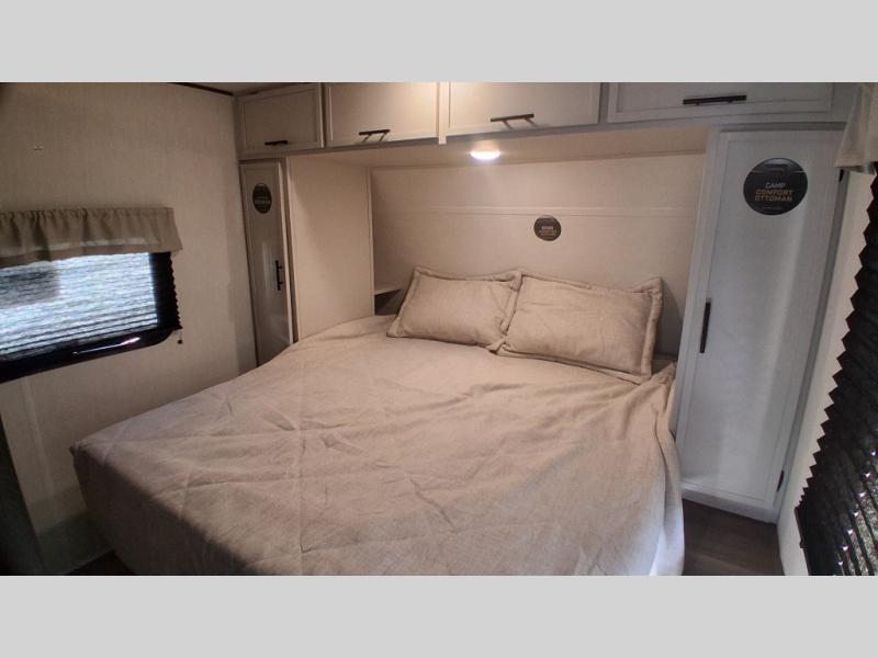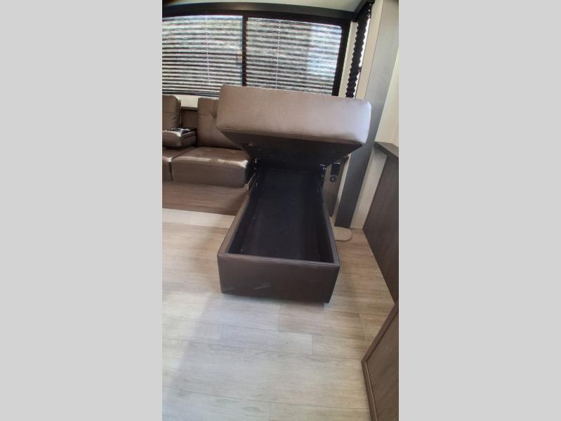 There is ample space to move about in this travel trailer thanks to the dual opposing slides! Here, you'll find an L-shaped sofa with a chaise lounge in direct view of TV and fireplace. There is also a hidden pantry behind the TV for snacks and movies! The center farm table includes four stools so you can gather around for meal times, and the desk with a chair will provide a place for you to get some work done if needed. This unit features a full bath towards the front private bedroom for easy access at night, and you're sure to get a great night's rest on the camp king bed!